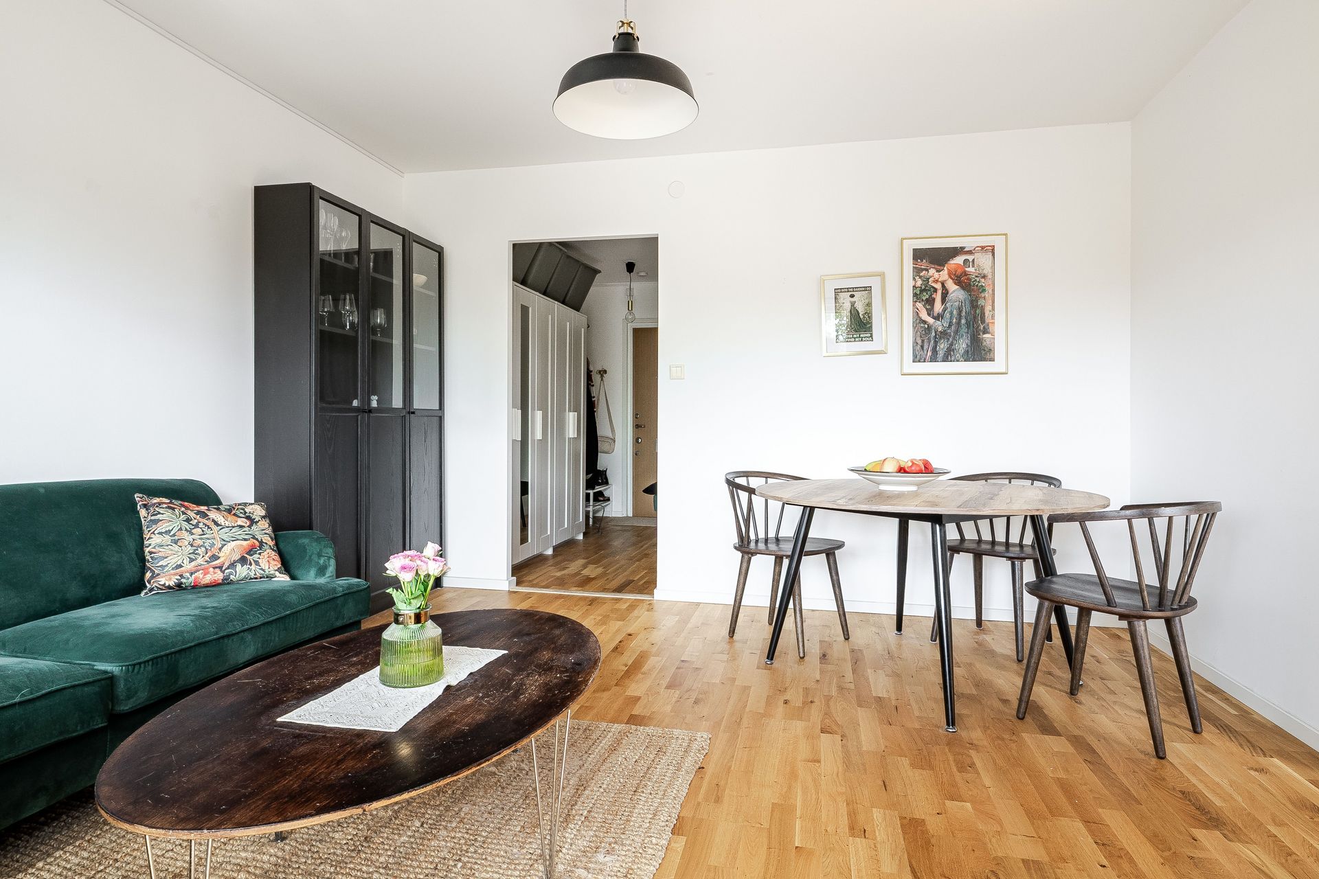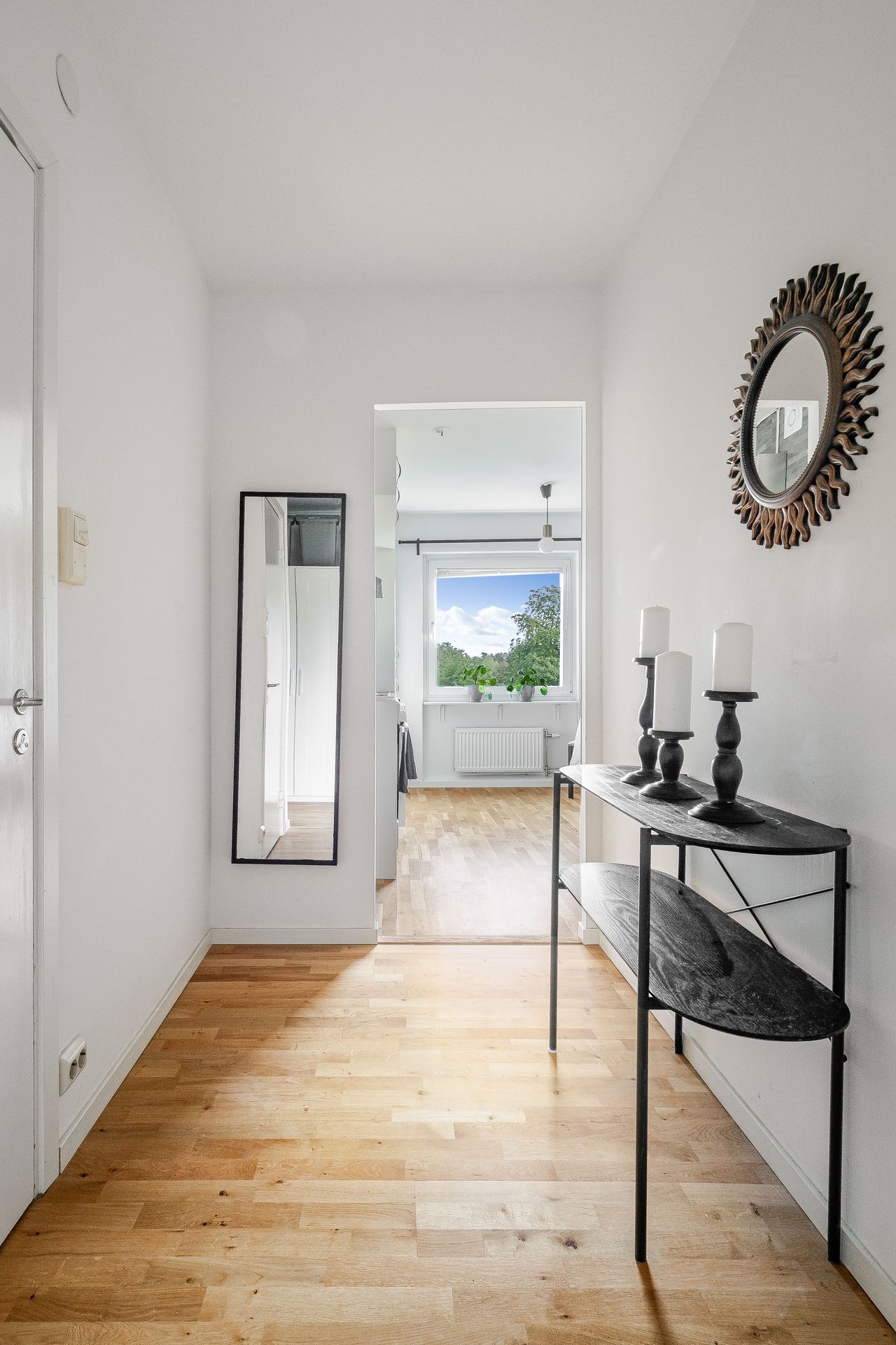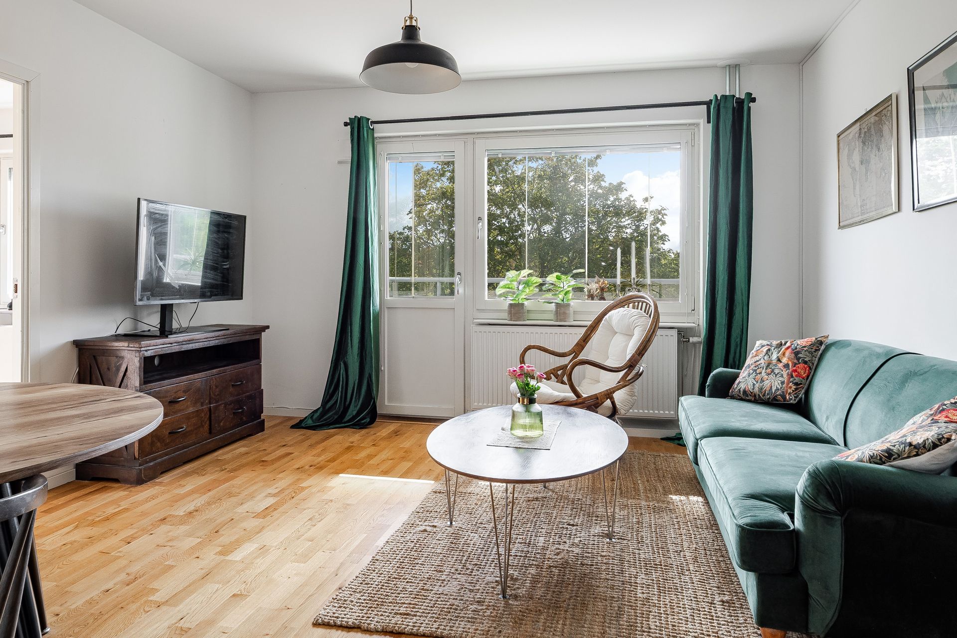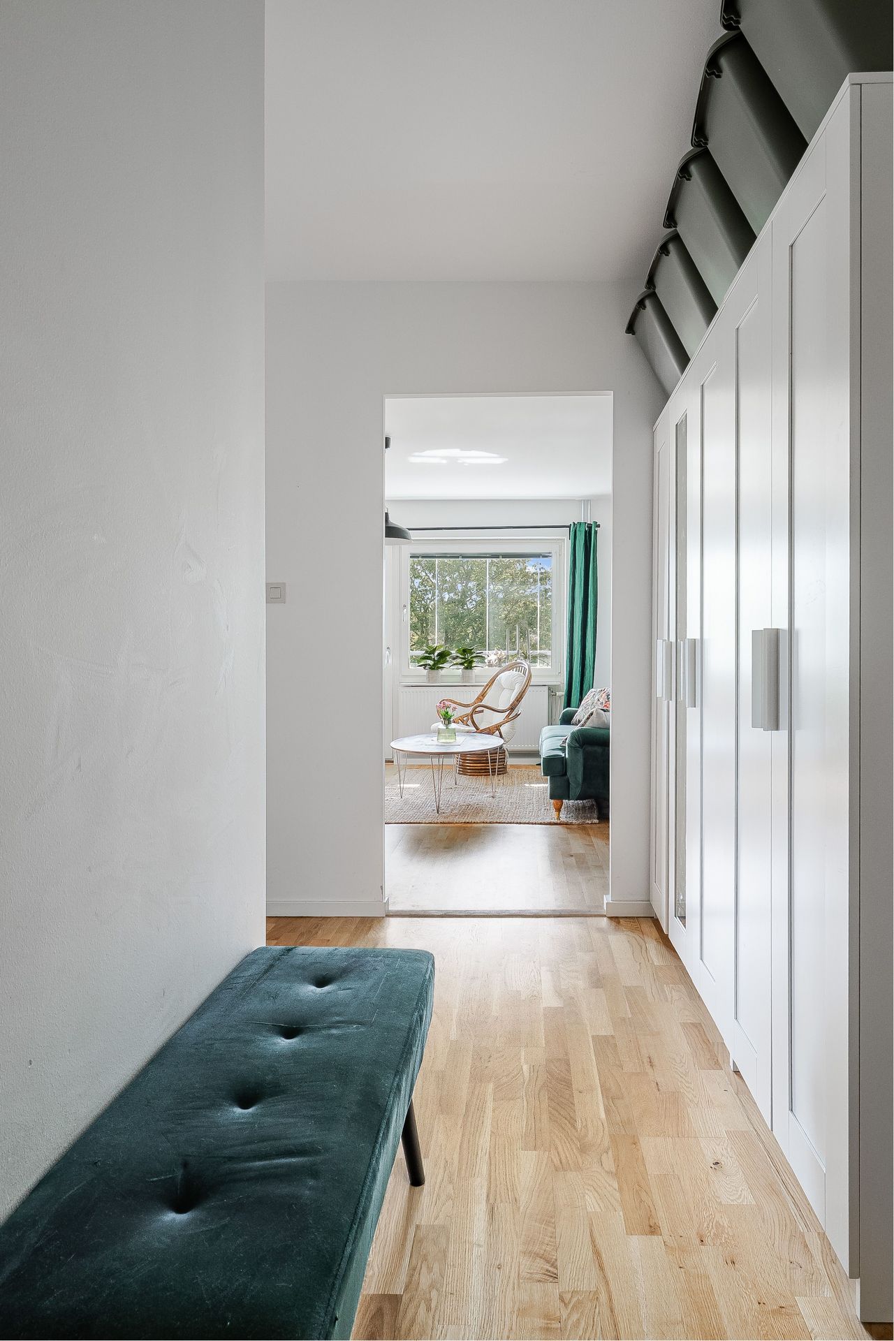 HALL Rymlig och ljus hall med bra avhängningsmöjligheter och tre garderober i anslutning. Ekparkett och vitmålade väggar. KÖK Ljust och fräscht kök med plats för matbord vid fönster. Köket går i ljusa snickerier, laminatbänkskiva och ljusgrått kakel ovan diskbänk. Köket är erbjuder gott om förvaring. Köket är utrustat med spis med häll, spisfläkt, diskmaskin samt kombinerad kyl & frys. Ekparkett, vitmålade väggar och fondtapet. VARDAGSRUM Det öppna och rymliga vardagsrummet erbjuder plats för både soffgrupp samt separat matdel. Utgång till inglasad balkong i söderläge. Ekparkett och vitmålade väggar. SOVRUM Ekparkett, vitmålade väggar och två garderober. BADRUM Fräscht och stambytt badrum med ljusgrå plastmatta och vitkaklade väggar. Badrummet är utrustad med wc, tvättställ, spegelskåp, vattenburen handdukstork, duschhörna och tvättmaskin. BALKONG Stor och härligt inglasad balkong i söderläge med utsikt över lummig innergård.