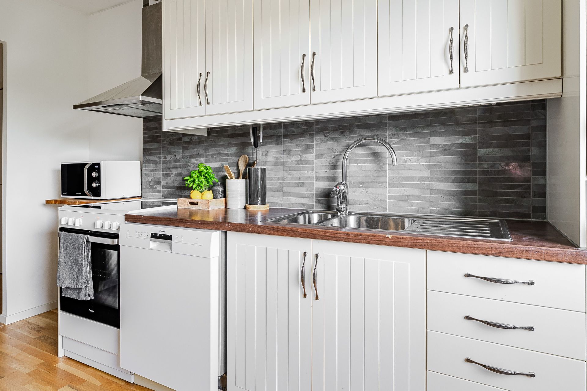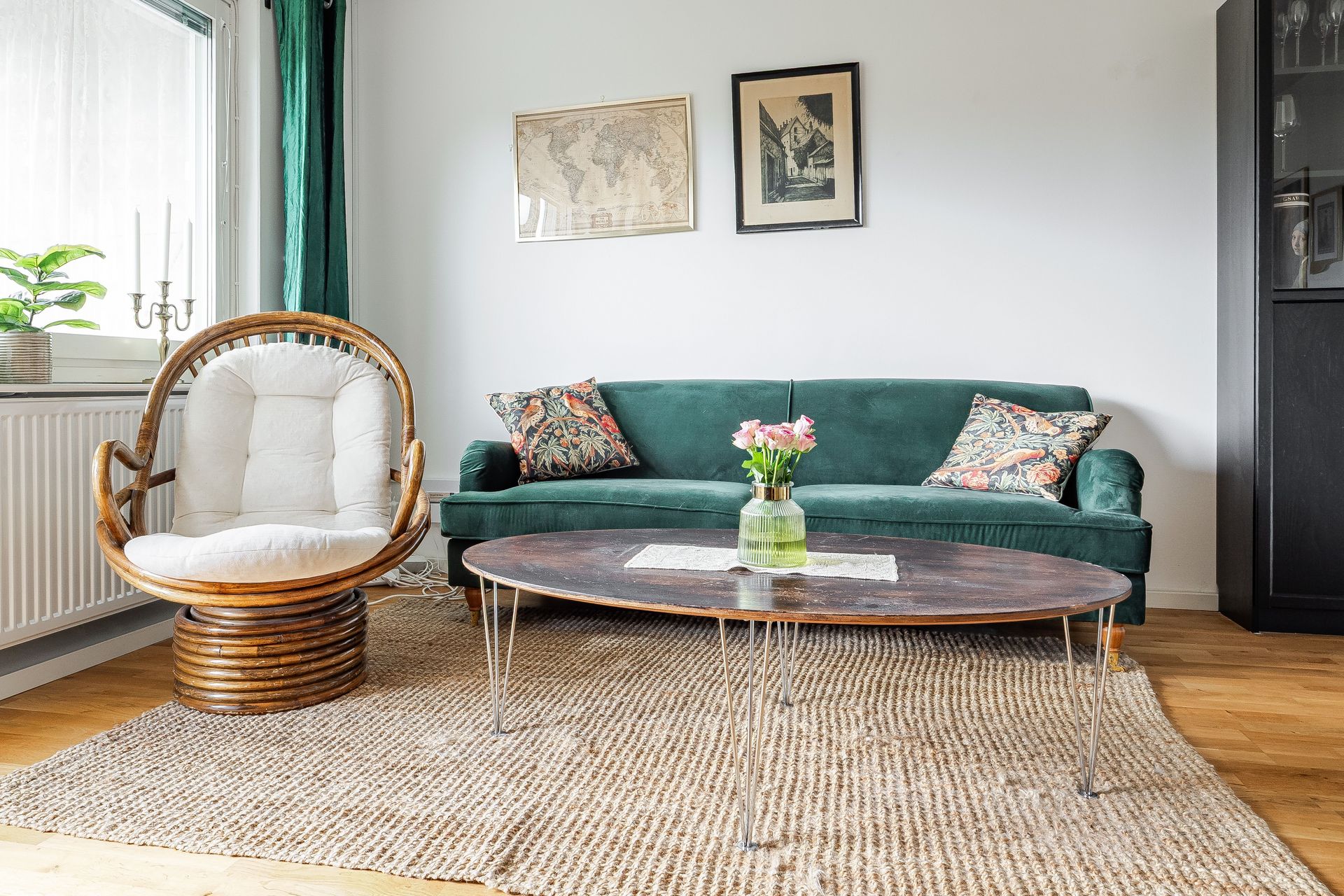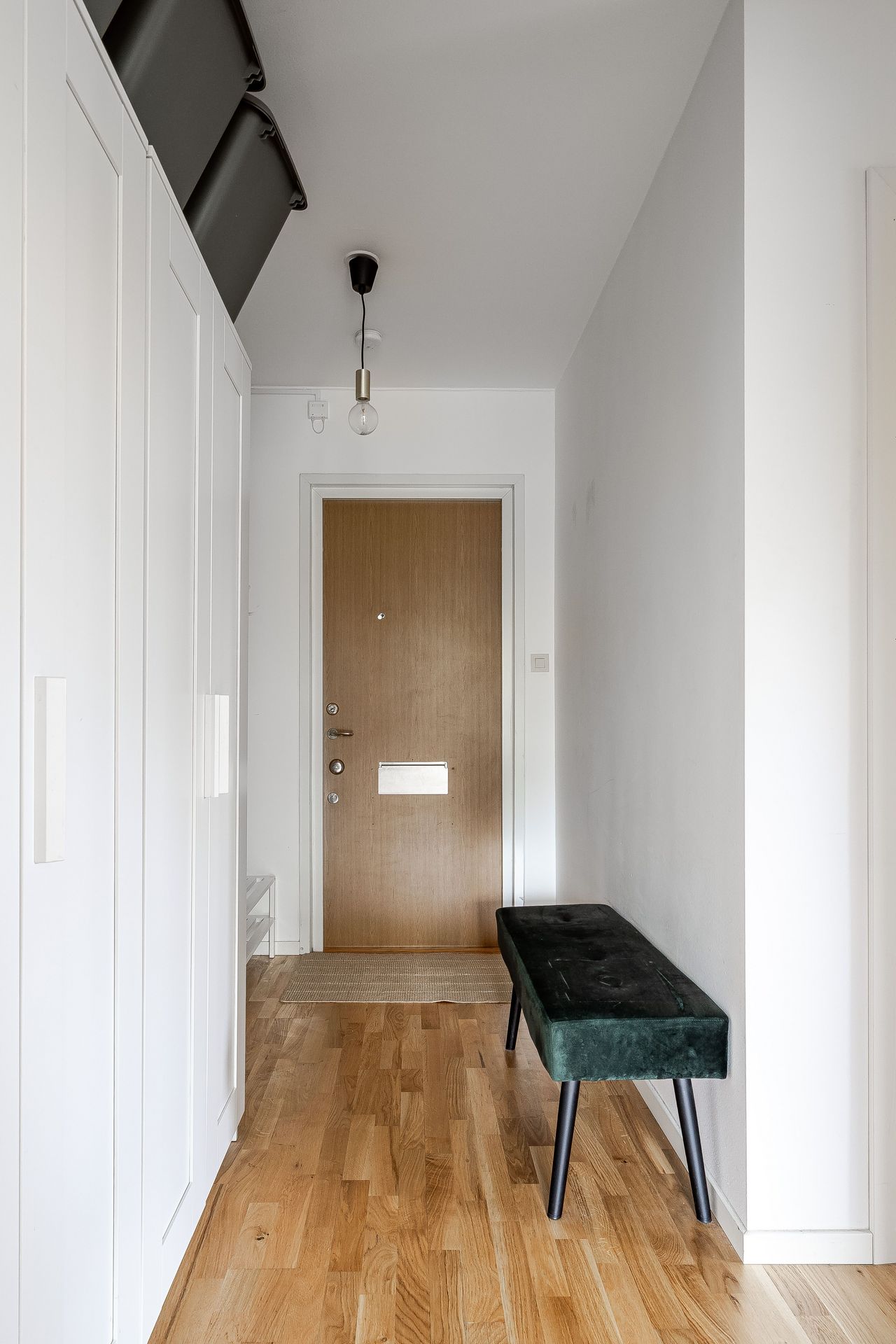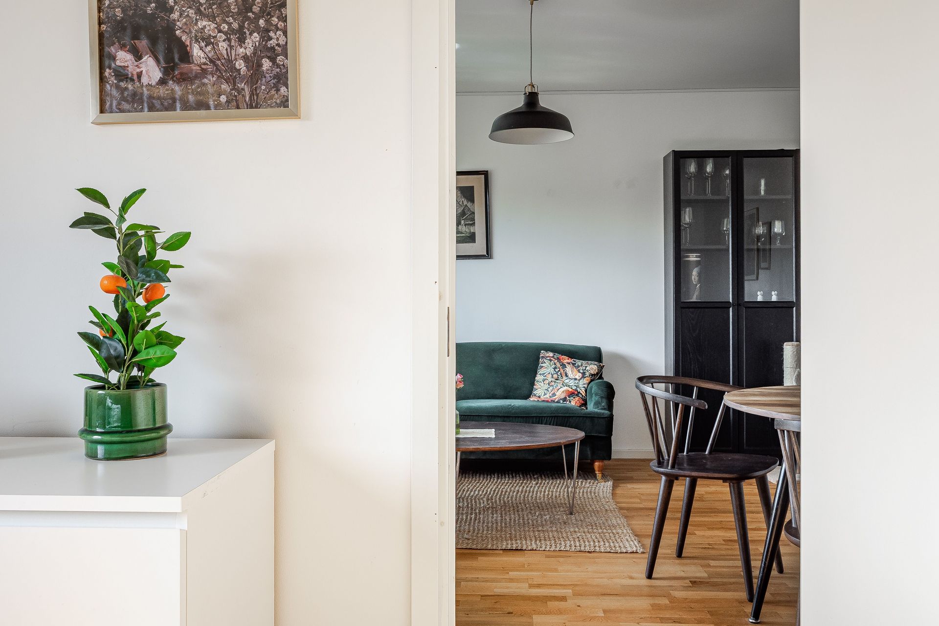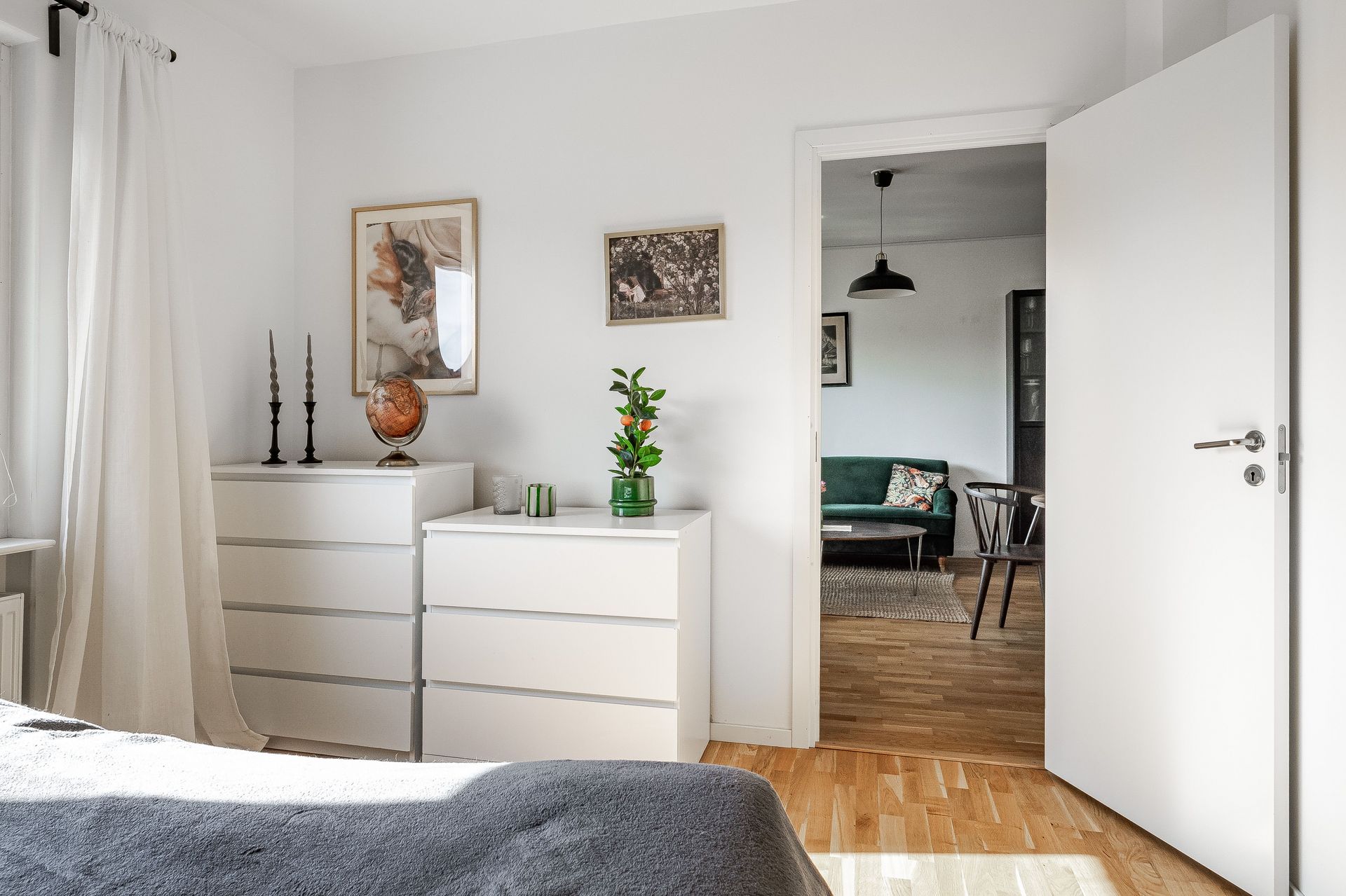 HALL Rymlig och ljus hall med bra avhängningsmöjligheter och tre garderober i anslutning. Ekparkett och vitmålade väggar. KÖK Ljust och fräscht kök med plats för matbord vid fönster. Köket går i ljusa snickerier, laminatbänkskiva och ljusgrått kakel ovan diskbänk. Köket är erbjuder gott om förvaring. Köket är utrustat med spis med häll, spisfläkt, diskmaskin samt kombinerad kyl & frys. Ekparkett, vitmålade väggar och fondtapet. VARDAGSRUM Det öppna och rymliga vardagsrummet erbjuder plats för både soffgrupp samt separat matdel. Utgång till inglasad balkong i söderläge. Ekparkett och vitmålade väggar. SOVRUM Ekparkett, vitmålade väggar och två garderober. BADRUM Fräscht och stambytt badrum med ljusgrå plastmatta och vitkaklade väggar. Badrummet är utrustad med wc, tvättställ, spegelskåp, vattenburen handdukstork, duschhörna och tvättmaskin. BALKONG Stor och härligt inglasad balkong i söderläge med utsikt över lummig innergård.