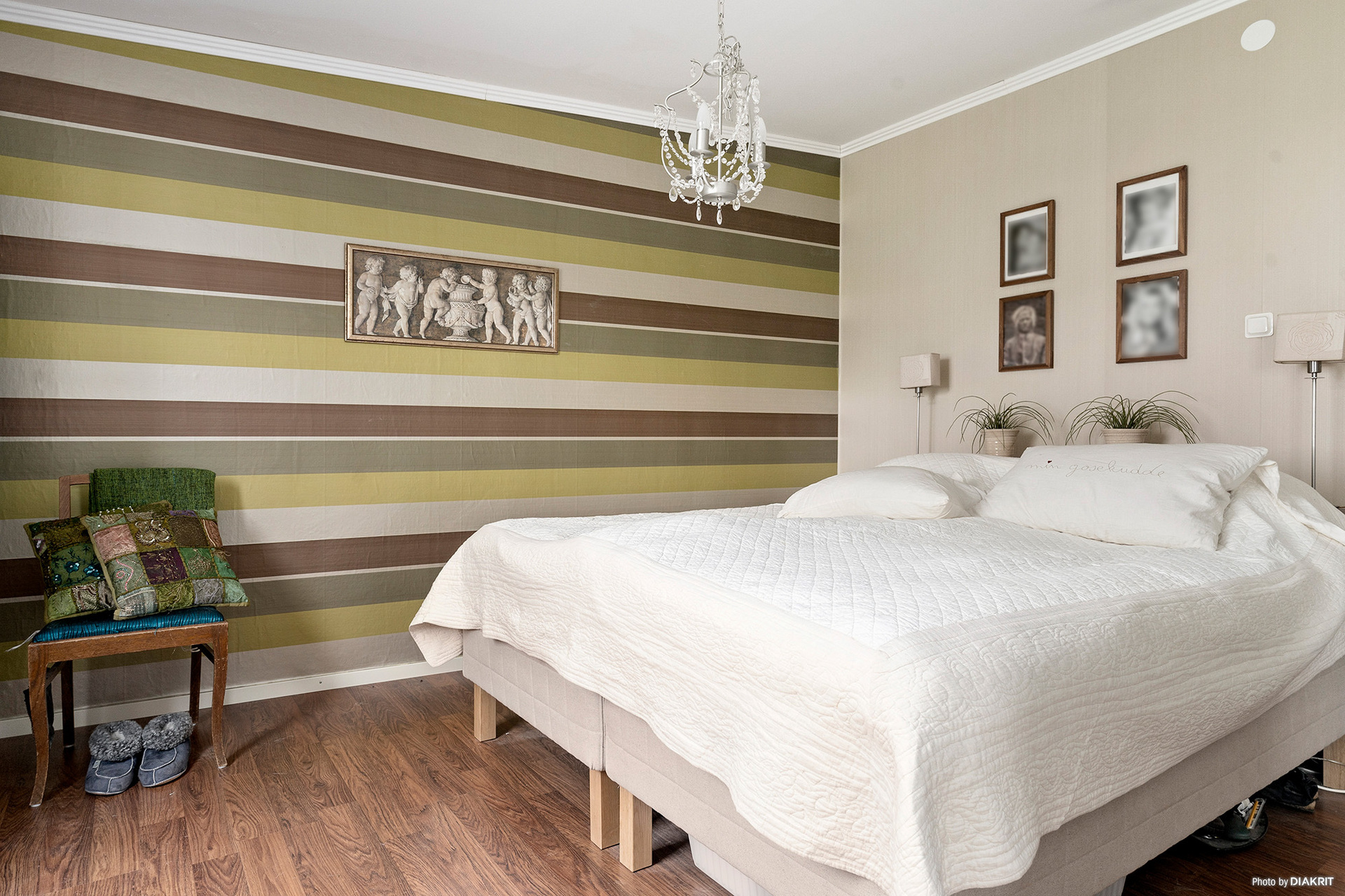 Stort sovrum med tapetserade väggar och laminatgolv. Stor garderob med skjutdörrar.