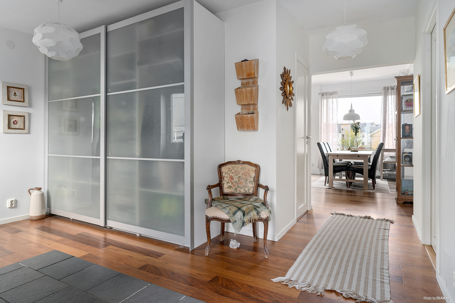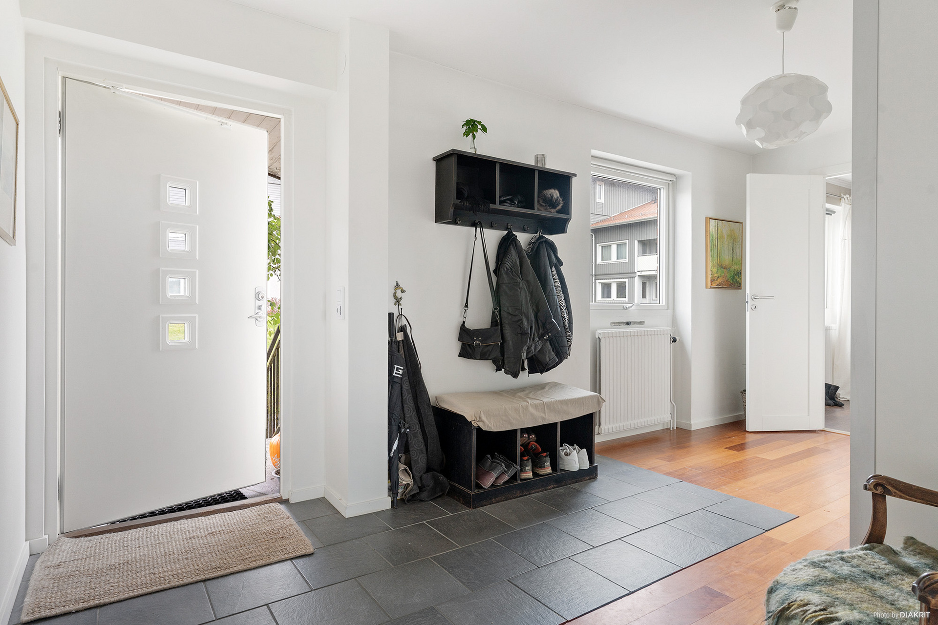 Stor entré/hall med en hel garderobsvägg. Klinkers med golvvärme innanför dörren, mörkt laminatgolv och nymålade vita väggar.
