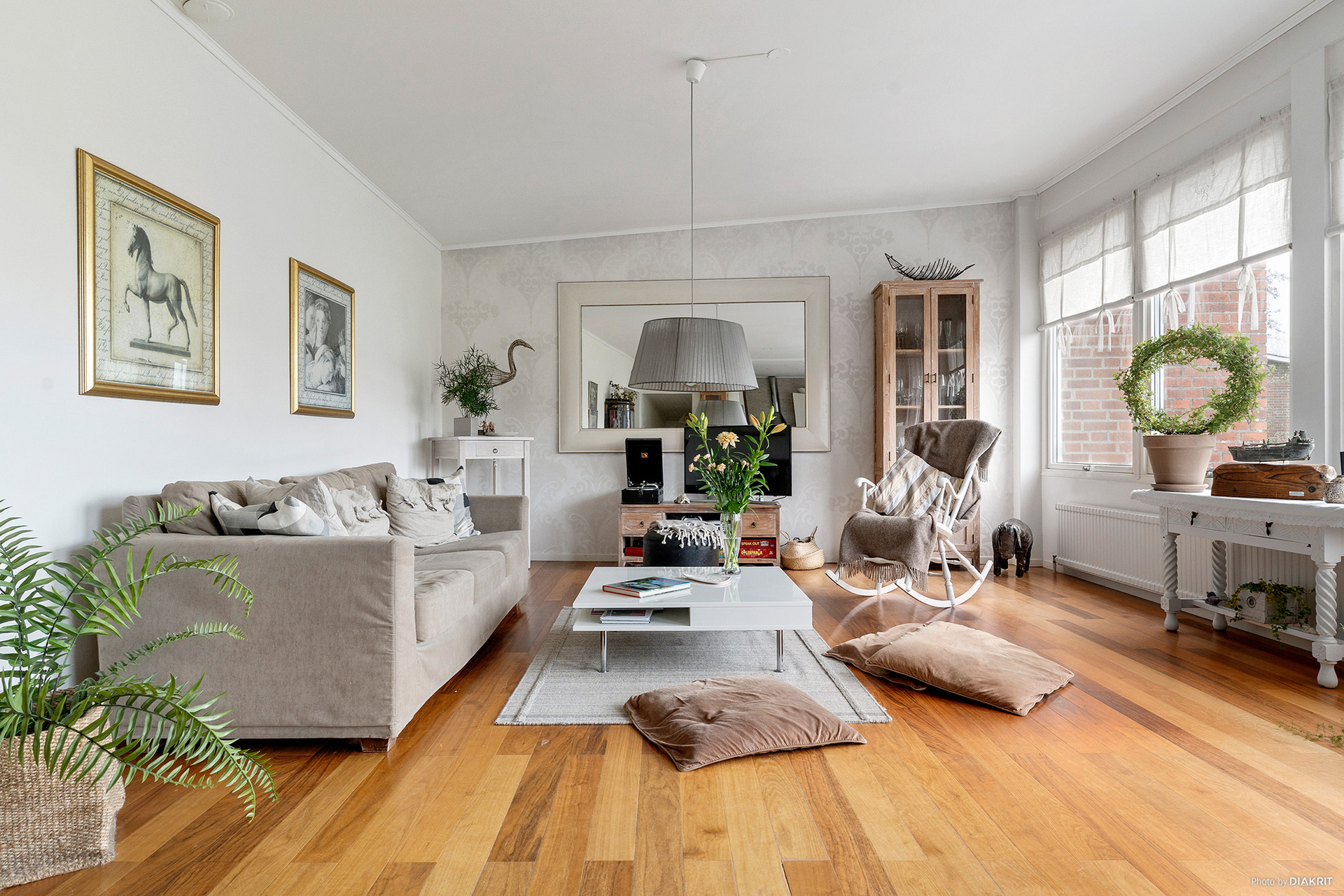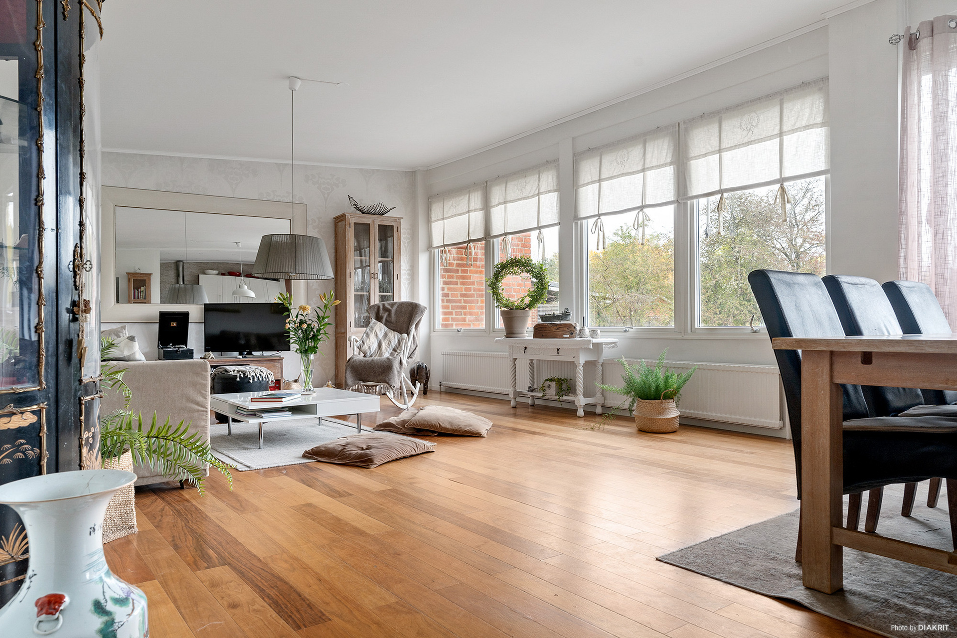 Stort vardagsrum med stora fina fönster. Mörkt laminatgolv och nymålade vita väggar. Här har man maximalt med vackert ljusinsläpp och fin utsikt över grönområde och bostadsområde.