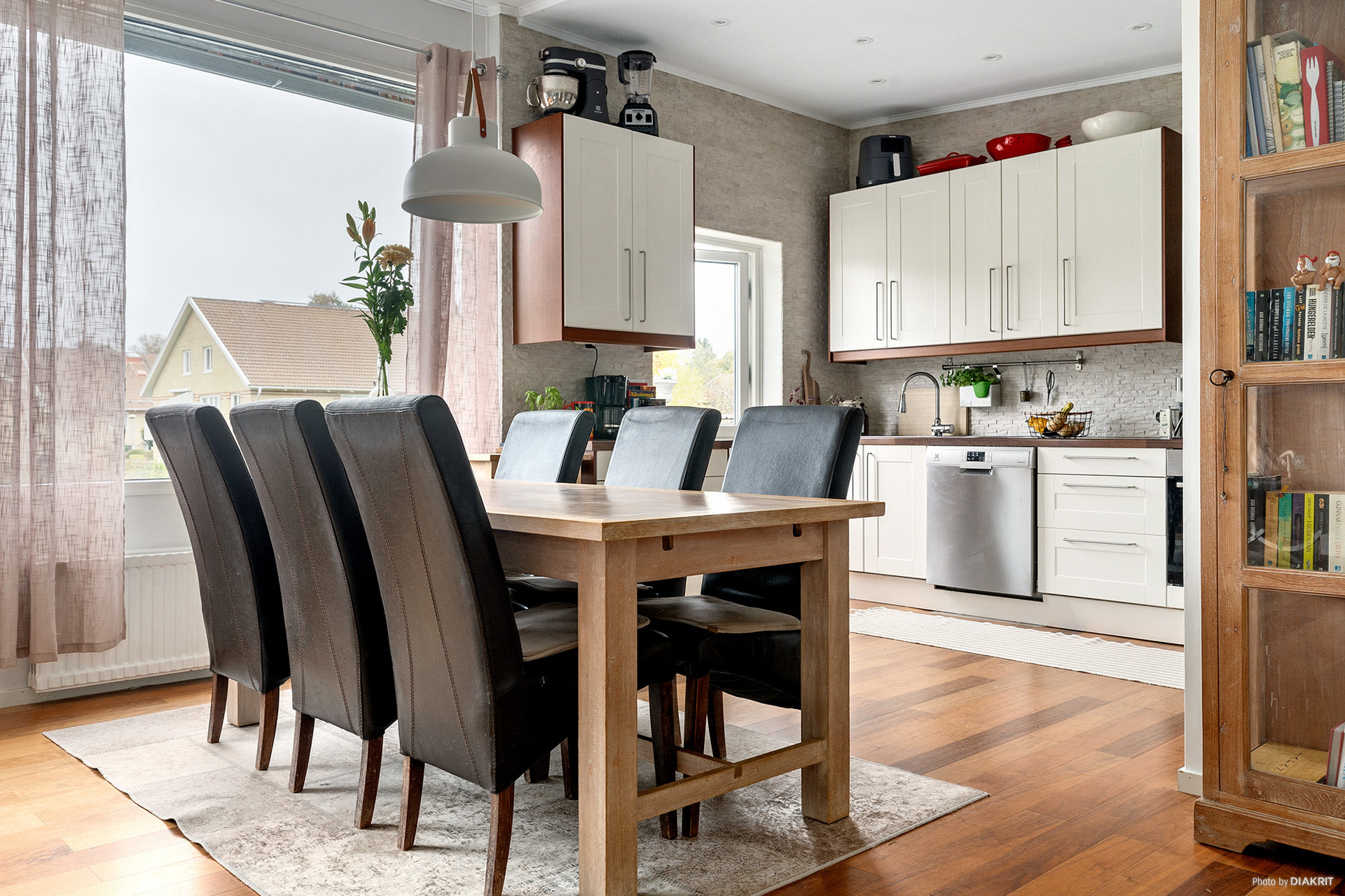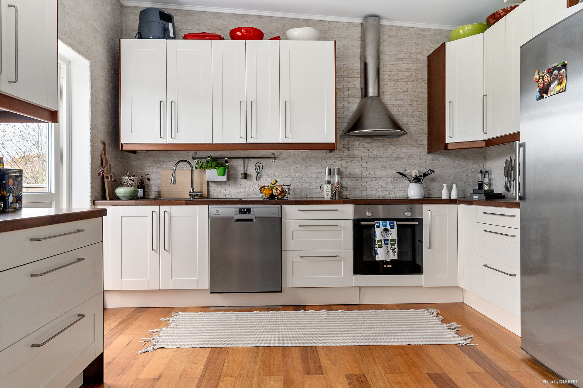 Smakfullt kök med vita luckor och rostfria vitvaror. Stort fönster vid matplatsen och en altandörr som tar dig ner till den härliga altanen direkt från köket.