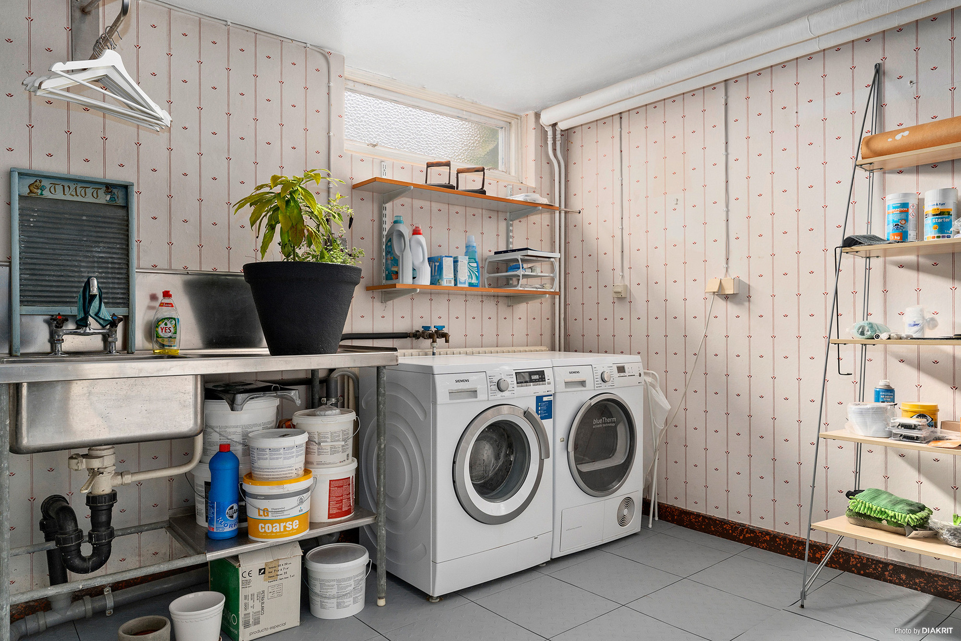 Stor tvättstuga med tvättmaskin och torktumlare.
