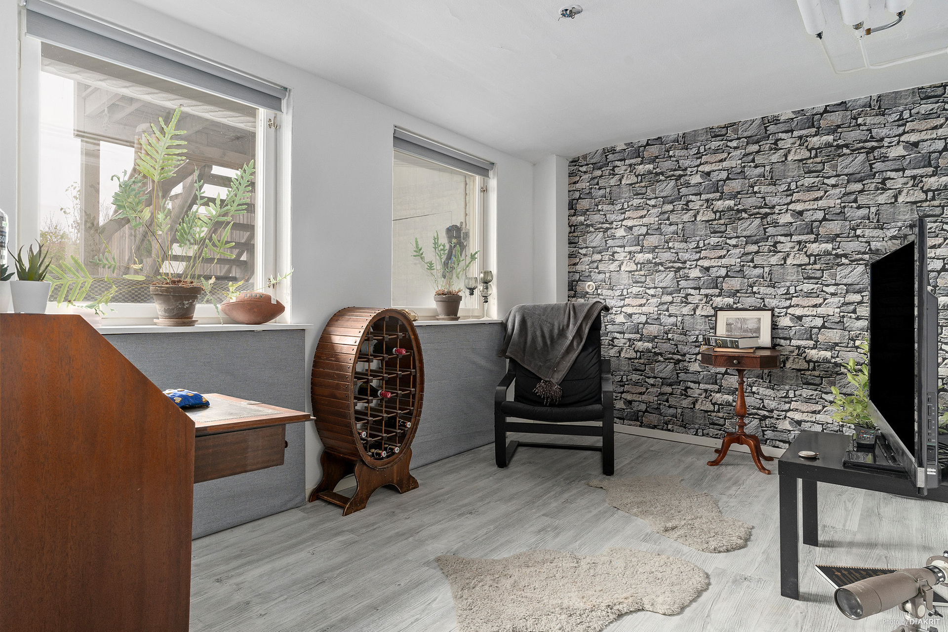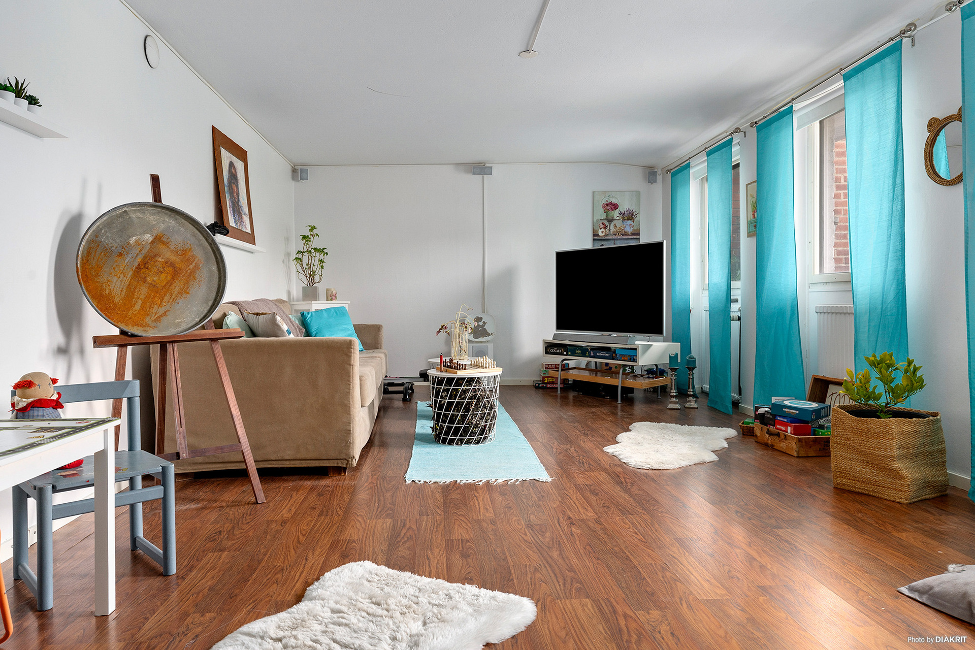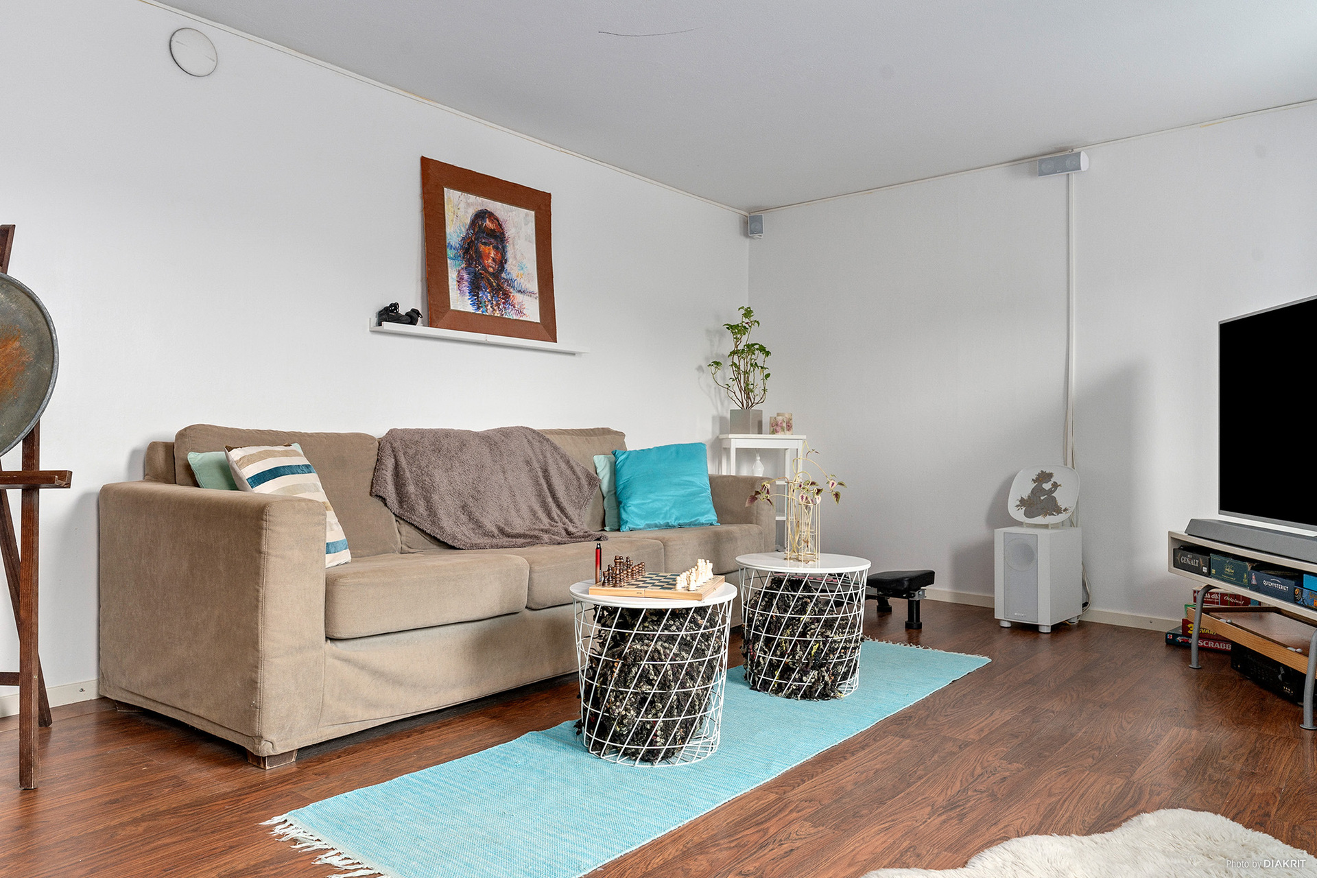 Stort allrum med laminatgolv och vitmålade väggar. Utgång till altanen i hallen bredvid rummet.
