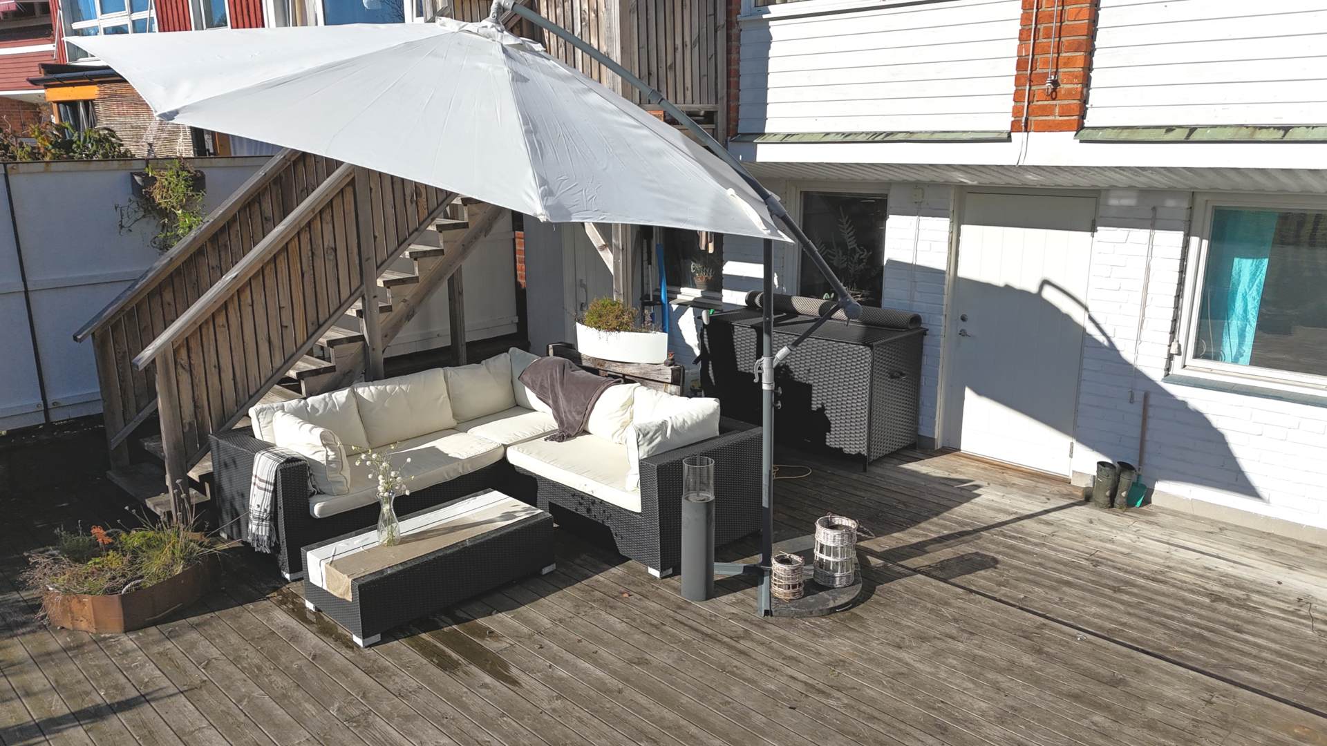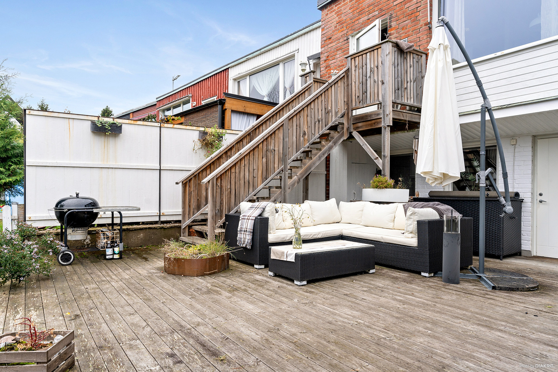 Stor uteplats med altan, delvis under tak. Trappa med utgång från köket direkt till altanen.