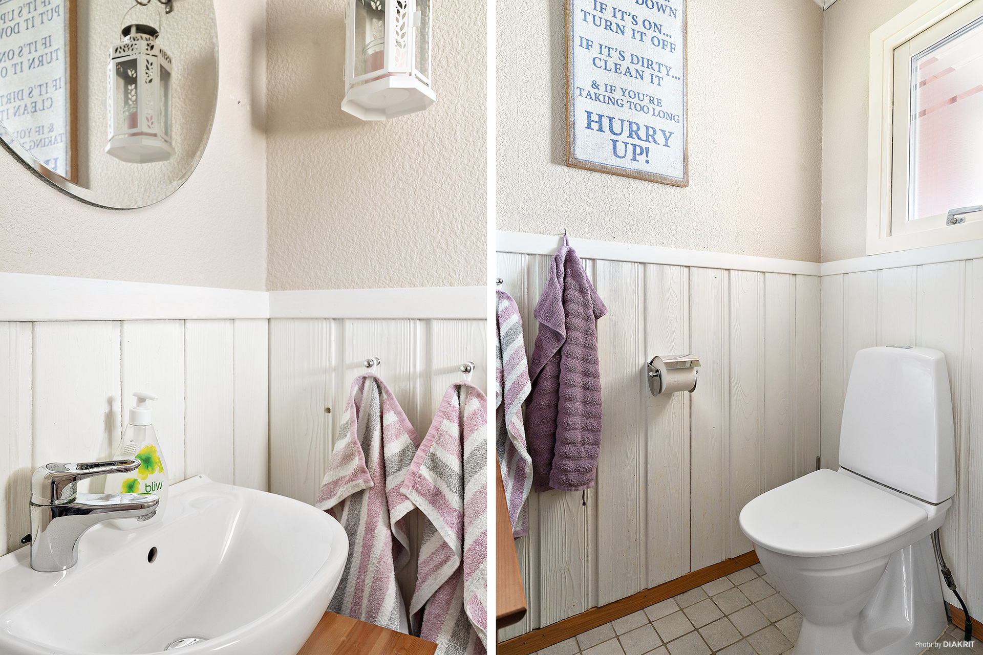 Toalett med wc och handfat. Ljusa väggar och klinkers med golvvärme.
