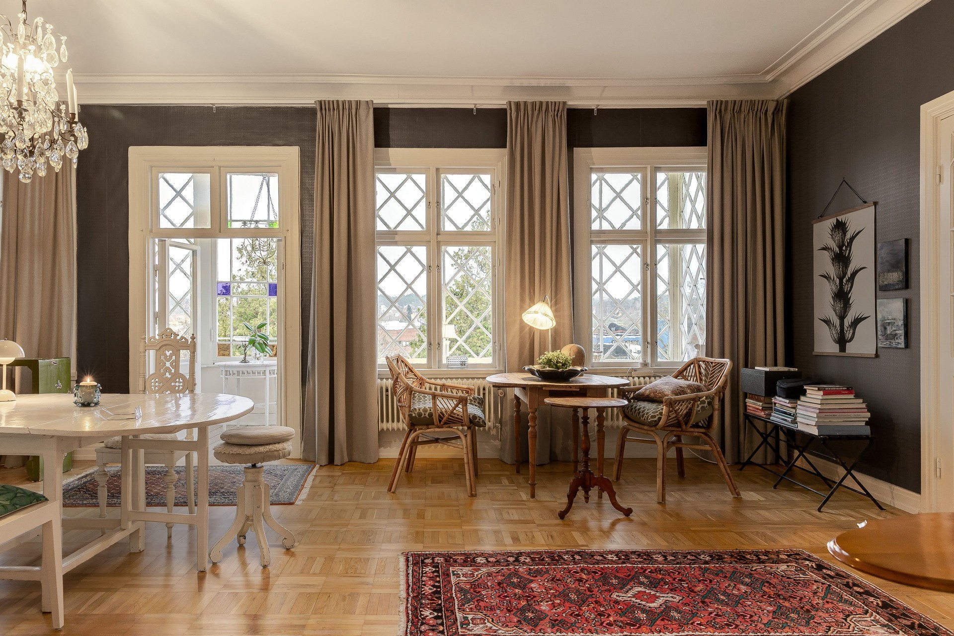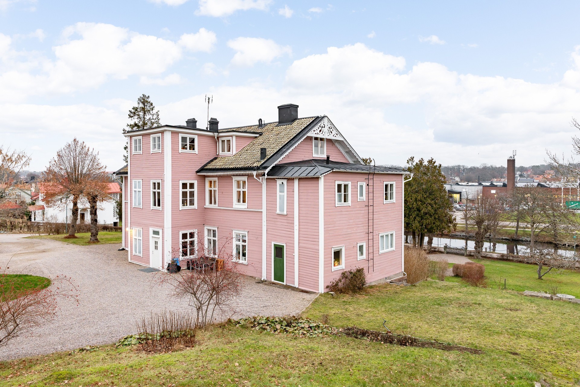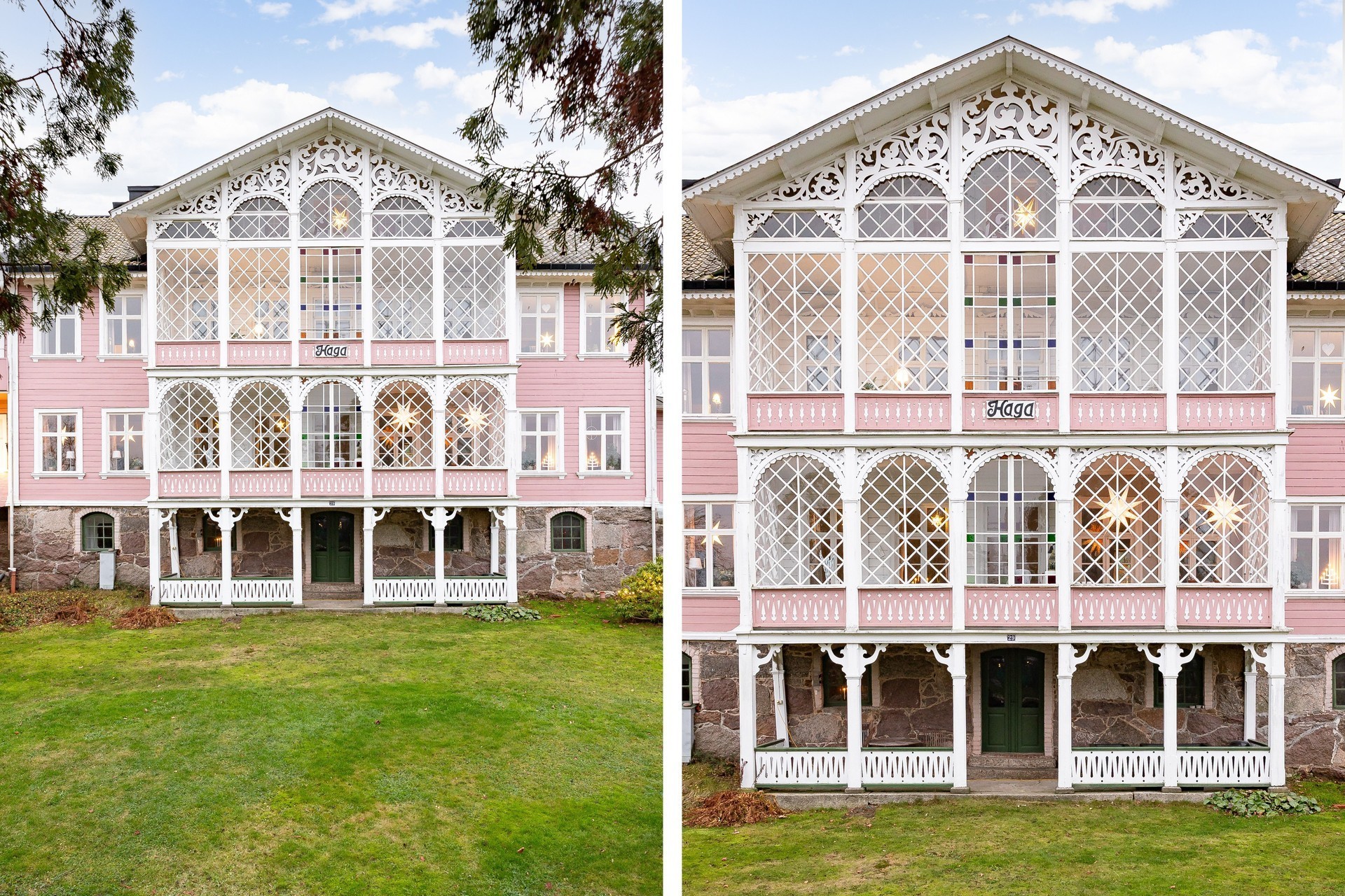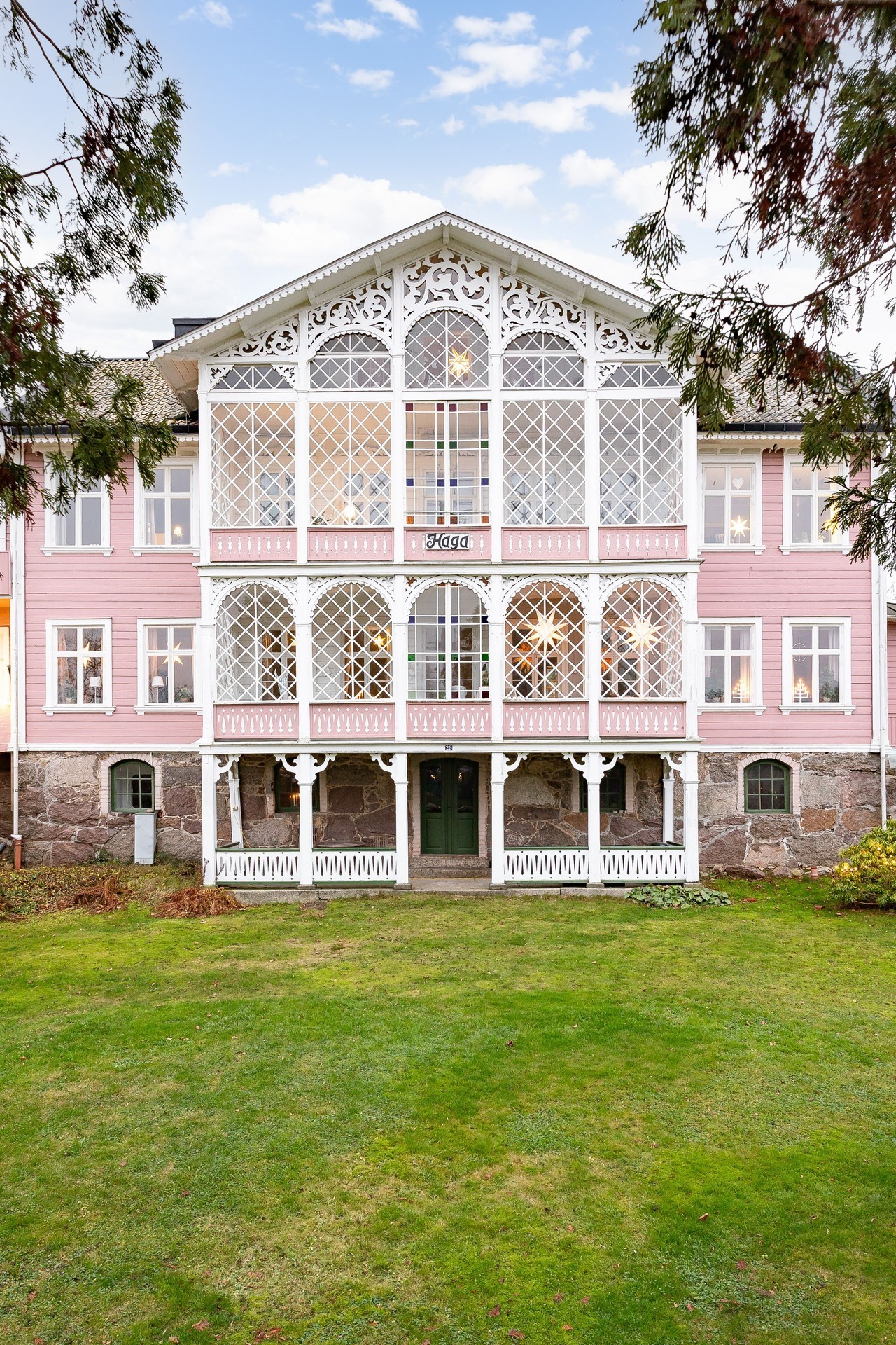 Villa Haga är en historisk och arkitektoniskt betydelsefull villa, känd för sin magnifika glasveranda, som ägdes av mejeristen Nils Ludvig Petersen och byggdes förra sekelskiftet. Attraktiv och sober ligger den idylliskt invid ån på en majestätisk parkliknande tomt, styvt 5000 kvm, med möjligheter. Byggnaden innehåller 5 st lgh mellan 62 - 134 kvm, inalles knappt 500 kvm, varav den största blir ledig för köparen. Bergvärme, kakelugn, fiber mm finns och är i mycket bra skick. Strategiskt läge med gångavstånd till stadskärnan, tågstation, golfbana och den eleganta brunnsparken. Hyresintäkter 425 kkr / år, driftkostnader 90 kkr. Säljes primärt i bolagsform men kan även friköpas. OBS! Bilder endast från den lediga lägenheten!!!