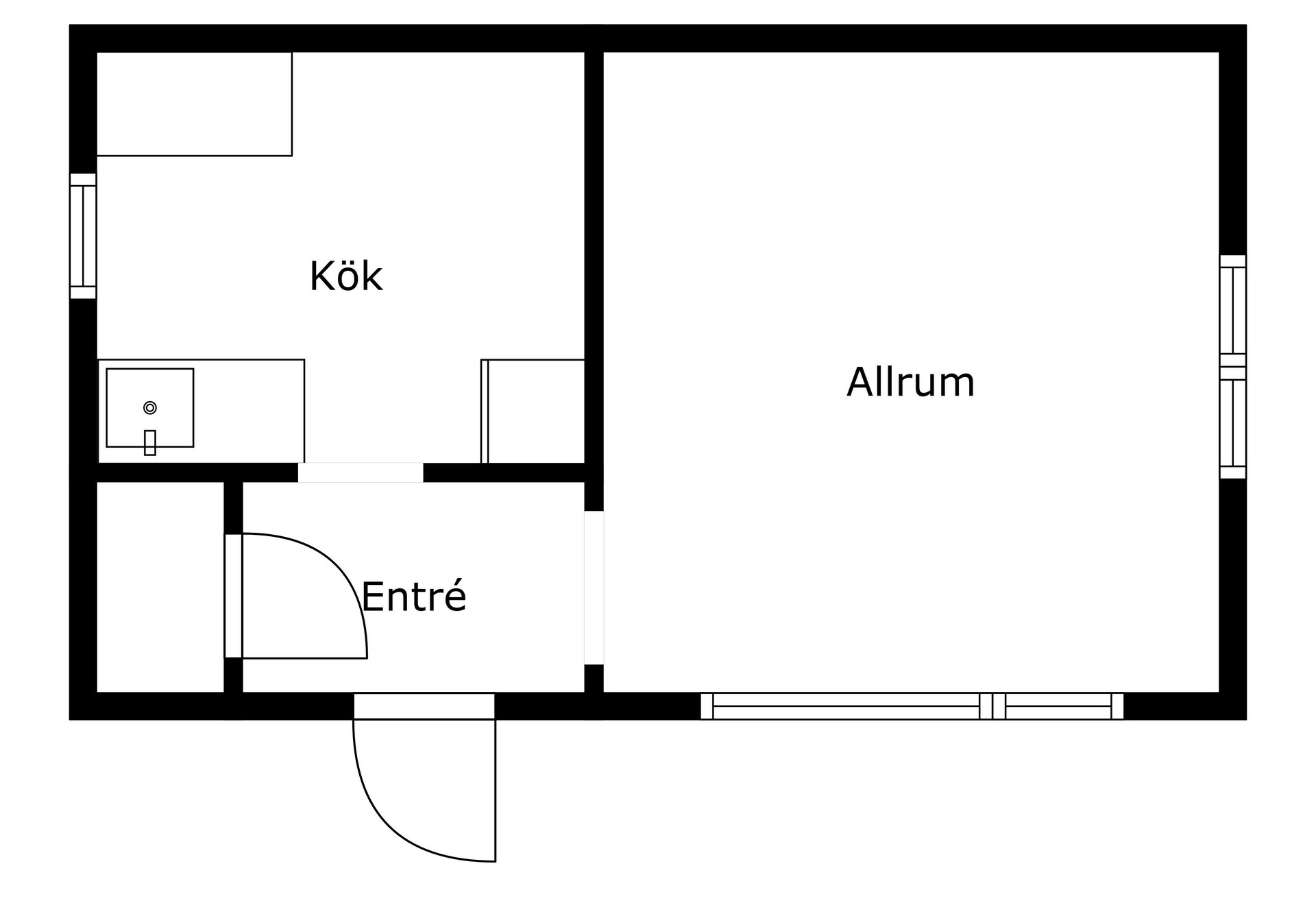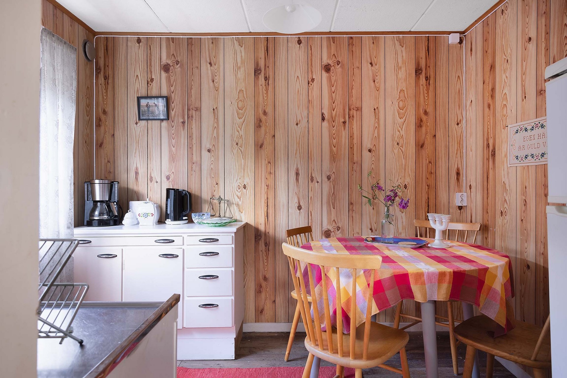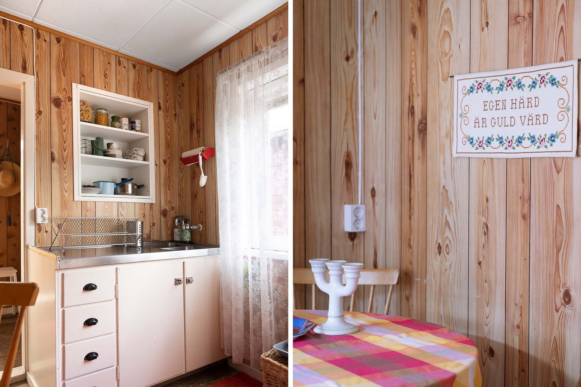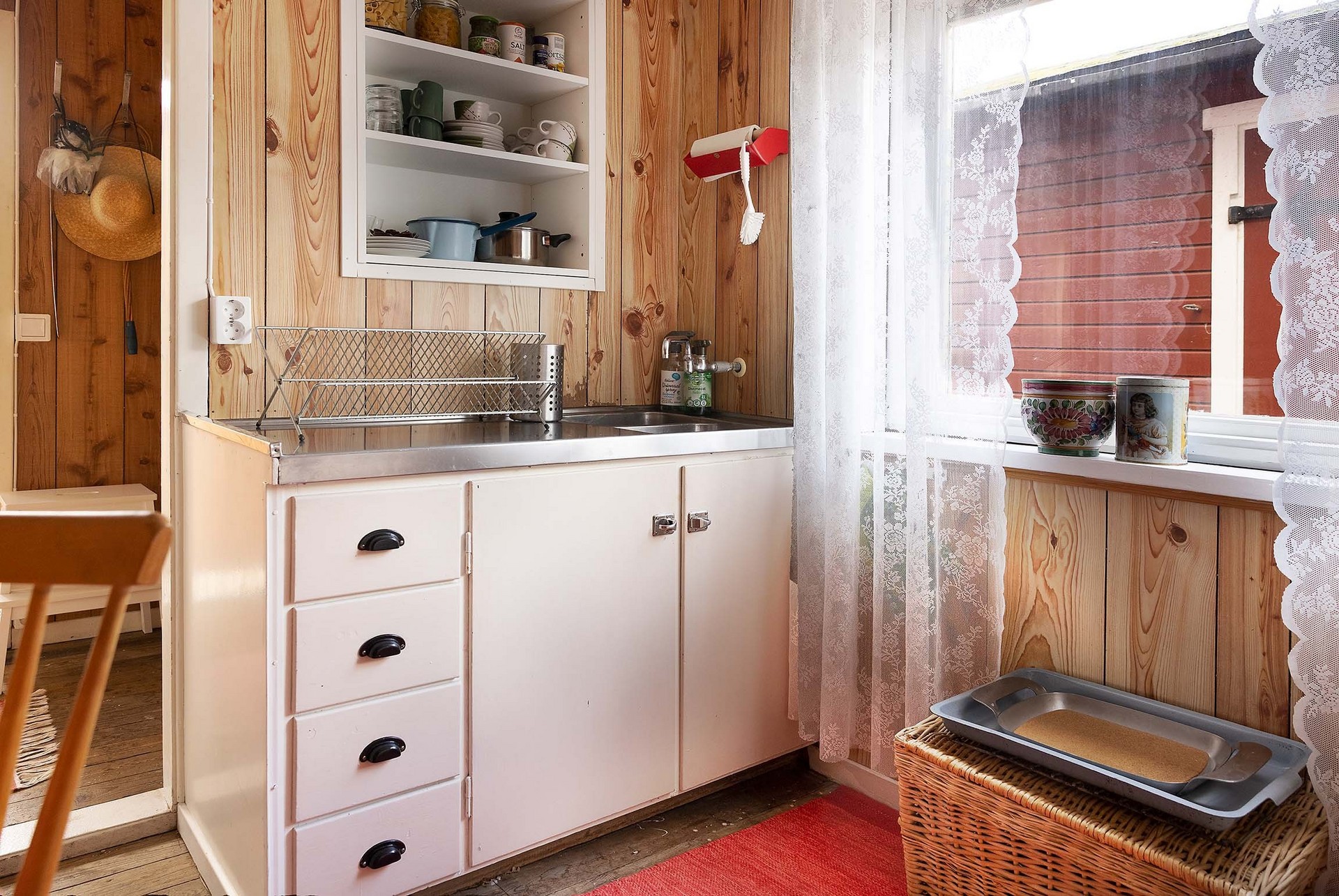 Stugan har en tydlig och funktionell planlösning med en liten entréhall som binder samman kök, allrum och förvaringsutrymme. Direkt till vänster finns en praktisk klädkammare. Vid en framtida anslutning till kommunalt vatten och avlopp i området skulle detta utrymme också kunna bli en idealisk plats för toalett. Köket är inrett i enkel, lantlig stil med diskbänk, arbetsyta, skåp för förvaring och ett fönster mot trädgården – precis det som behövs för sommarens måltider. Allrummet rymmer både sovdel, matplats och sittmöbler. Trägolven, de ljusa ytskikten och fönstren i två väderstreck skapar en trivsam, inbjudande atmosfär med känsla av ljus och rymd. På tomten finns även ett fristående förråd med separat ingång – ett rymligt komplement som passar utmärkt för förvaring eller framtida utveckling som gästhus.