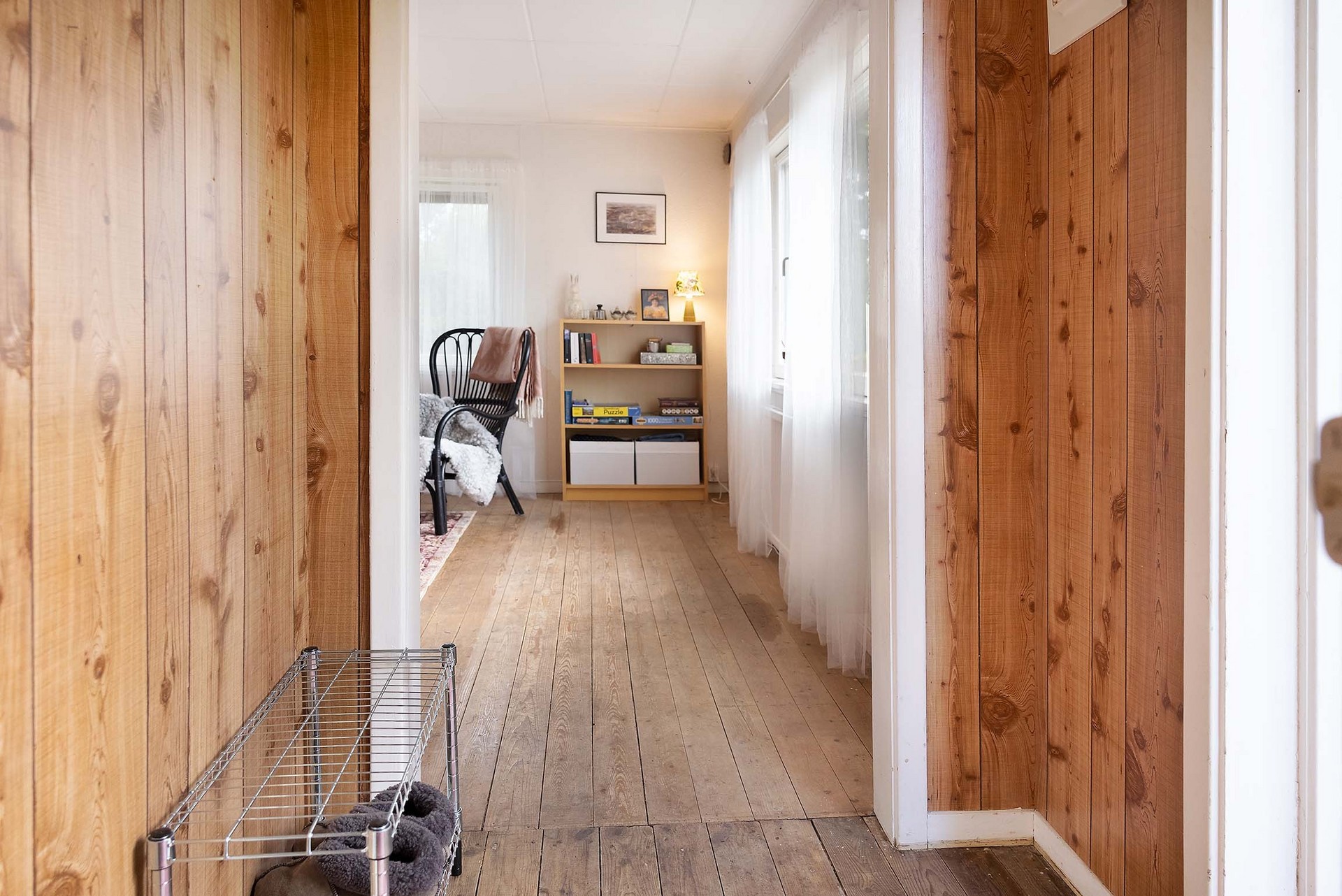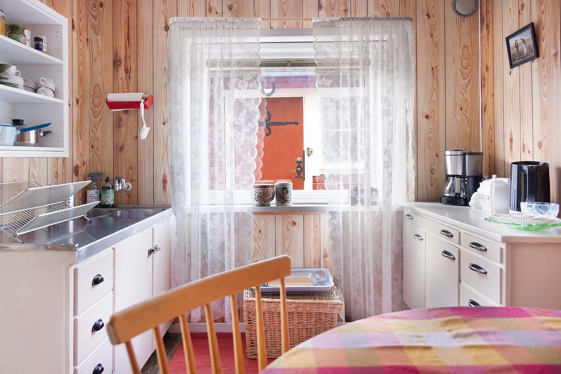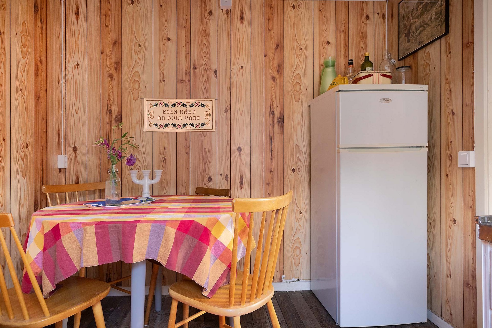 Stugan har en tydlig och funktionell planlösning med en liten entréhall som binder samman kök, allrum och förvaringsutrymme. Direkt till vänster finns en praktisk klädkammare. Vid en framtida anslutning till kommunalt vatten och avlopp i området skulle detta utrymme också kunna bli en idealisk plats för toalett. Köket är inrett i enkel, lantlig stil med diskbänk, arbetsyta, skåp för förvaring och ett fönster mot trädgården – precis det som behövs för sommarens måltider. Allrummet rymmer både sovdel, matplats och sittmöbler. Trägolven, de ljusa ytskikten och fönstren i två väderstreck skapar en trivsam, inbjudande atmosfär med känsla av ljus och rymd. På tomten finns även ett fristående förråd med separat ingång – ett rymligt komplement som passar utmärkt för förvaring eller framtida utveckling som gästhus.
