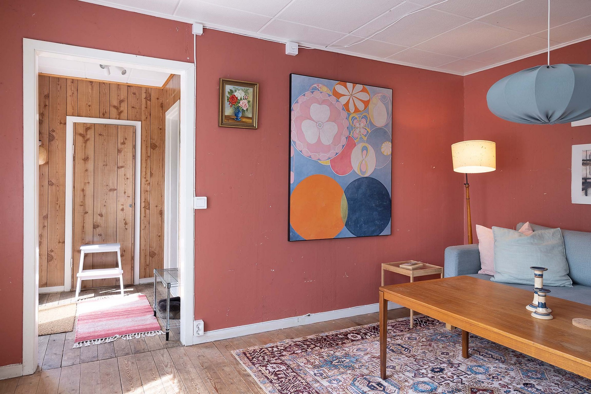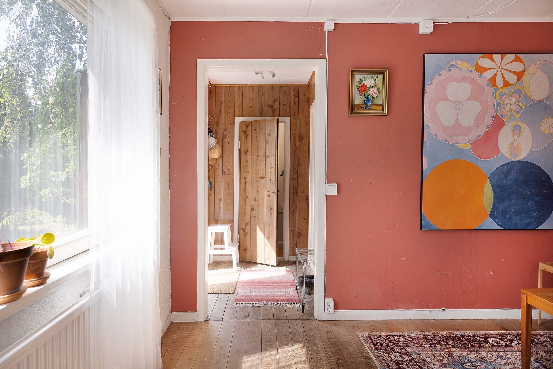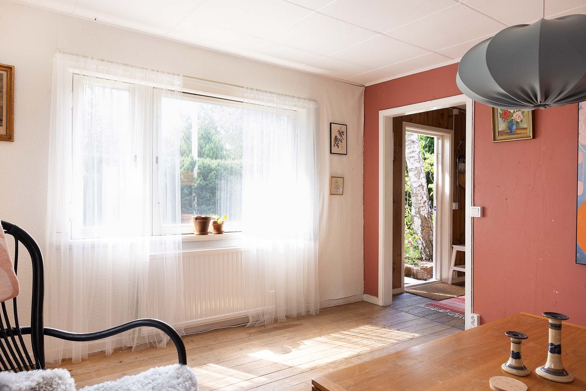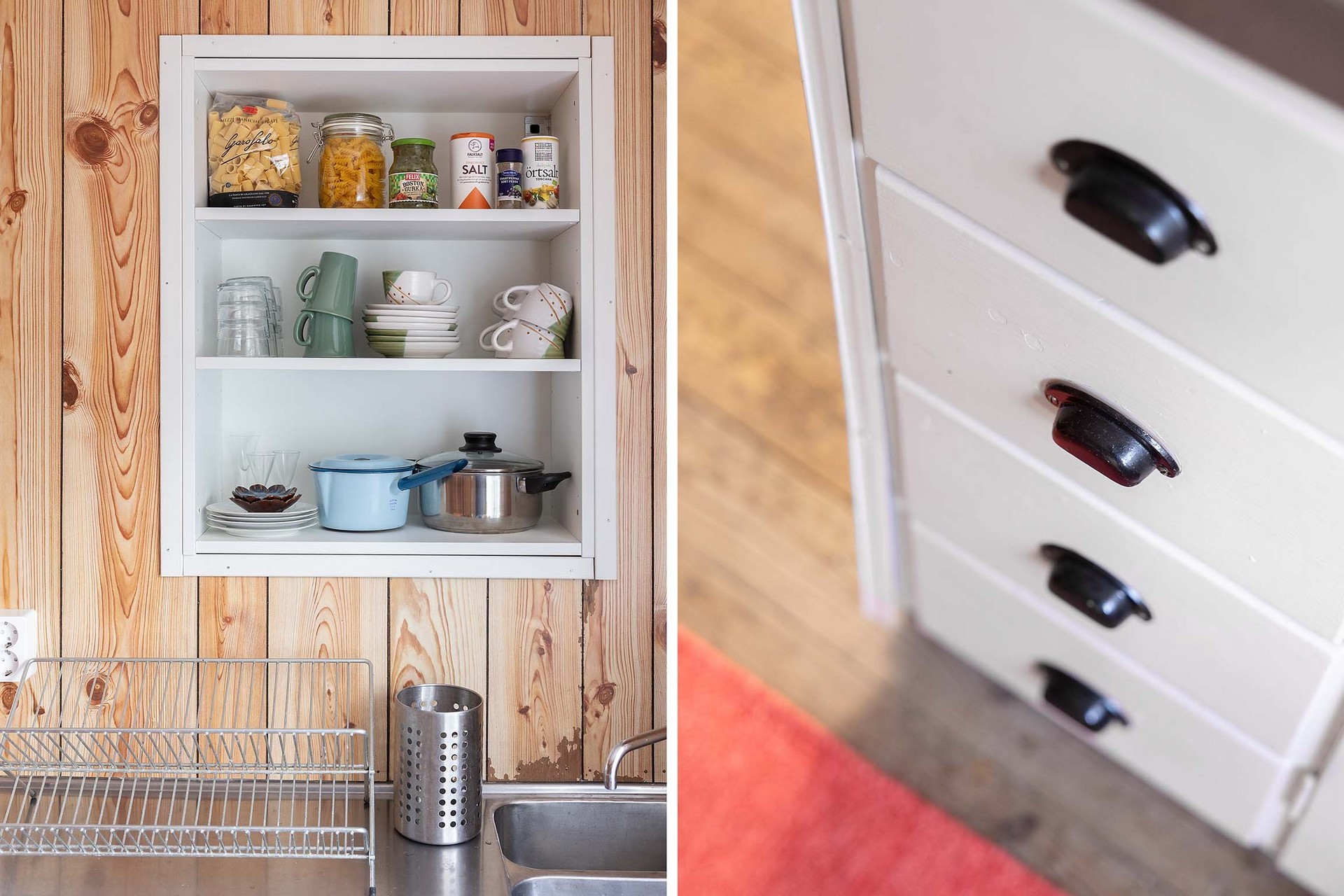 Stugan har en tydlig och funktionell planlösning med en liten entréhall som binder samman kök, allrum och förvaringsutrymme. Direkt till vänster finns en praktisk klädkammare. Vid en framtida anslutning till kommunalt vatten och avlopp i området skulle detta utrymme också kunna bli en idealisk plats för toalett. Köket är inrett i enkel, lantlig stil med diskbänk, arbetsyta, skåp för förvaring och ett fönster mot trädgården – precis det som behövs för sommarens måltider. Allrummet rymmer både sovdel, matplats och sittmöbler. Trägolven, de ljusa ytskikten och fönstren i två väderstreck skapar en trivsam, inbjudande atmosfär med känsla av ljus och rymd. På tomten finns även ett fristående förråd med separat ingång – ett rymligt komplement som passar utmärkt för förvaring eller framtida utveckling som gästhus.