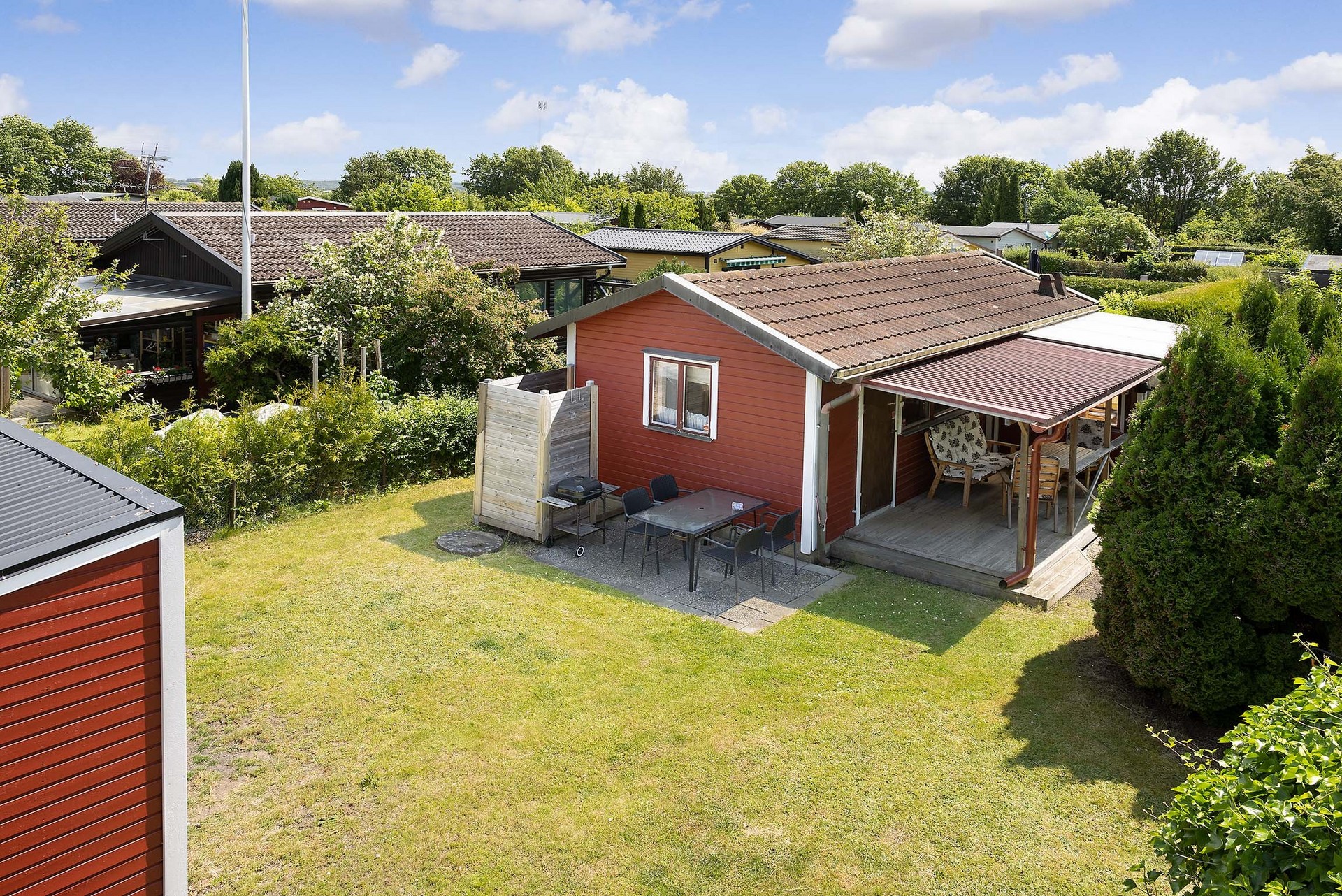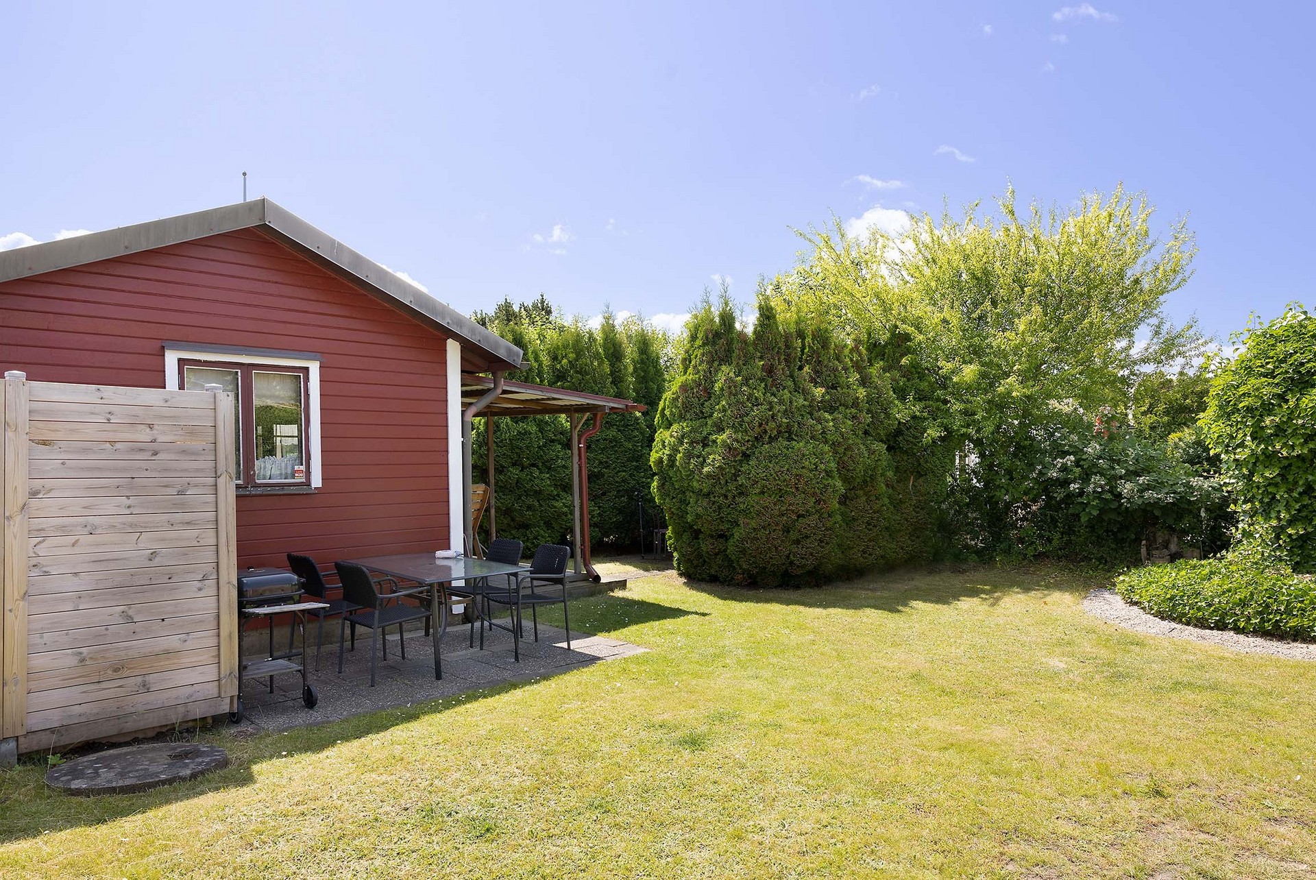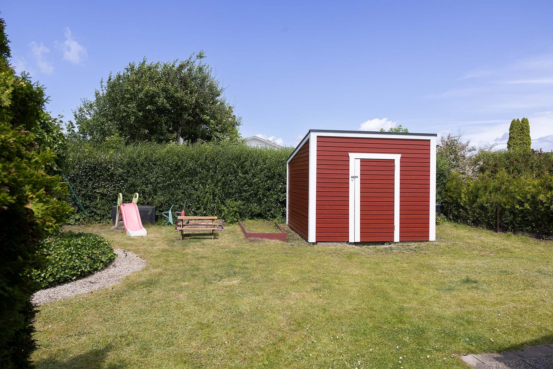 Tomten är välskött och lätt att underhålla. Den omges av grönska och häckar som ger både insynsskydd och ett lugnt intryck. Här finns gräsmatta för lek, planteringar, buskar samt ett förråd i matchande röd färg. Perfekt för odling, avkoppling och sommarliv. Här finns även en praktisk utedusch med avlopp utmärkt för varma sommardagar eller efter en stund i trädgården.