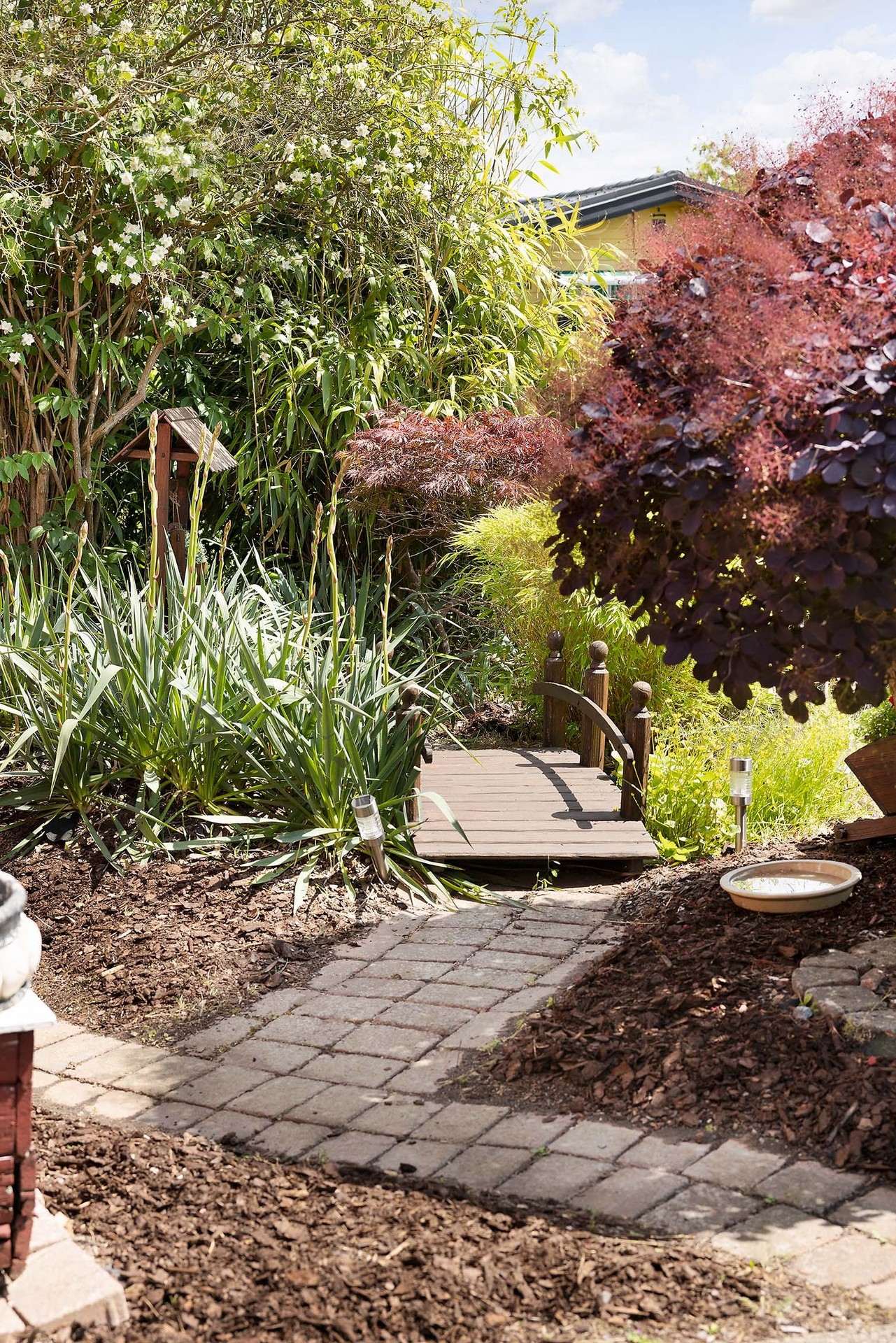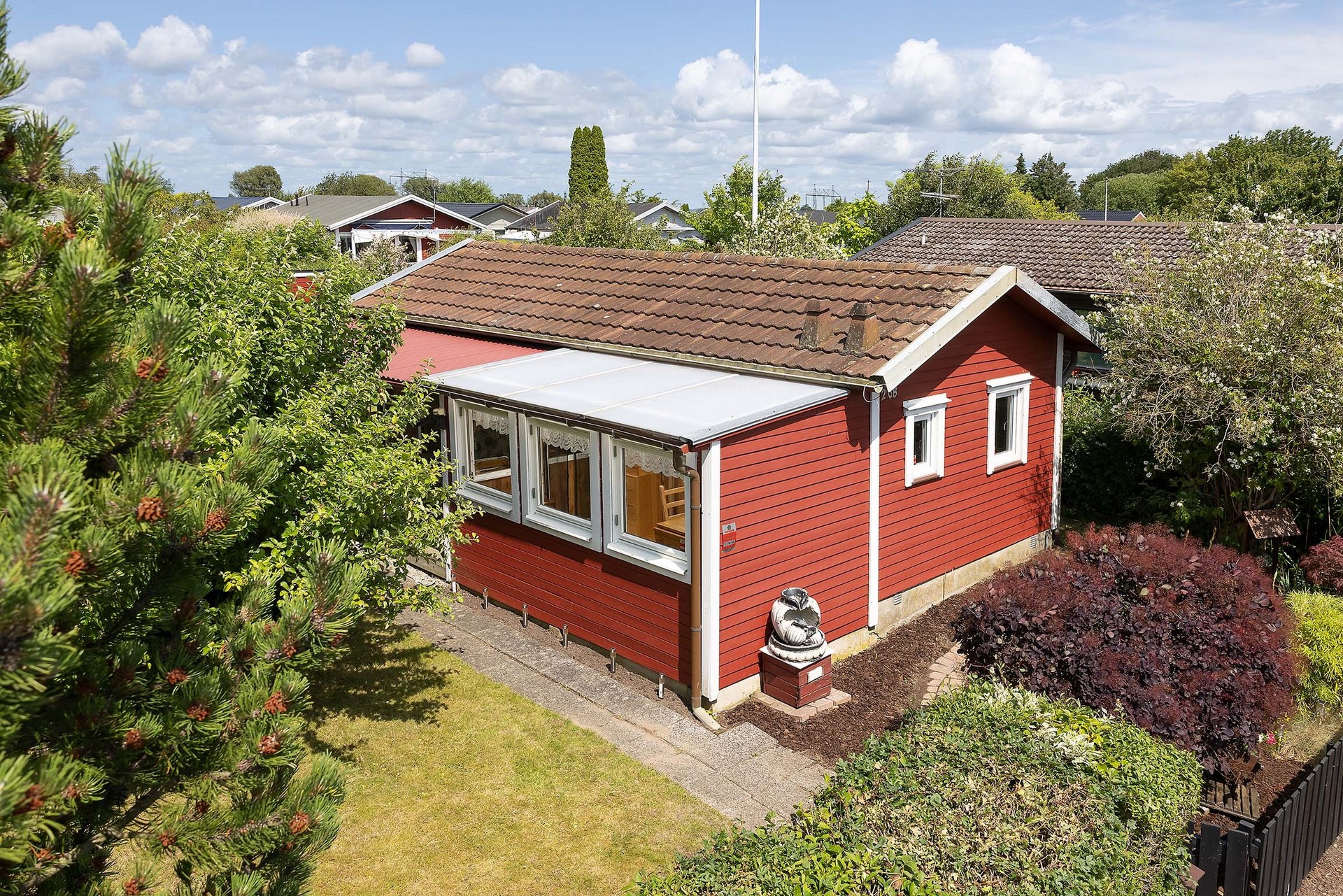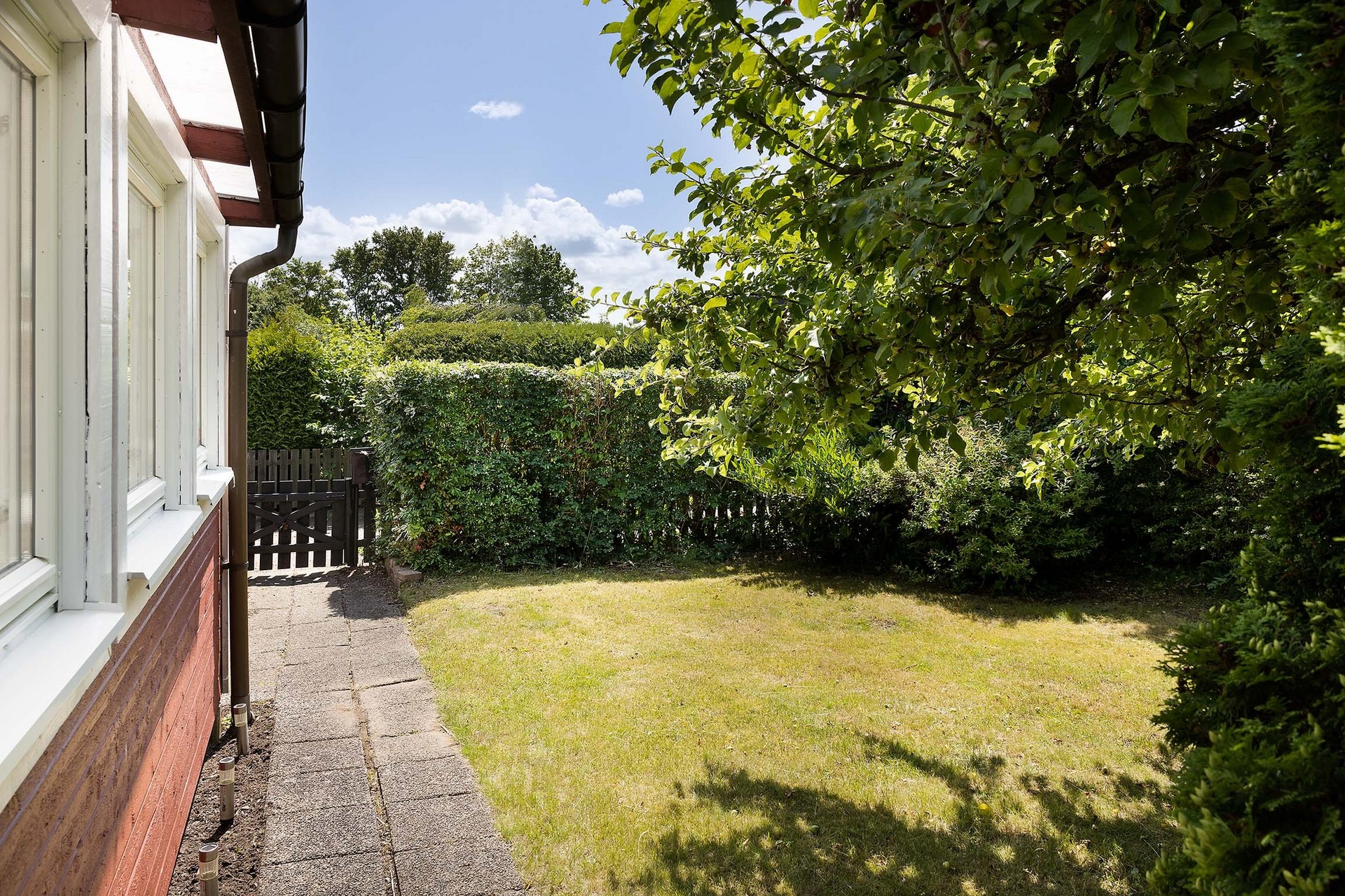 Tomten är välskött och lätt att underhålla. Den omges av grönska och häckar som ger både insynsskydd och ett lugnt intryck. Här finns gräsmatta för lek, planteringar, buskar samt ett förråd i matchande röd färg. Perfekt för odling, avkoppling och sommarliv. Här finns även en praktisk utedusch med avlopp utmärkt för varma sommardagar eller efter en stund i trädgården.