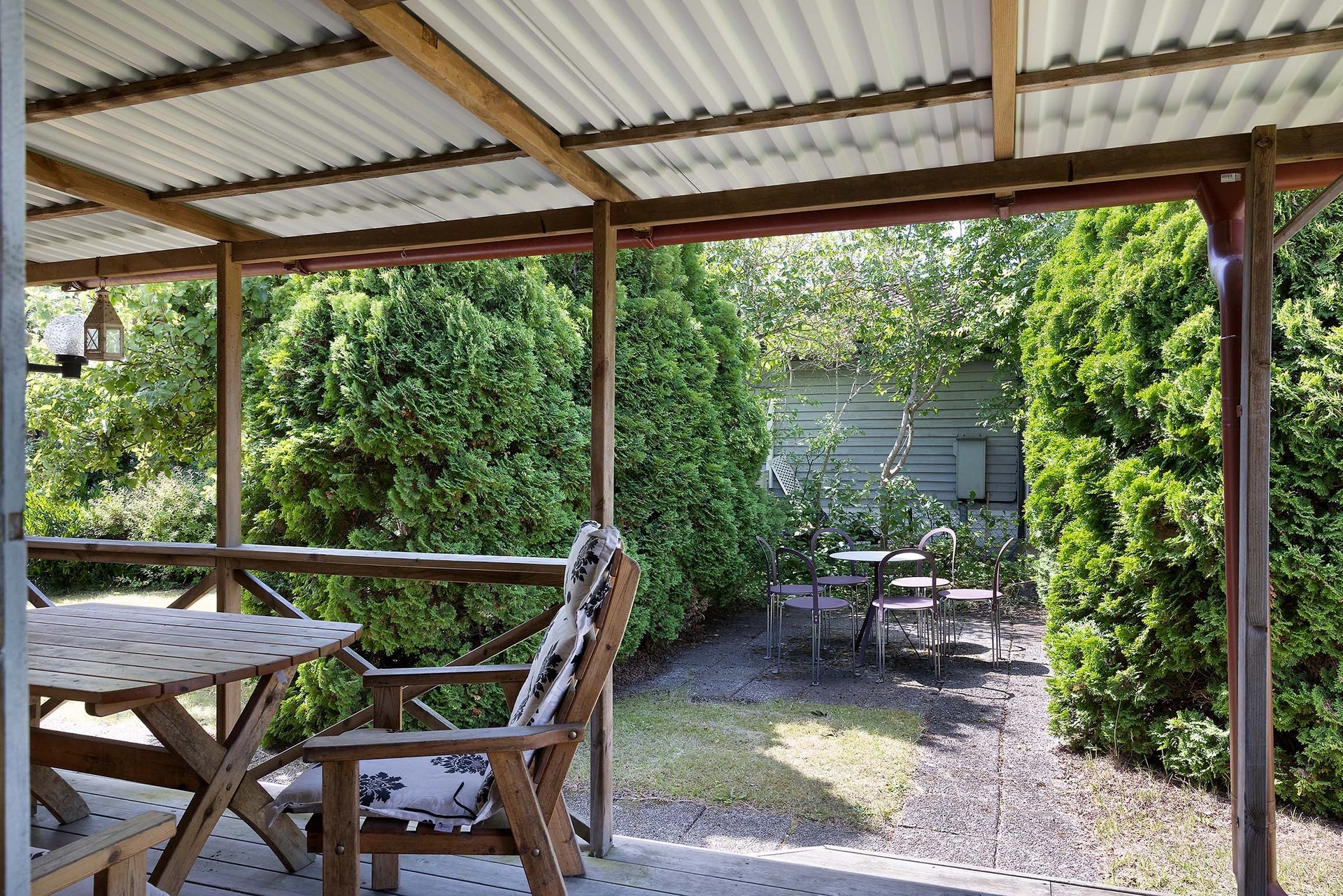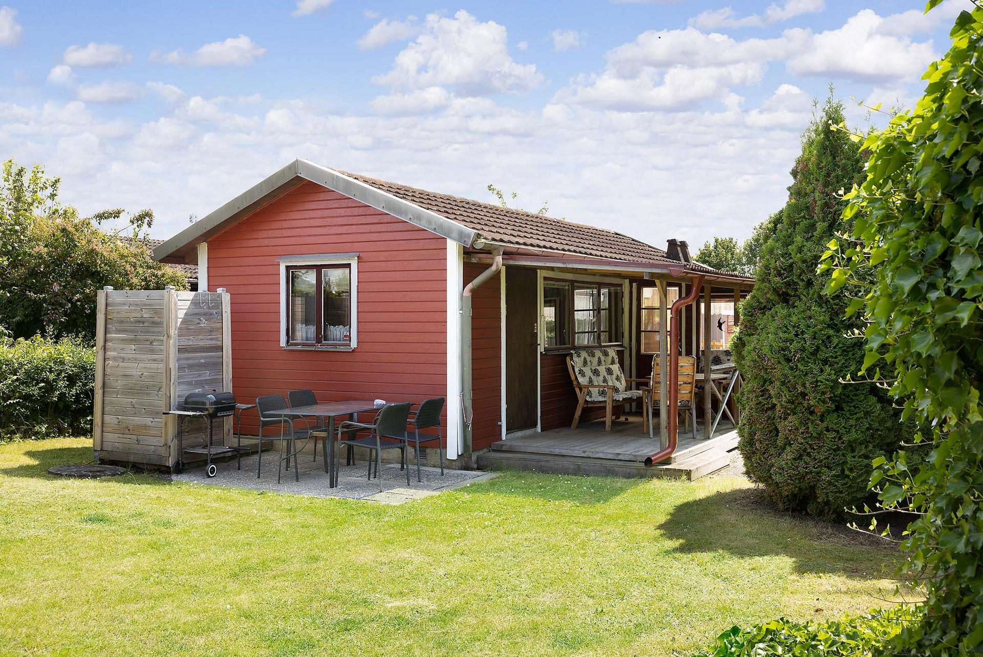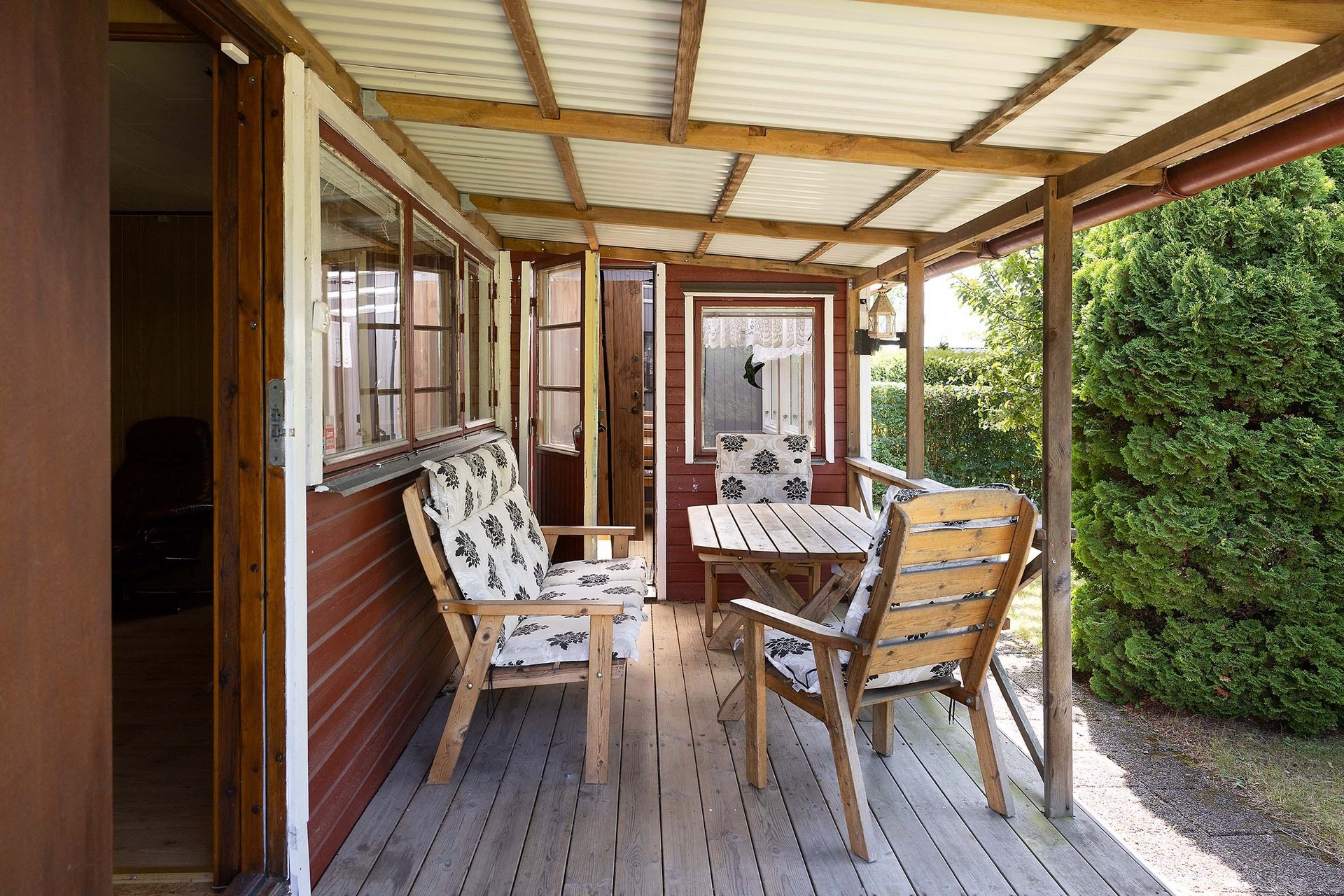 Stugan erbjuder flera härliga uteplatser: en härlig veranda, perfekt som matplats, samt en taktäckt altan med plats för loungemöbler. Här sitter du skyddat med utsikt mot den lummiga trädgården.