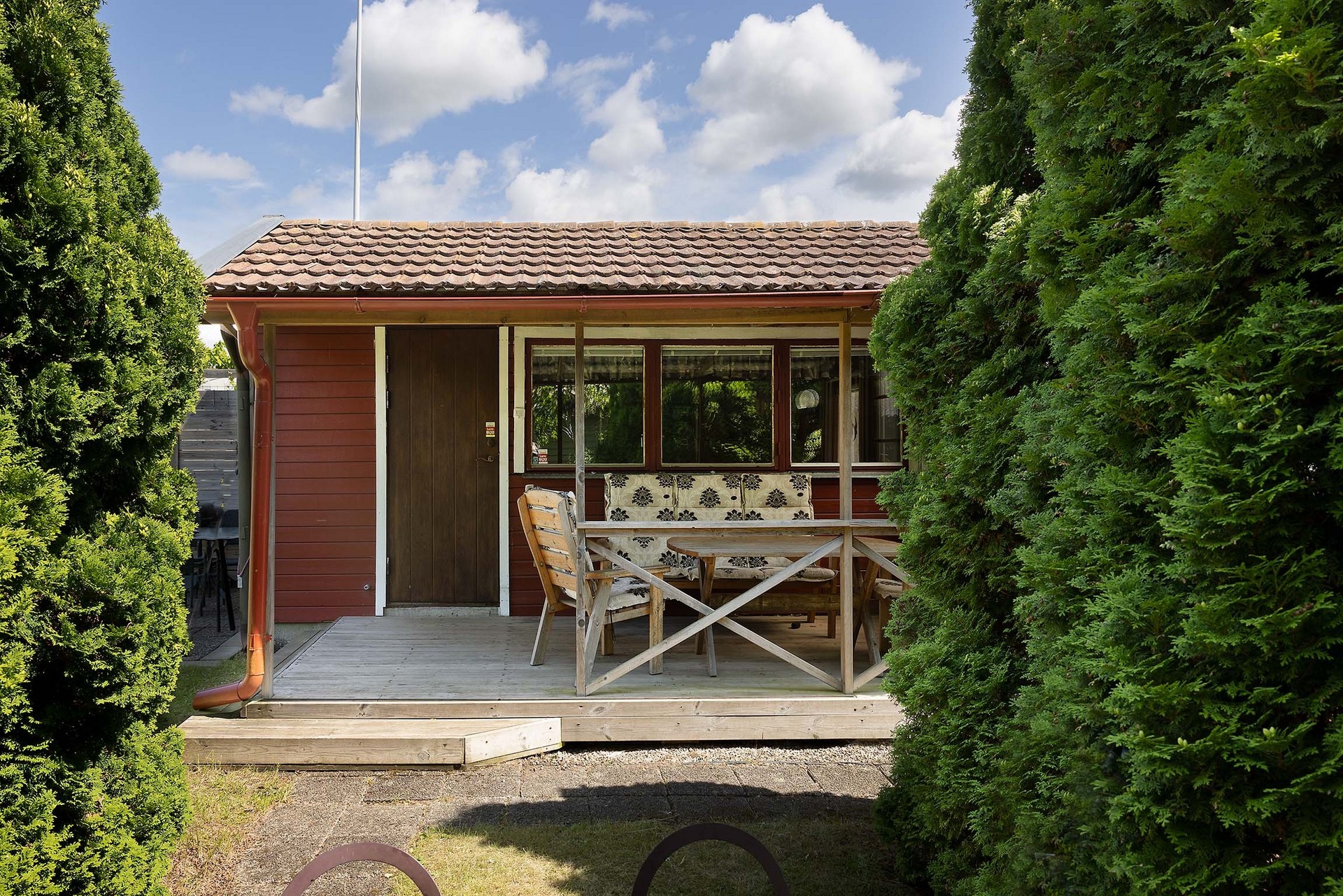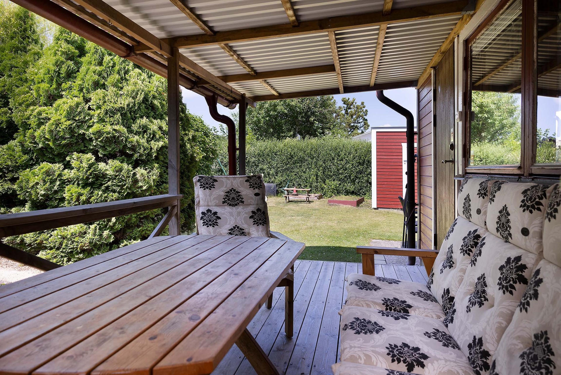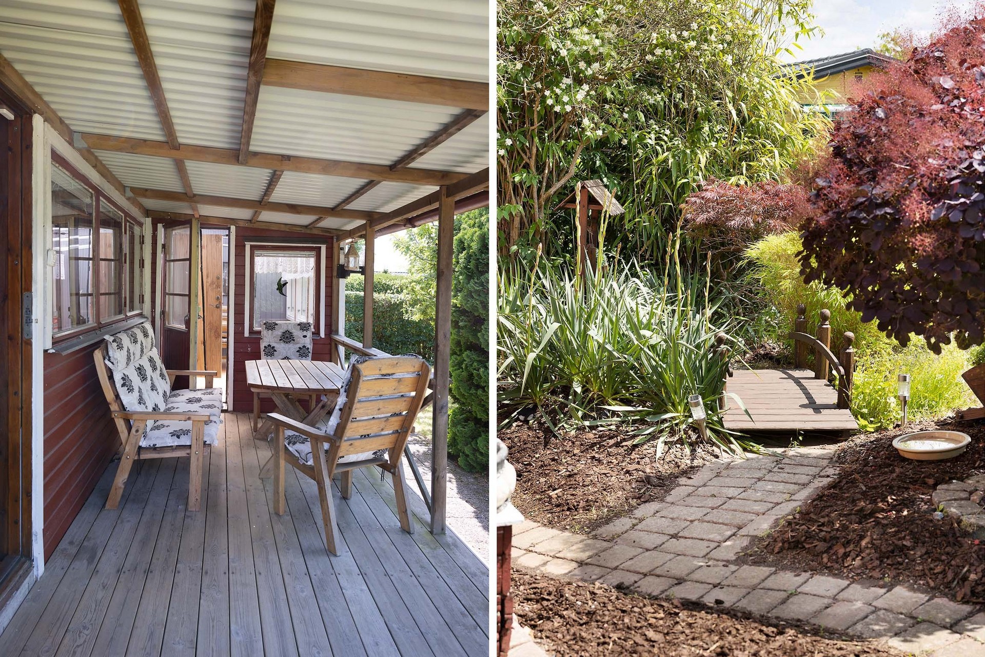 Stugan erbjuder flera härliga uteplatser: en härlig veranda, perfekt som matplats, samt en taktäckt altan med plats för loungemöbler. Här sitter du skyddat med utsikt mot den lummiga trädgården.