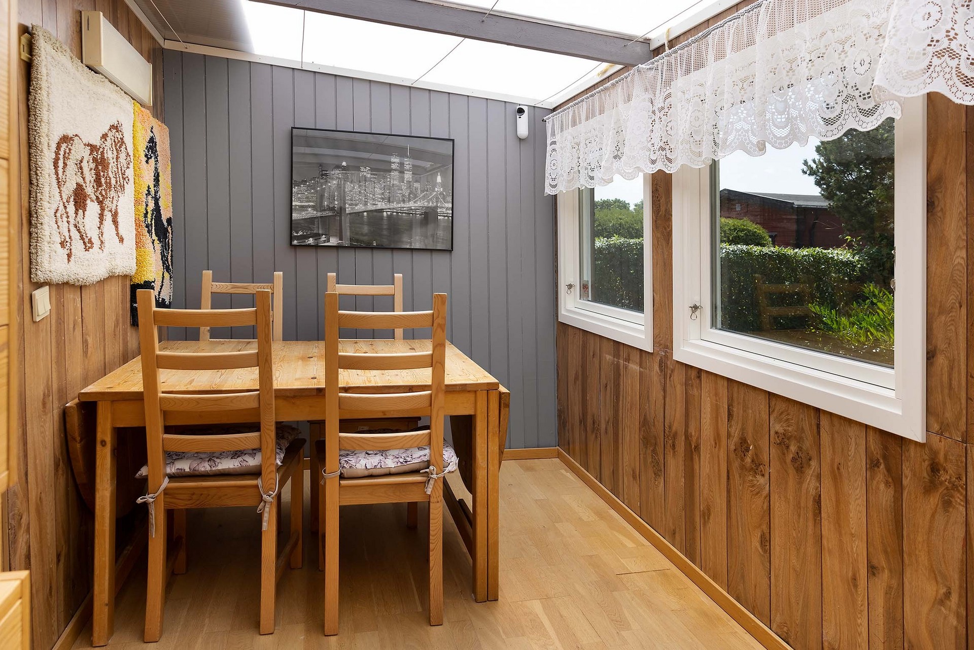 Inbyggd veranda med stora fönster. Används idag som matrum med plats för fyra personer. Utsikt mot trädgården och egen dörr ut till uteplatsen.