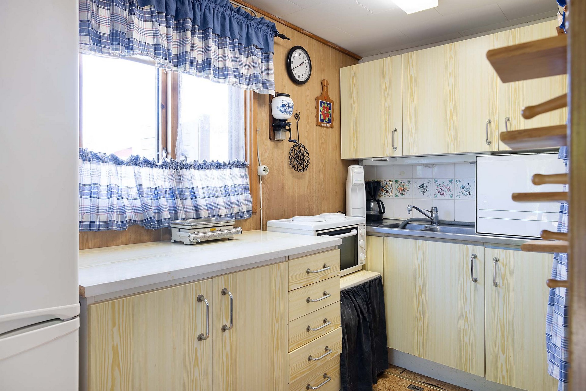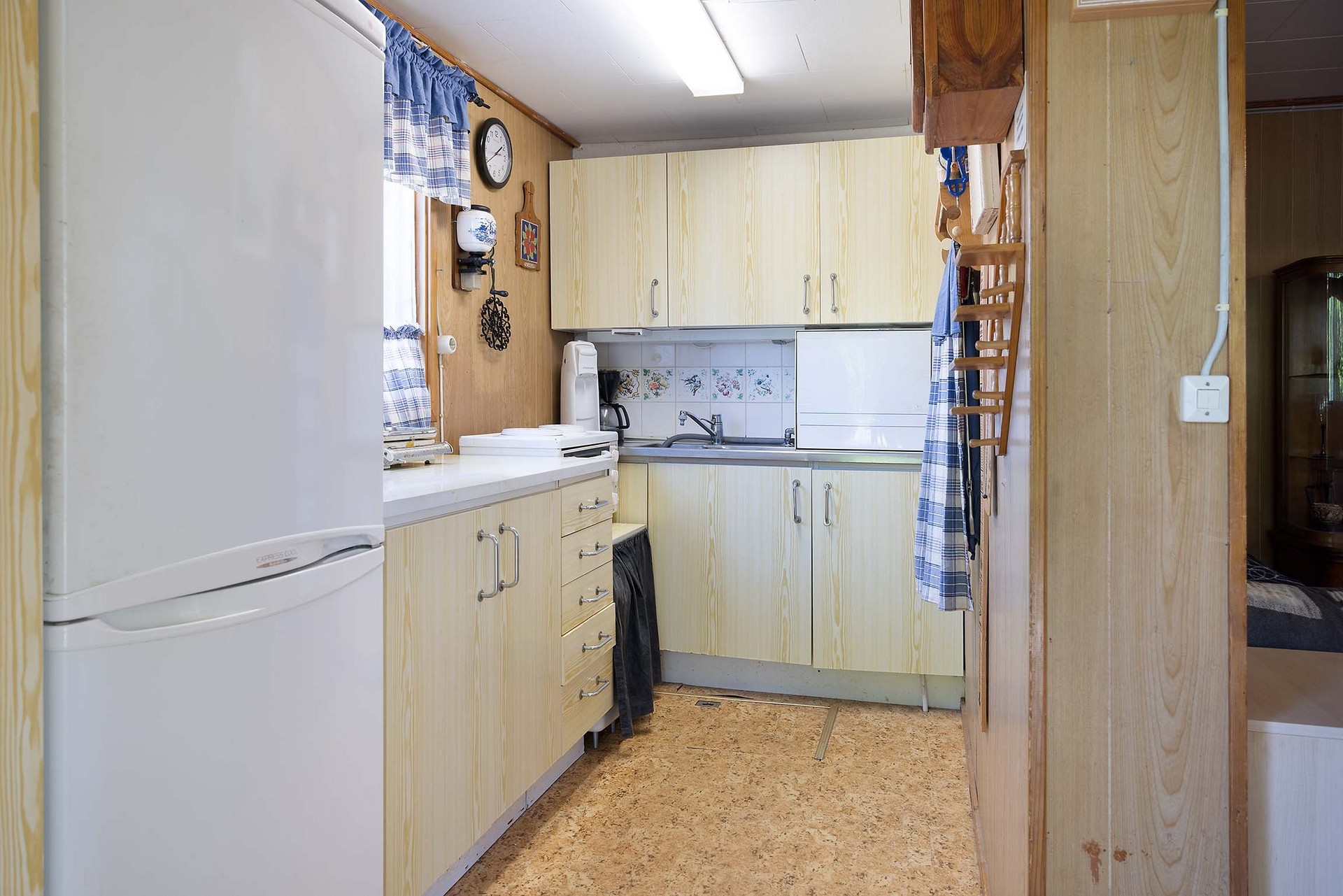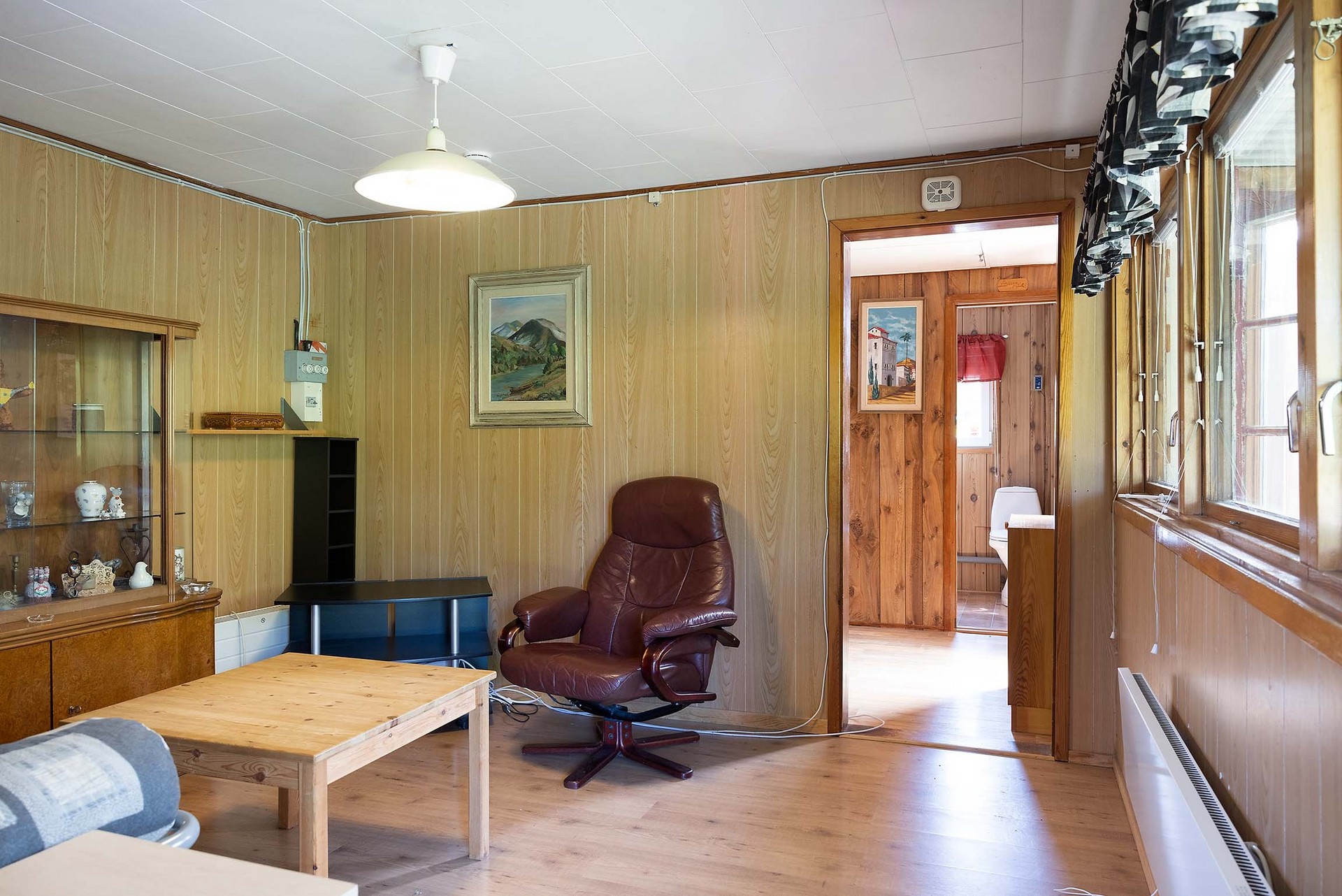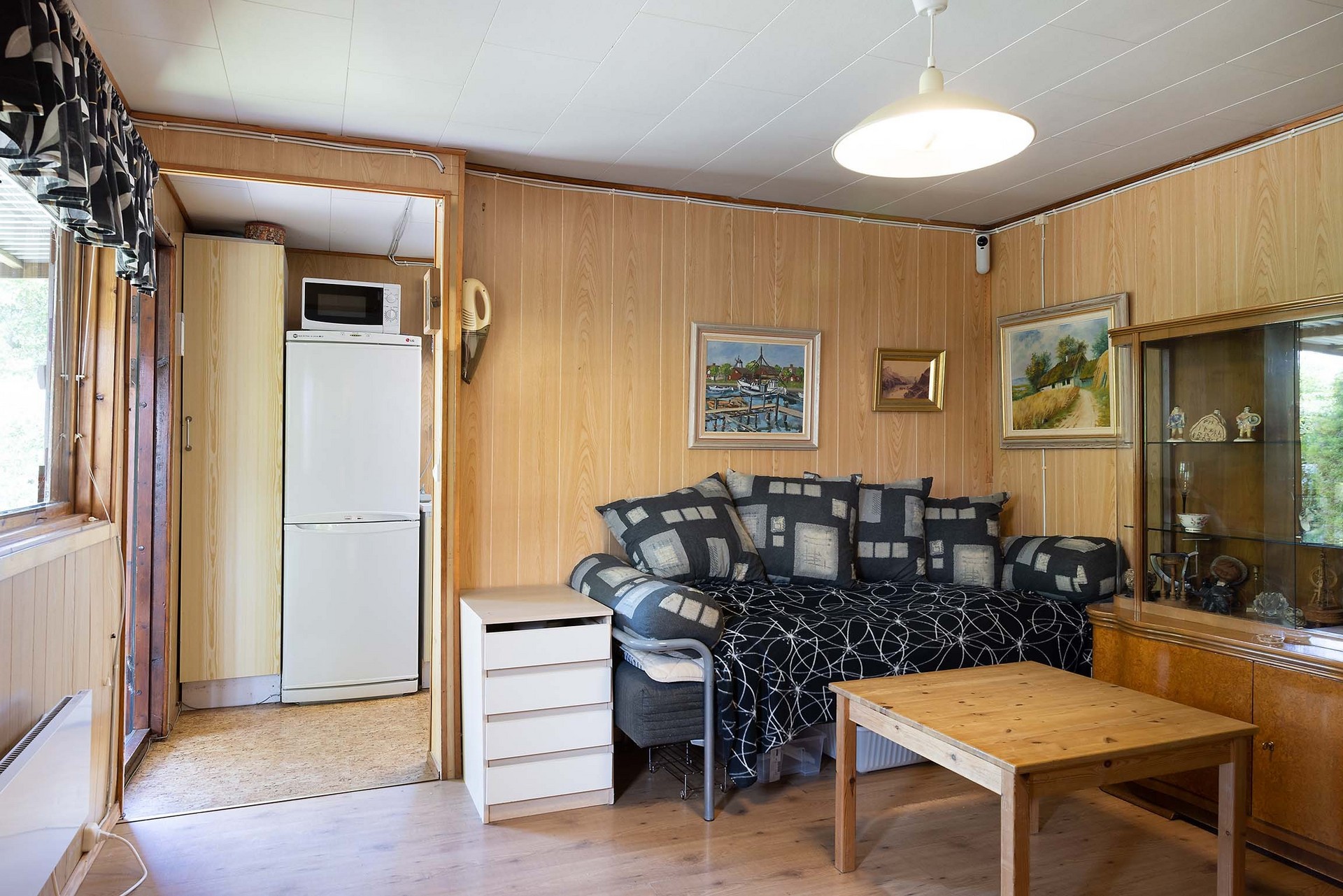 Vardagsrummet är stugans hjärta – ett hemtrevligt rum med plats för soffmöbel fåtölj och bord. Stora fönster vetter mot verandan och släpper in dagsljus, medan träpanel på väggarna, ljust laminatgolv och vitmålat innertak ger en varm och klassisk stugkänsla. Rummet ligger i anslutning till köket.