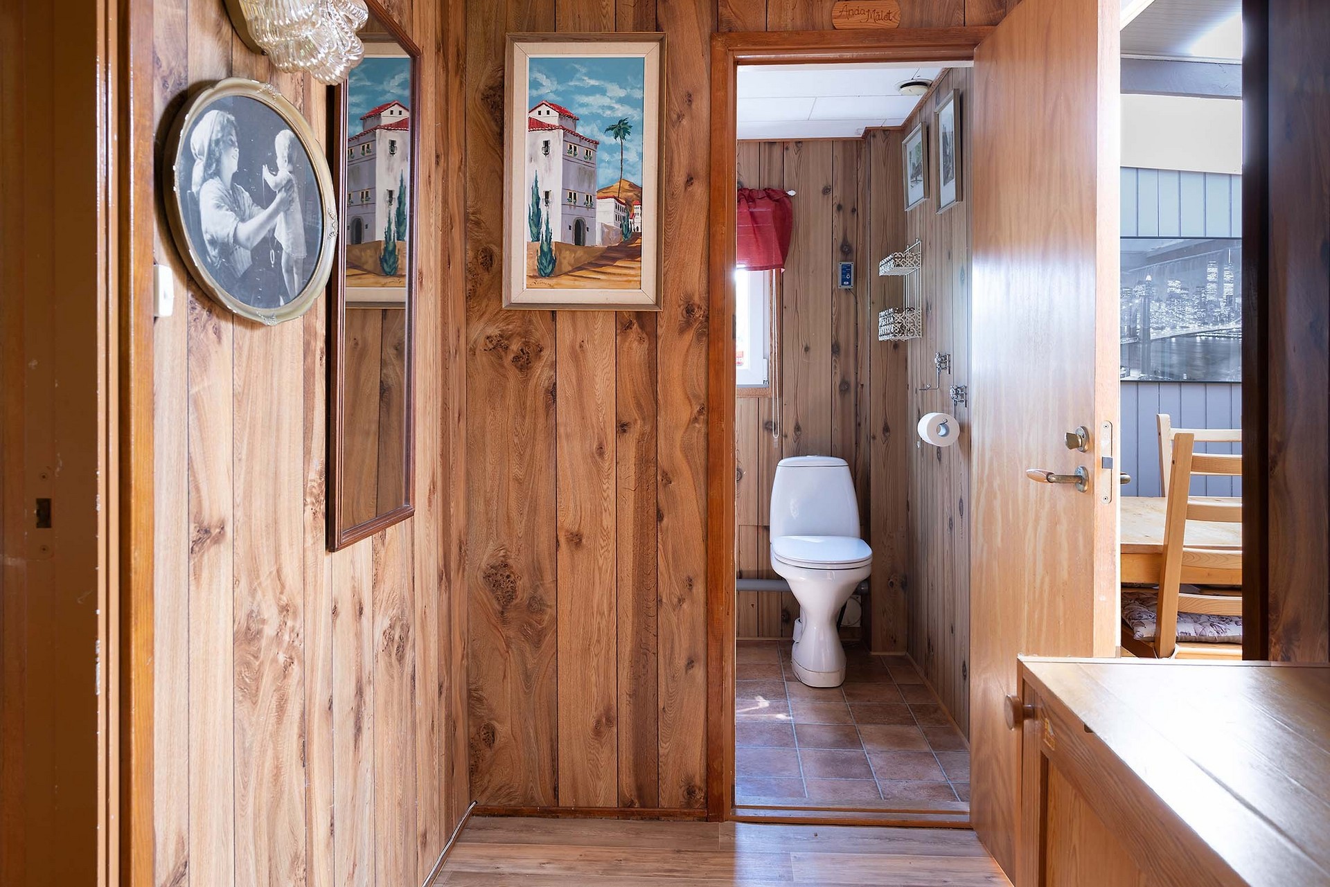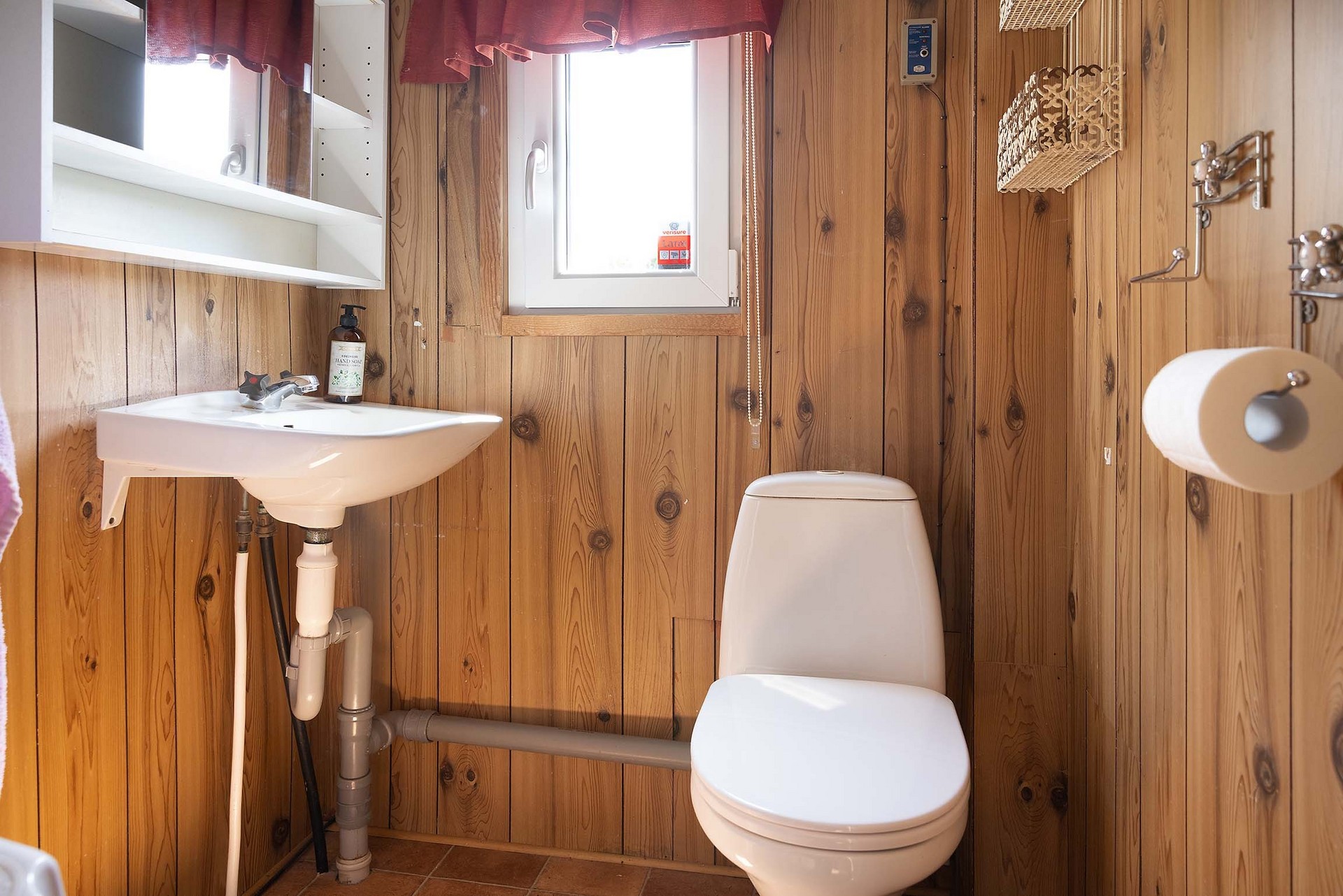 Funktionellt badrum utrustat med toalett, handfat och spegelskåp. Fönster för vädring och naturligt ljus. Inredningen har en rustik karaktär med träpanel på väggarna.