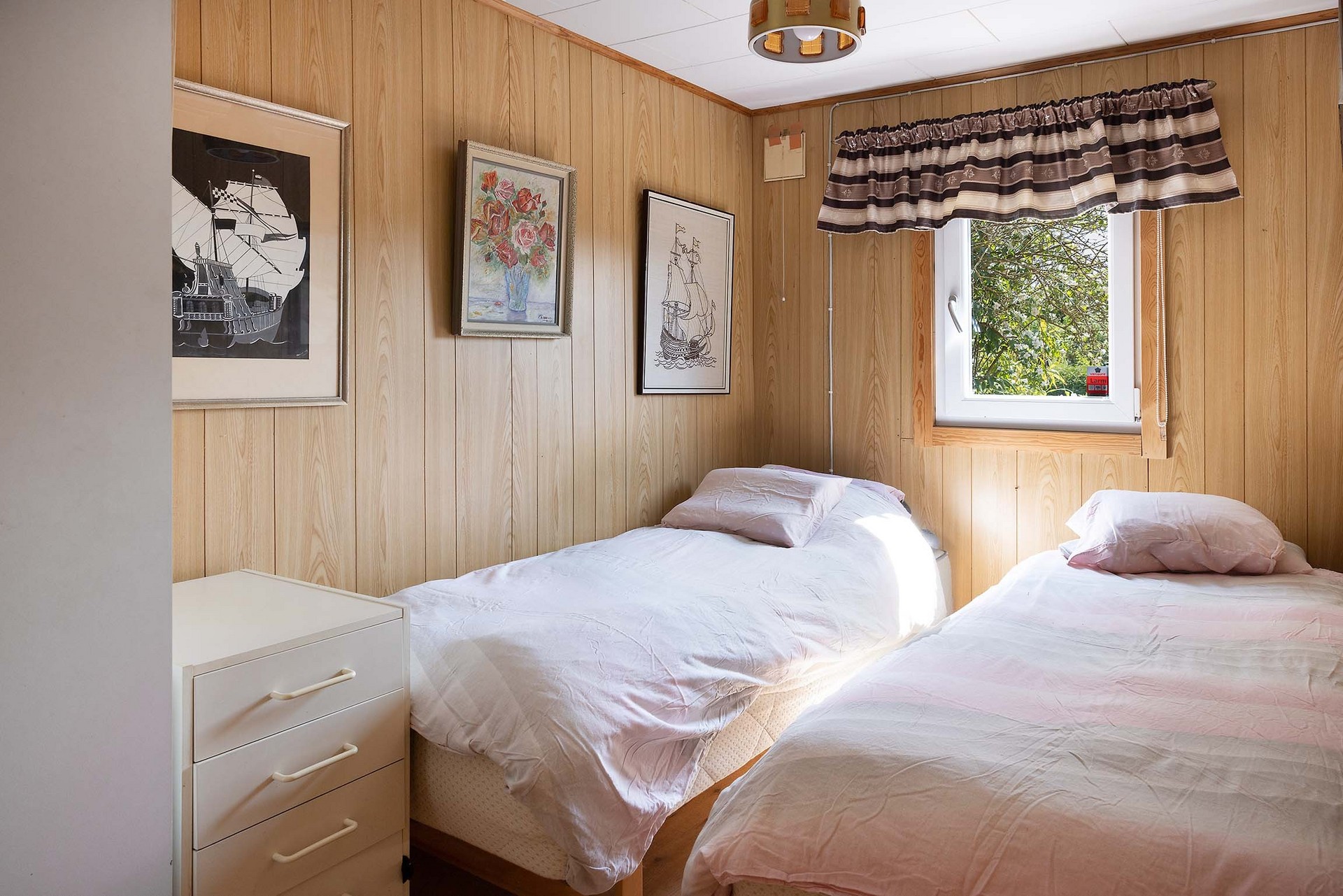 Mysigt sovrum med plats för två enkelsängar, förvaring och fönster mot den grönskande trädgården. Träpanel på väggarna. Rummet ligger i ett avskilt hörn vilket ger en lugn och rofylld sovmiljö.