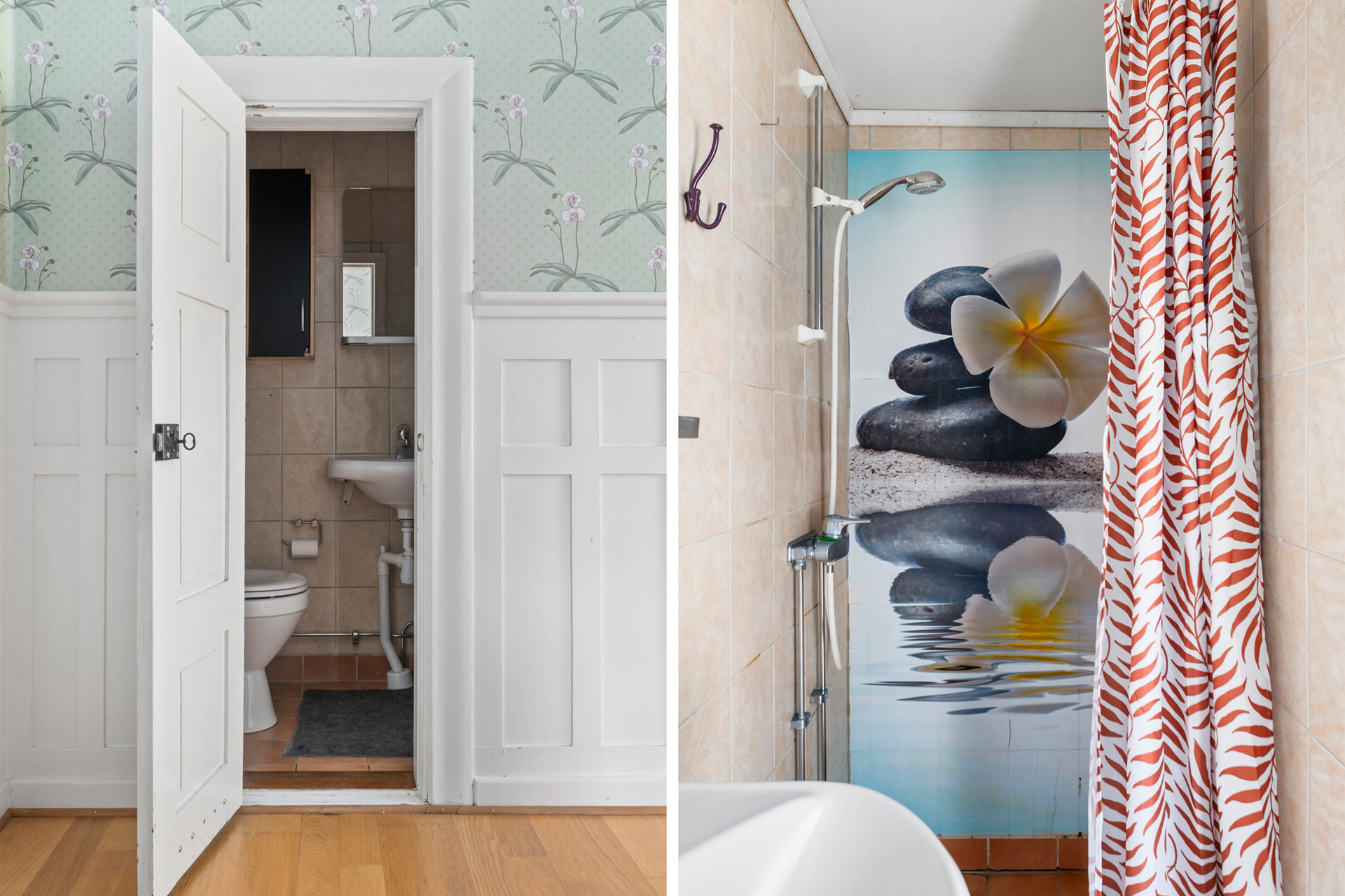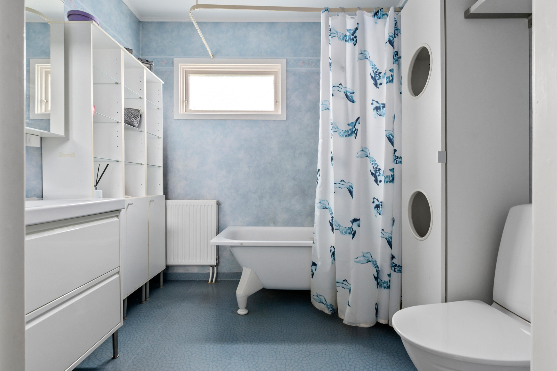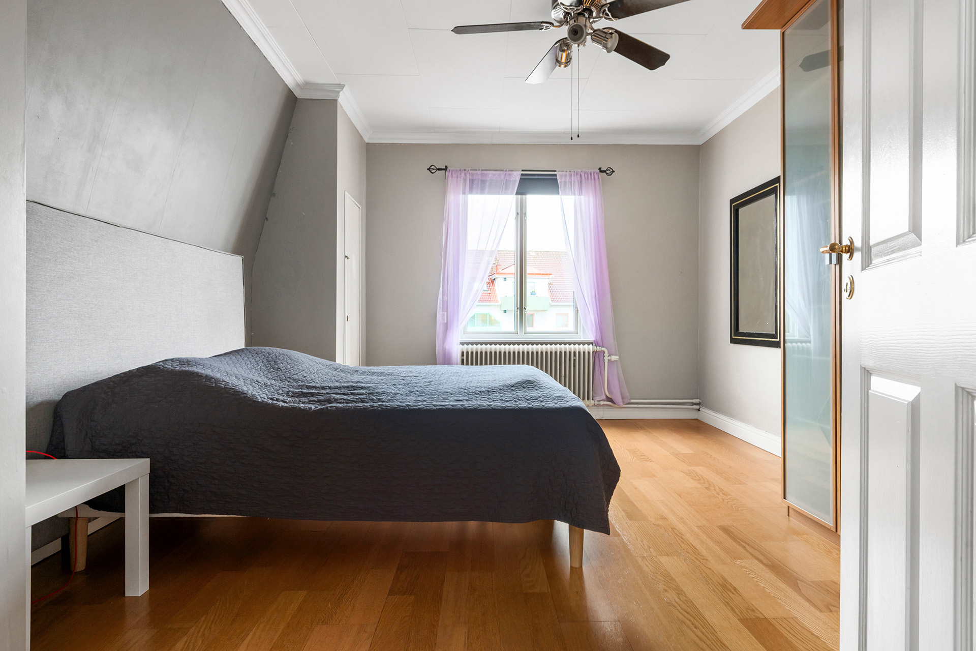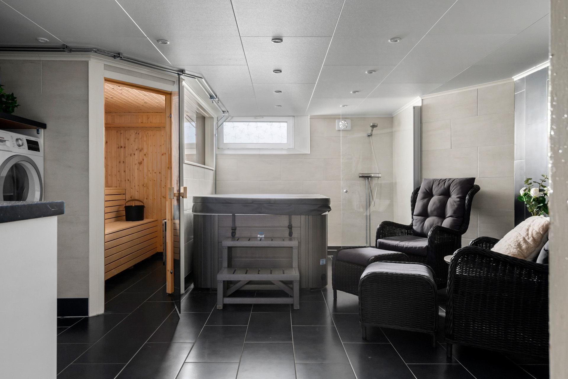Entréplan – Lägenhet Entré via farstukvist till höger. Hall med plats för avhängning och toalett till höger. Vardagsrum med fönster i två väderstreck. Kök med goda arbetsytor och plats för matbord. Utrustat med häll, fläkt, kyl, frys, inbyggnadsugn, inbyggd mikrovågsugn och diskmaskin. Fyra sovrum i varierande storlek. Badrum utrustat med badkar, handfat i kommod, WC och våtrumsmatta. Utgång till altandäck och trädgård från entréplanet. Övre plan – Lägenhet med separat entré Entré via farstukvist till vänster, med hall och plats för ytterkläder. Från hallen nås trappa ned till källaren samt trappa upp till lägenheten. Kök med matplats och arbetsytor. Utrustat med spis, fläkt, kyl och frys. Vardagsrum med utgång till balkong mot framsidan. Ett mindre rum som kan nyttjas som arbetsrum. Sovrum samt badrum med dusch och WC. Trappa leder vidare upp till oinredd vind. Källarplan Källarplanet rymmer flera förrådsutrymmen med putsade väggar och målade betonggolv. Här finns goda möjligheter till förvaring av hushållsartiklar, verktyg och säsongsutrustning. Flera rum har mindre fönster som ger dagsljusinsläpp. Tvättstuga utrustad med två tvättmaskiner, torktumlare och arbetsyta. I anslutning finns även bastu, jacuzzi och dusch. Källaren nås via trappa från entréplan samt utifrån via dörr mot uppfarten. Här finns även ett separat utrymme med wc.