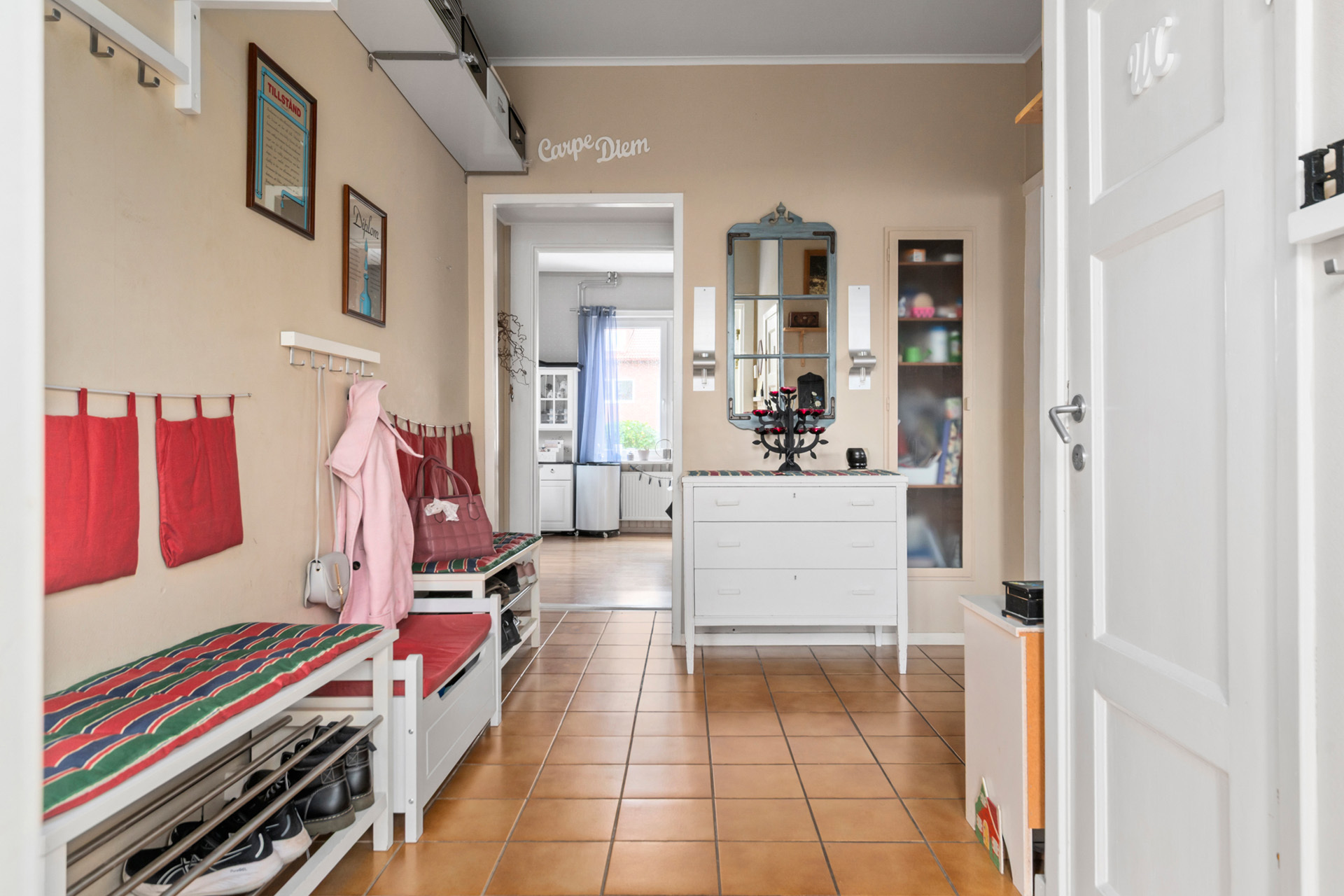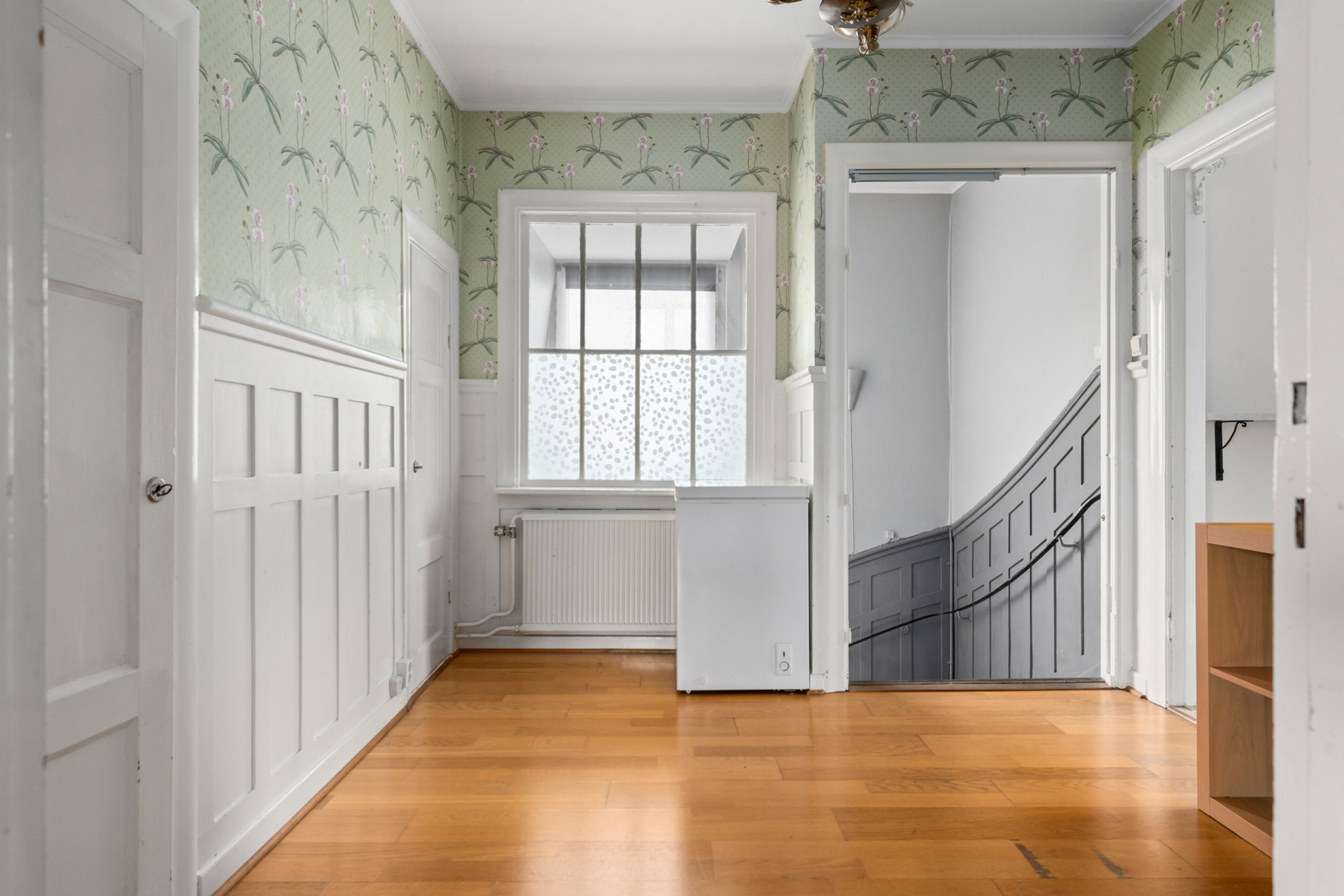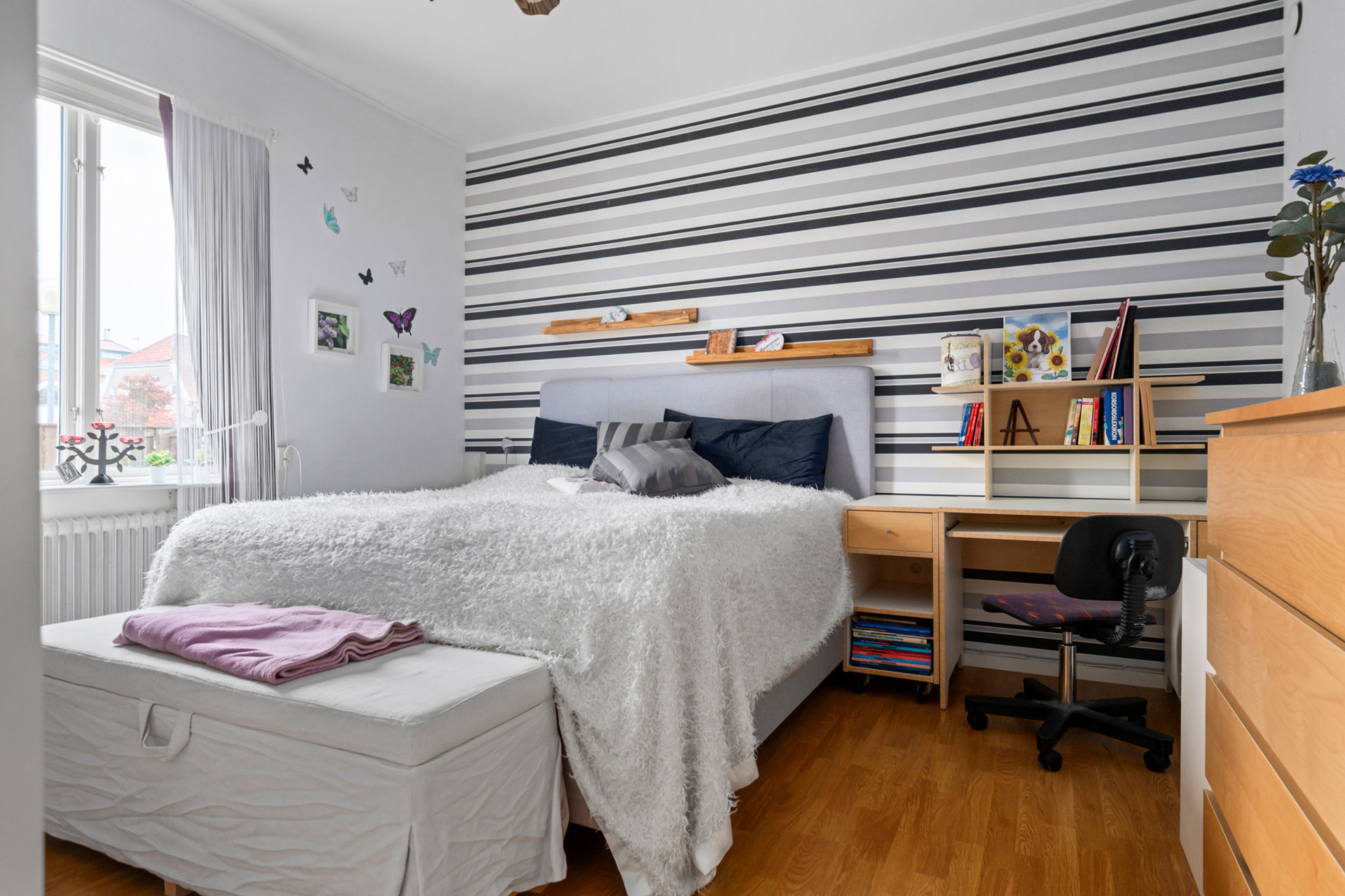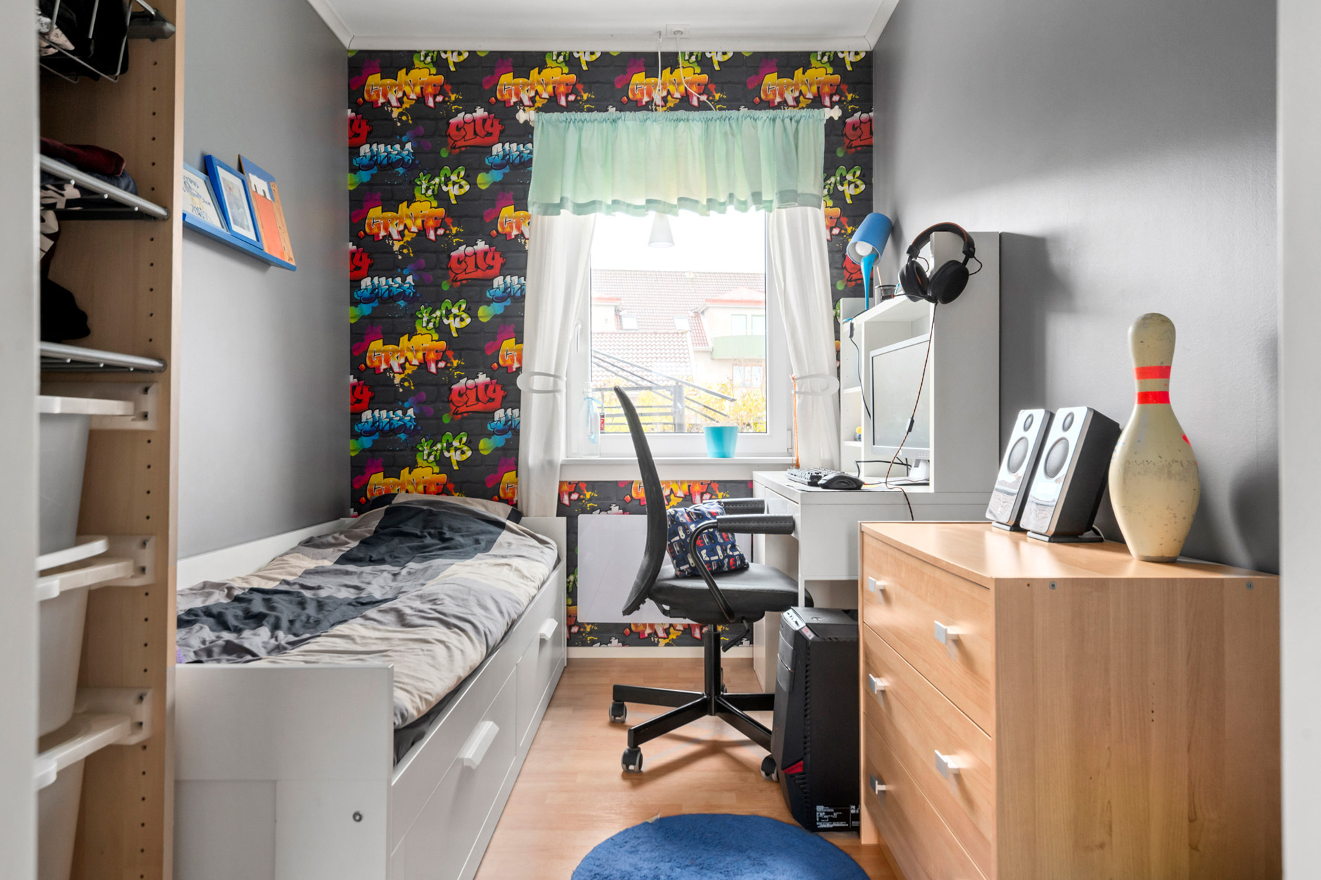Entréplan – Lägenhet Entré via farstukvist till höger. Hall med plats för avhängning och toalett till höger. Vardagsrum med fönster i två väderstreck. Kök med goda arbetsytor och plats för matbord. Utrustat med häll, fläkt, kyl, frys, inbyggnadsugn, inbyggd mikrovågsugn och diskmaskin. Fyra sovrum i varierande storlek. Badrum utrustat med badkar, handfat i kommod, WC och våtrumsmatta. Utgång till altandäck och trädgård från entréplanet. Övre plan – Lägenhet med separat entré Entré via farstukvist till vänster, med hall och plats för ytterkläder. Från hallen nås trappa ned till källaren samt trappa upp till lägenheten. Kök med matplats och arbetsytor. Utrustat med spis, fläkt, kyl och frys. Vardagsrum med utgång till balkong mot framsidan. Ett mindre rum som kan nyttjas som arbetsrum. Sovrum samt badrum med dusch och WC. Trappa leder vidare upp till oinredd vind. Källarplan Källarplanet rymmer flera förrådsutrymmen med putsade väggar och målade betonggolv. Här finns goda möjligheter till förvaring av hushållsartiklar, verktyg och säsongsutrustning. Flera rum har mindre fönster som ger dagsljusinsläpp. Tvättstuga utrustad med två tvättmaskiner, torktumlare och arbetsyta. I anslutning finns även bastu, jacuzzi och dusch. Källaren nås via trappa från entréplan samt utifrån via dörr mot uppfarten. Här finns även ett separat utrymme med wc.