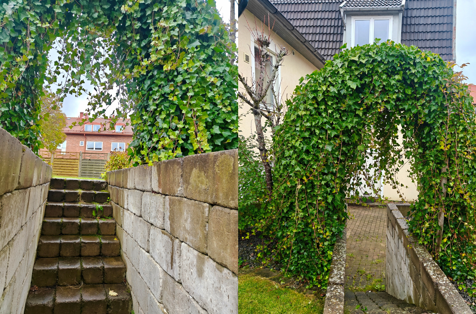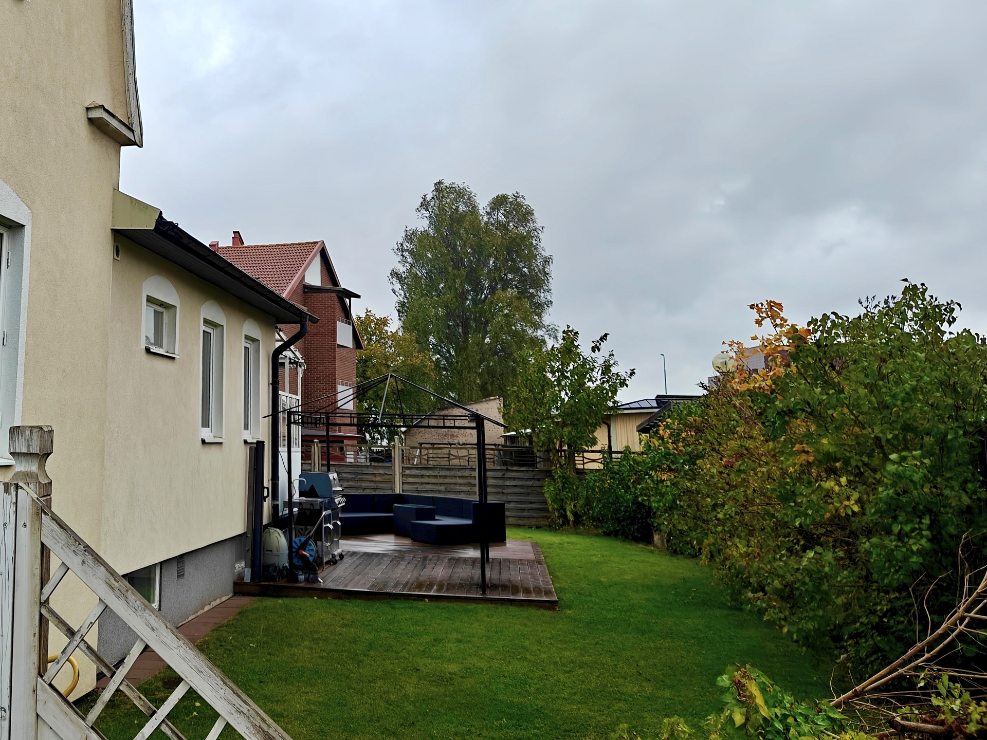 Trädgårdstomt med gräsyta på baksidan och trädäck med plats för matbord och sittgrupp. Altandäck i anslutning till bostadens baksida samt mindre balkong mot framsidan.