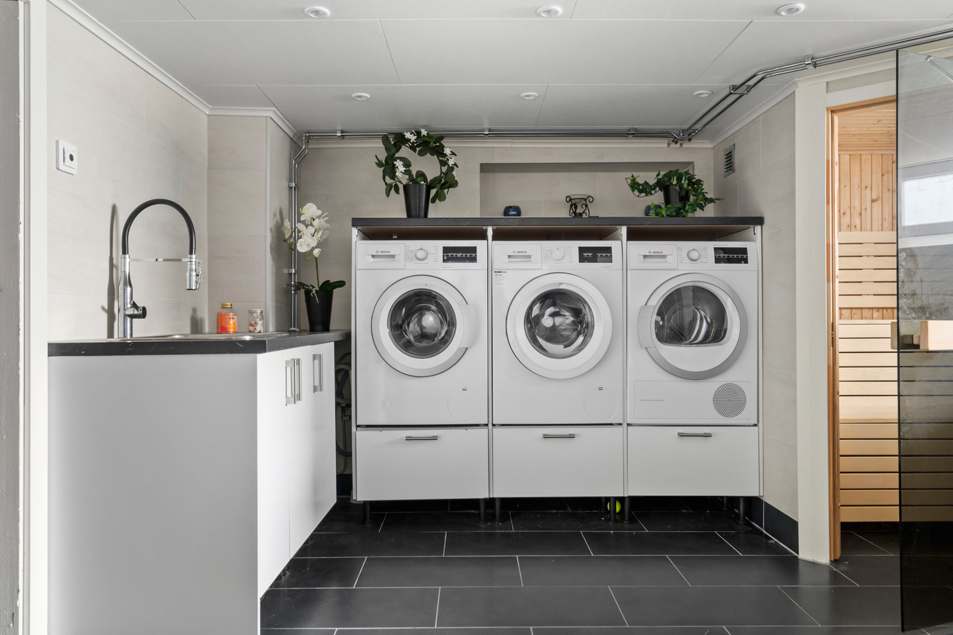 - Asfalterad uppfart med plats för flera bilar. Garage i källarplan med plats för två bilar.