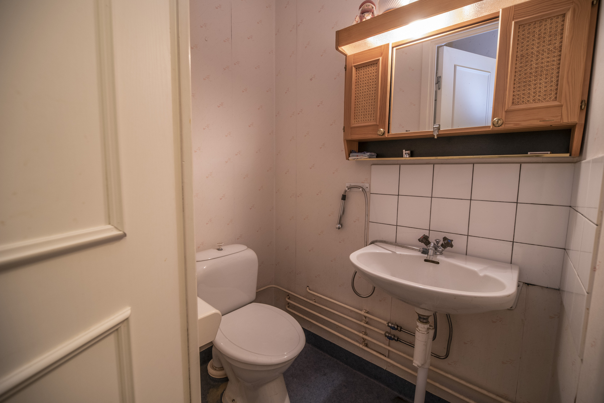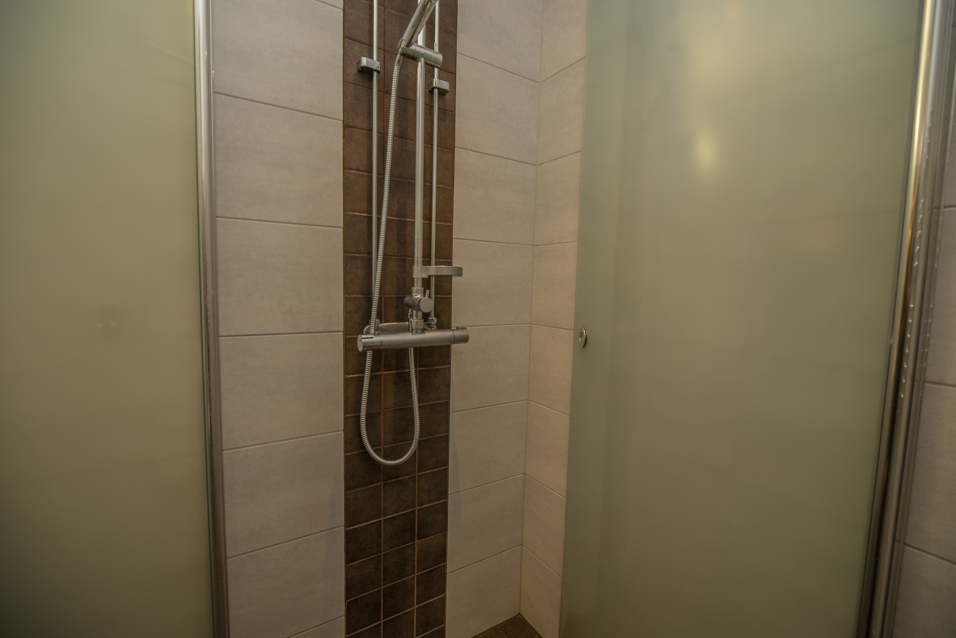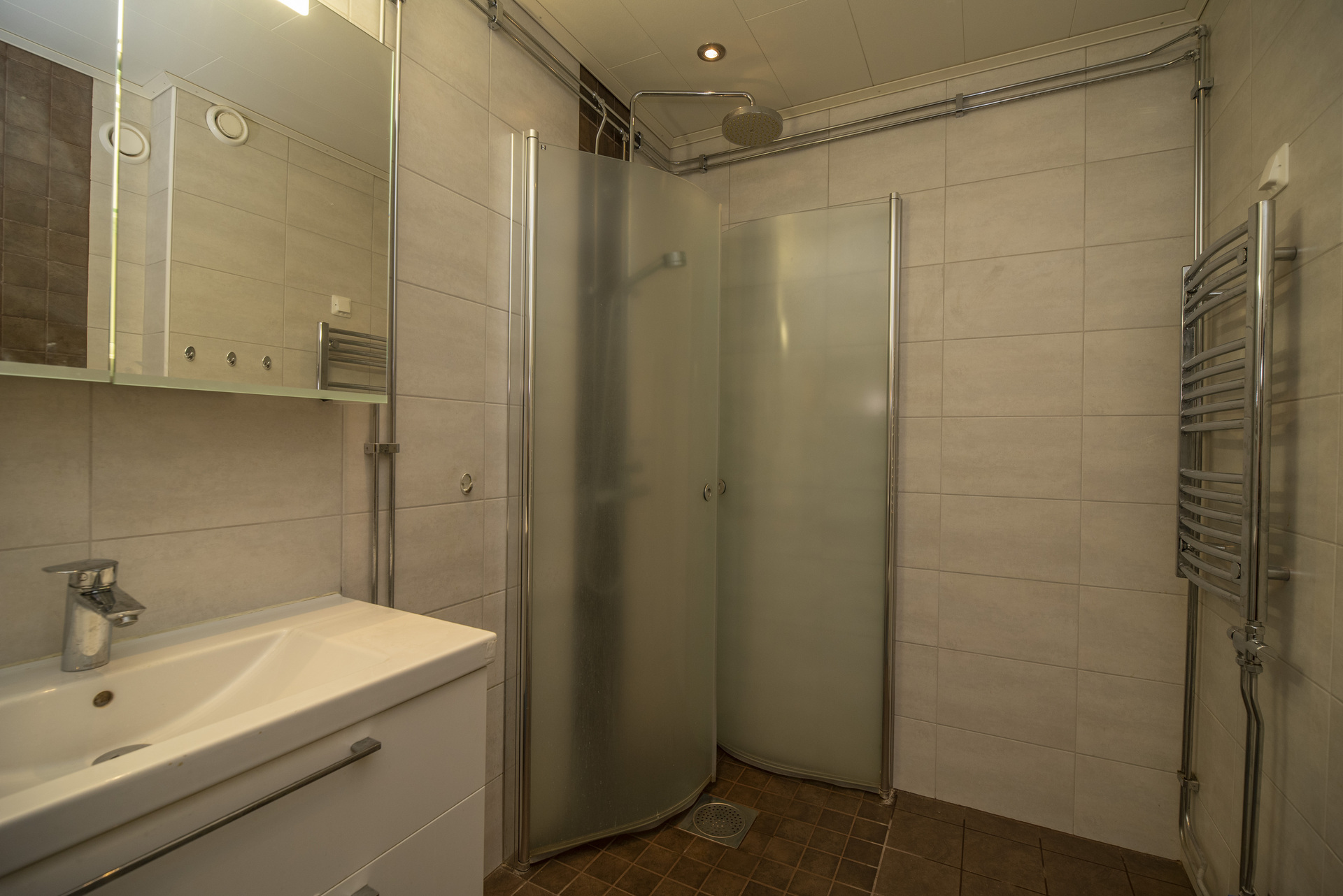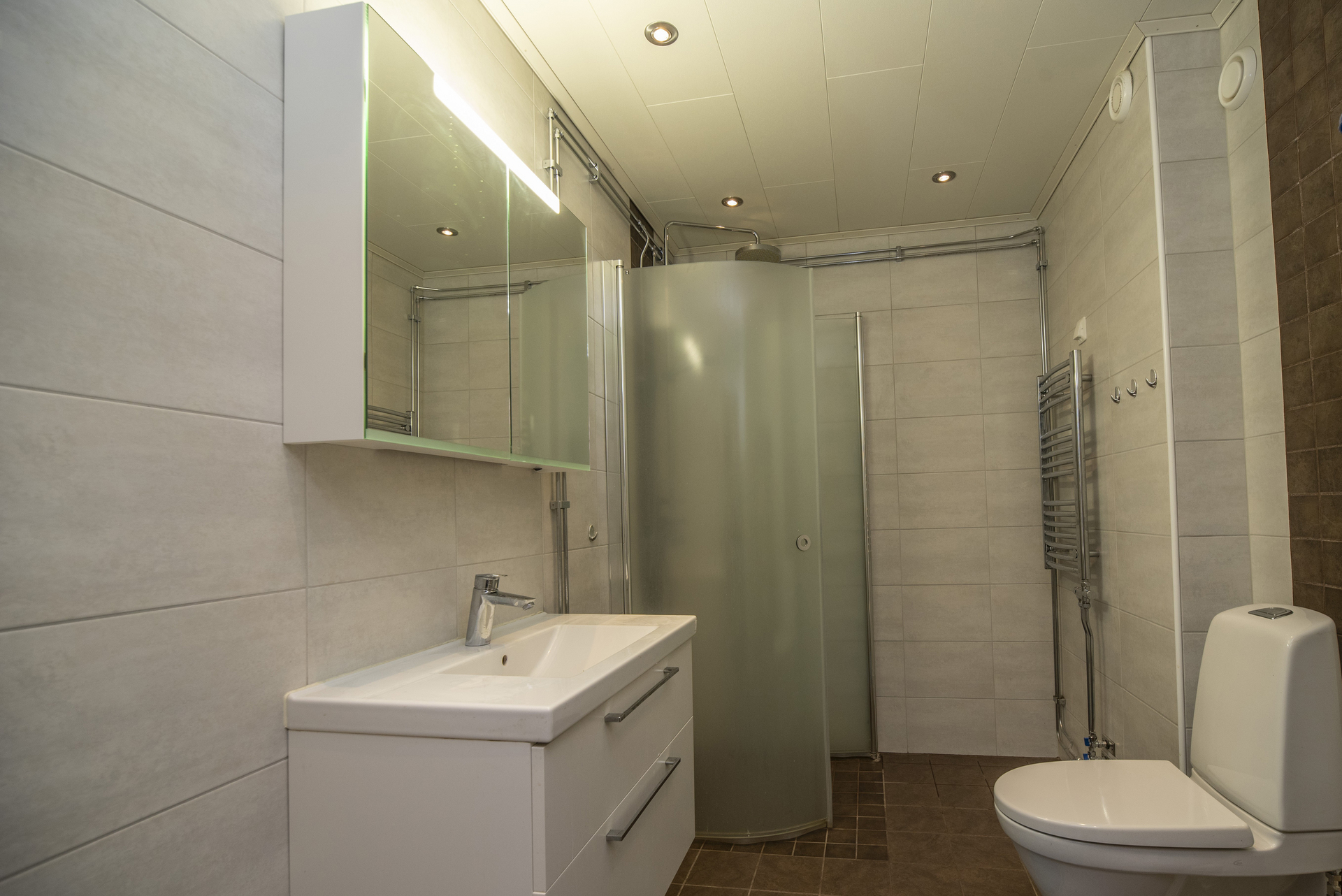 Kakel/ klinker utförande med golvvärme och utrymme för tvättmaskin & torktumlare. Badrumsmöbel med handfat & förvaring. WC, handdukstork och duschhörna.