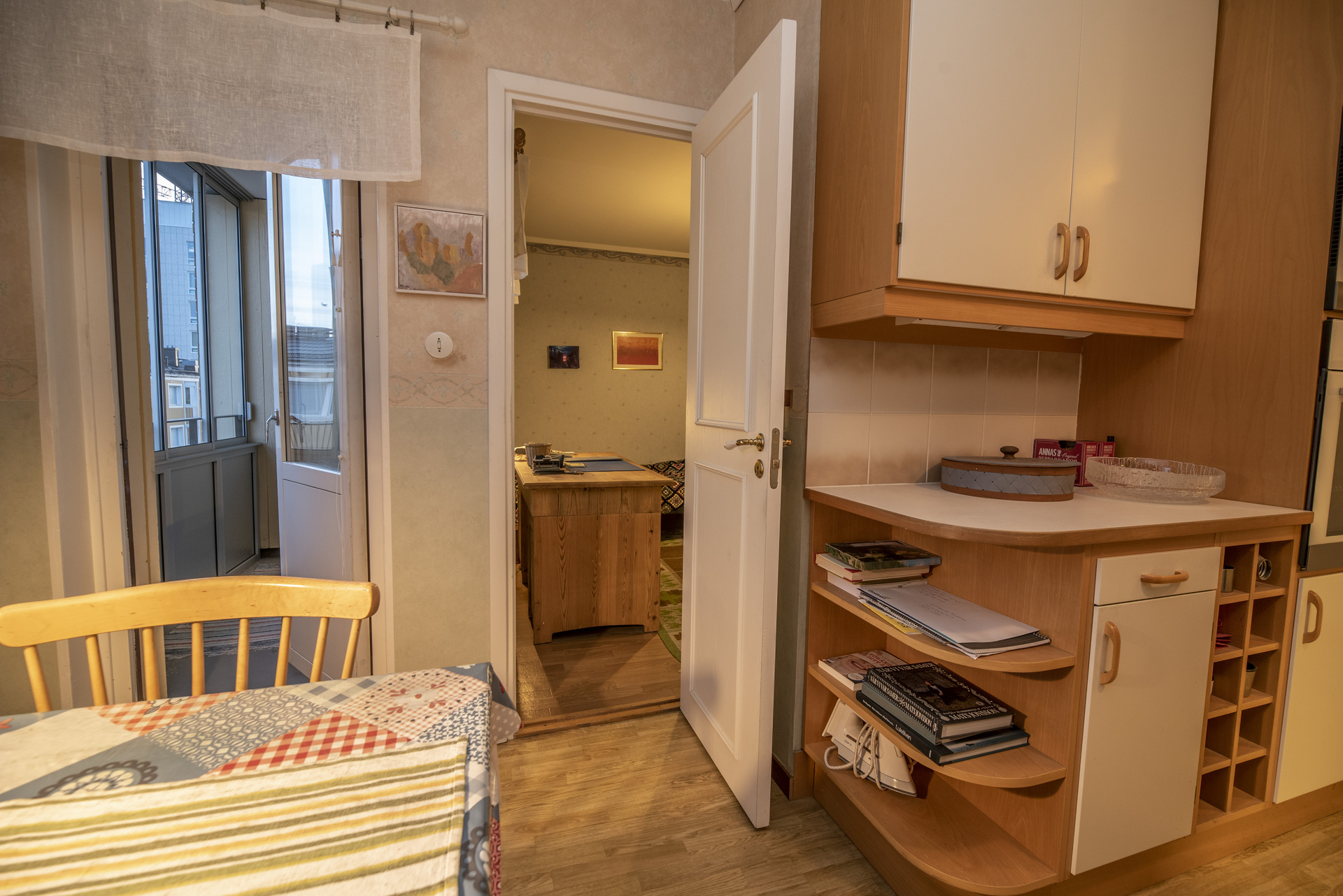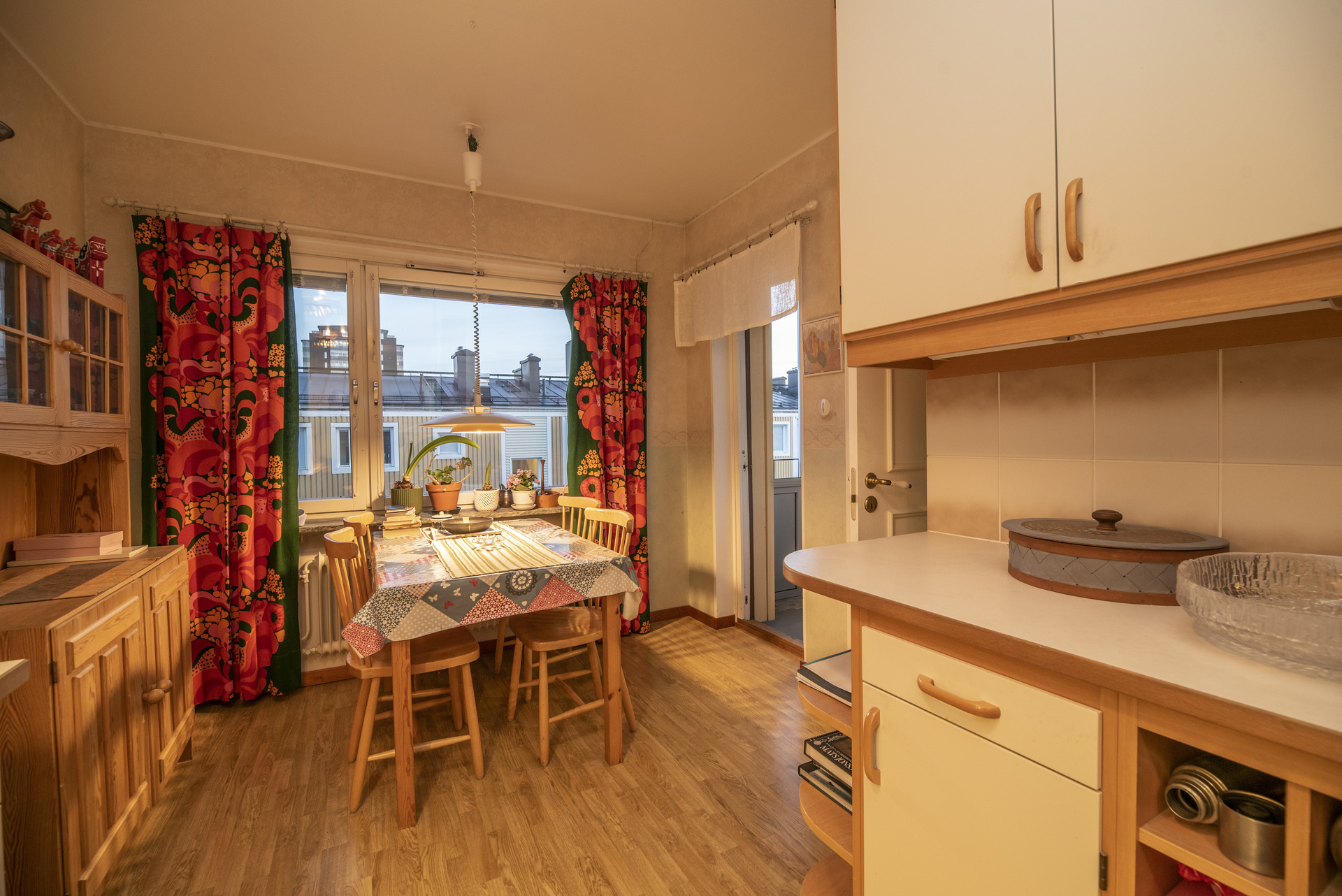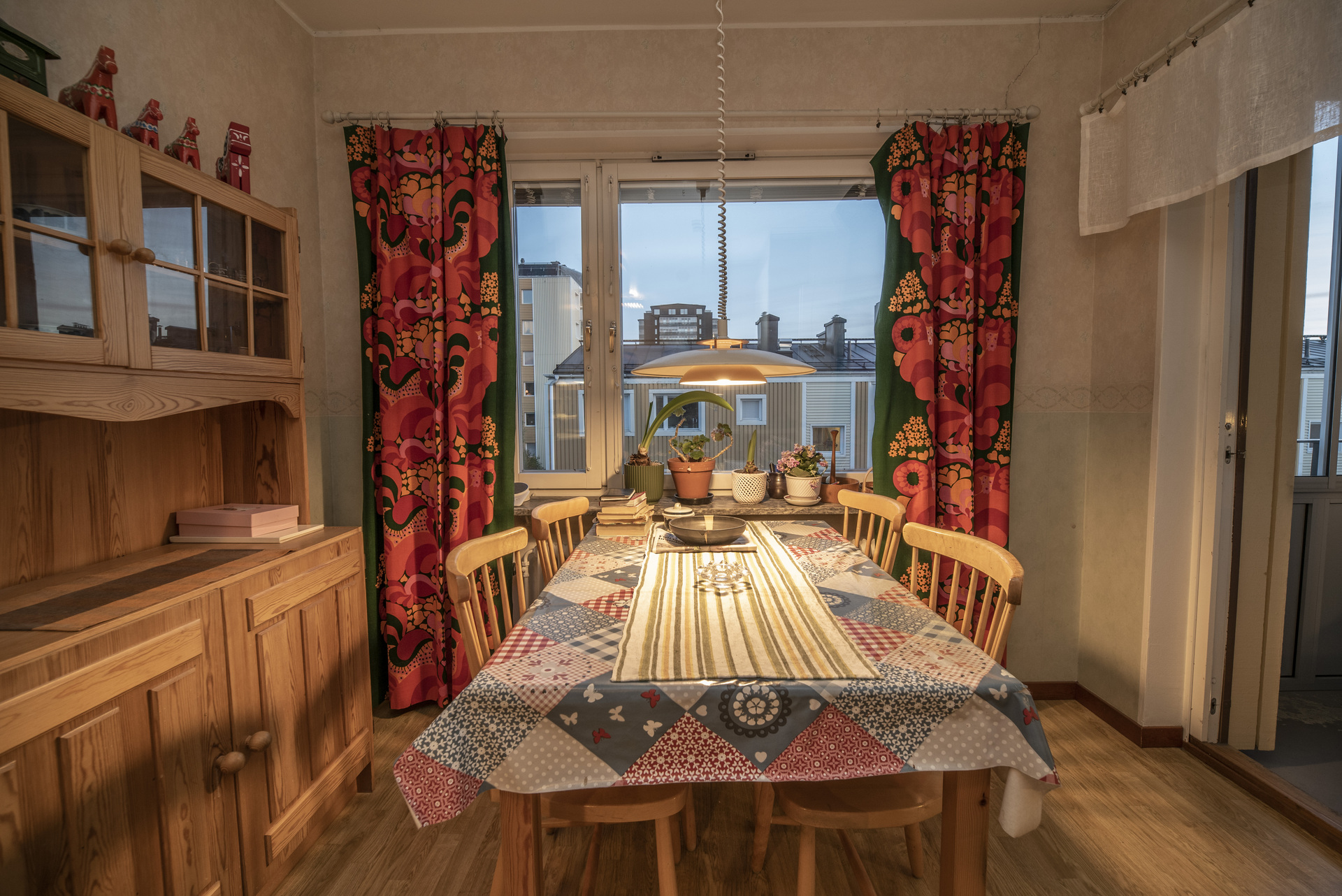 Matplats i kök - inglasad balkong i bakgrund t.h