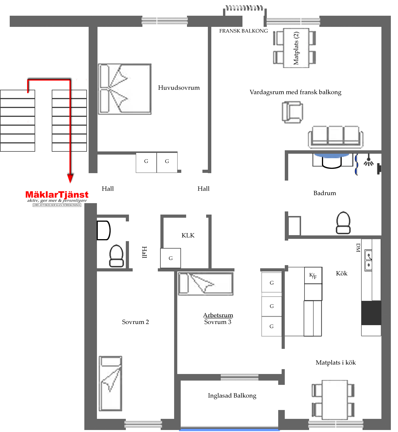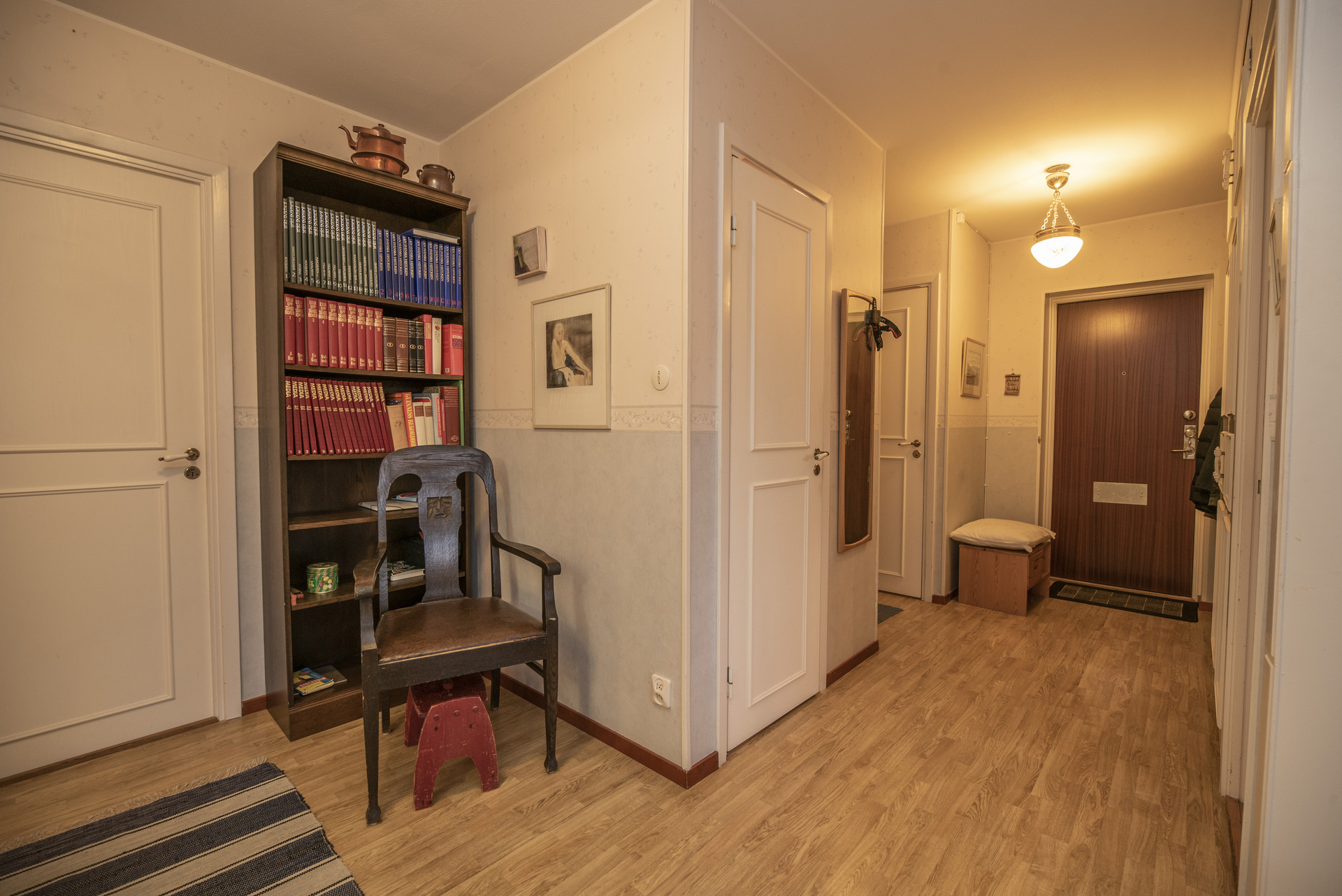 Entré till möblerbar hall i vinkel med klädförvaring & klädkammare med vapenskåp. Gästtoalett till höger med sovrum 2 längre ner i hallen. Rakt fram hittar du passage till Huvudsovrummet till vänster med fönster ut över innergården. Fortsätt framåt så öppnar bostaden upp till vardagsrummet med fransk balkong (över innergården) till vänster, badrum rakt fram samt arbetsrum/ sovrum 3 till höger samt passage till kök med matplats & den inglasade balkongen.
