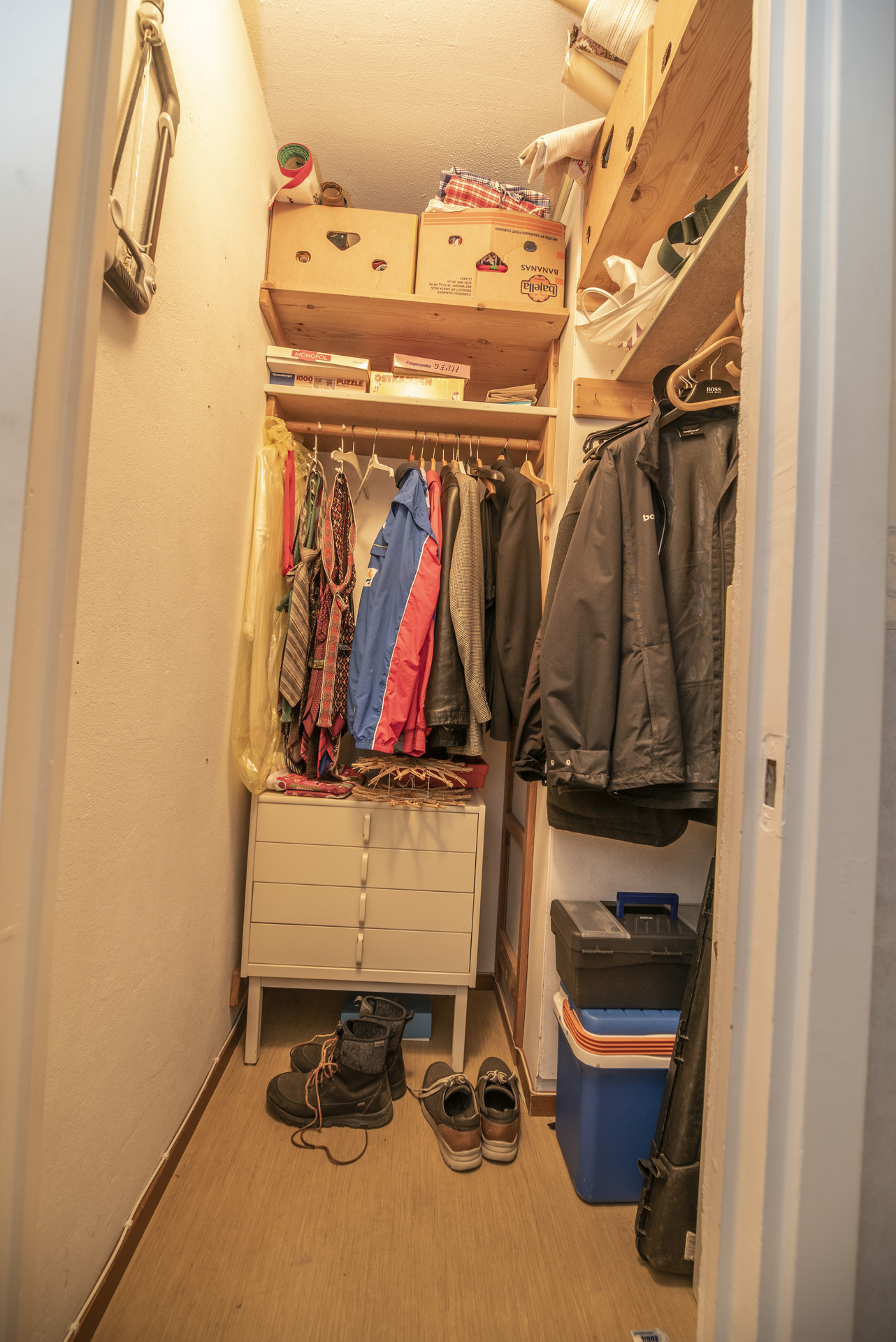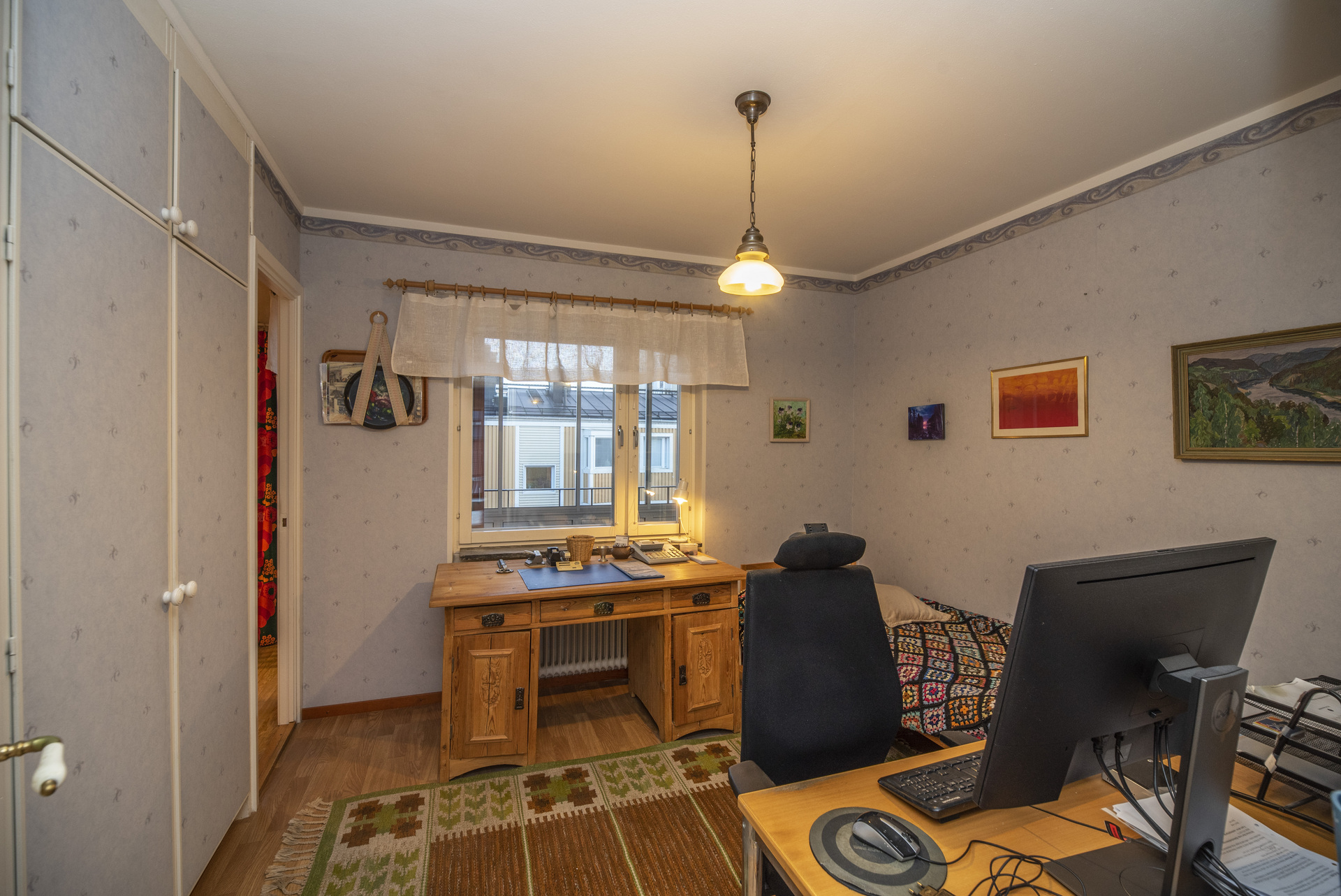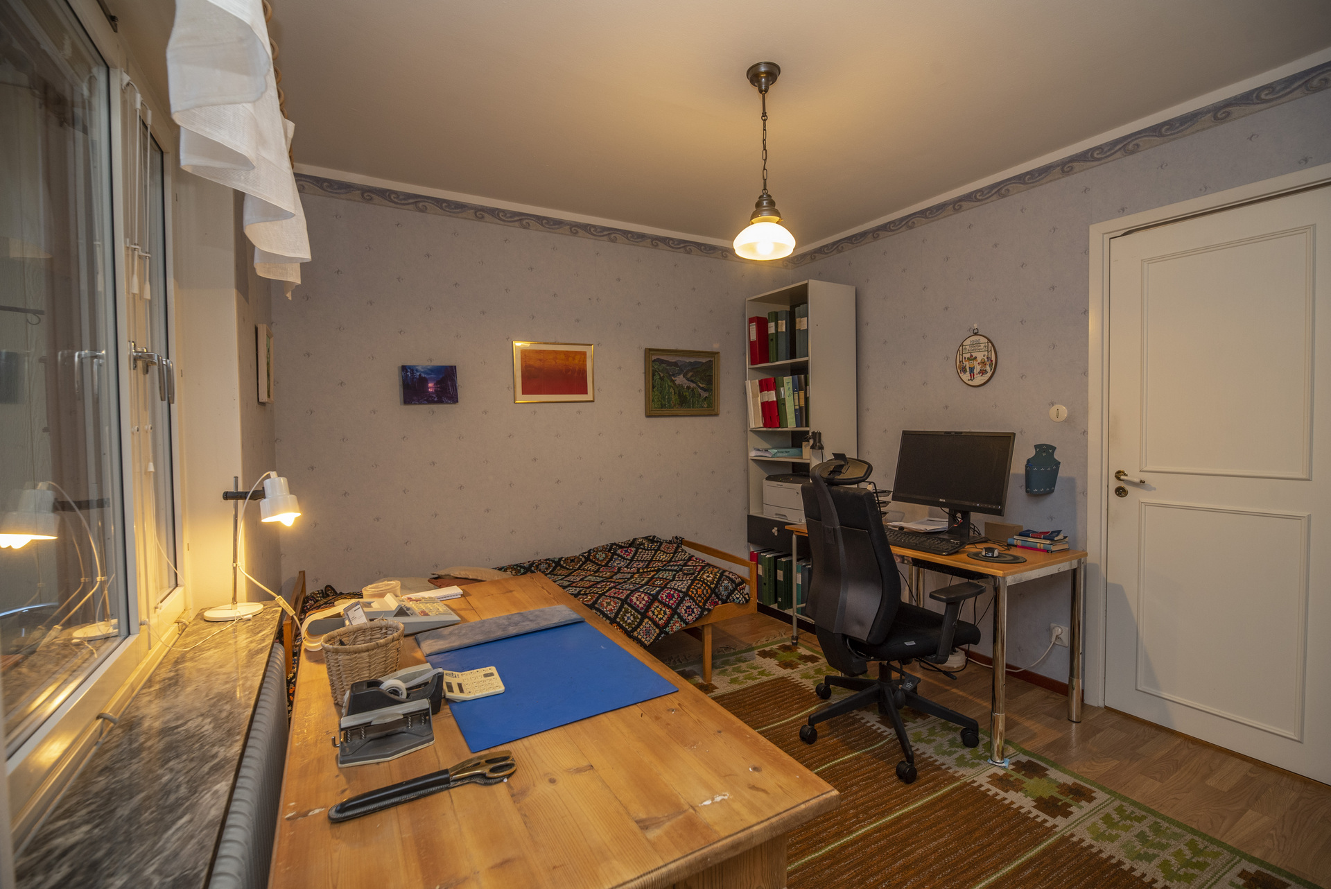 Arbetsrum/ hemmakontor mellan hall och kök. Garderober. Fönster mot inglasad balkong.