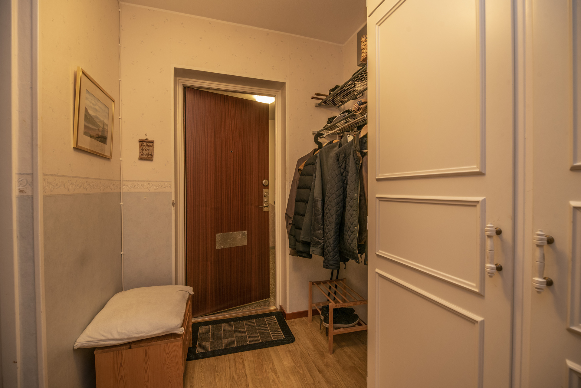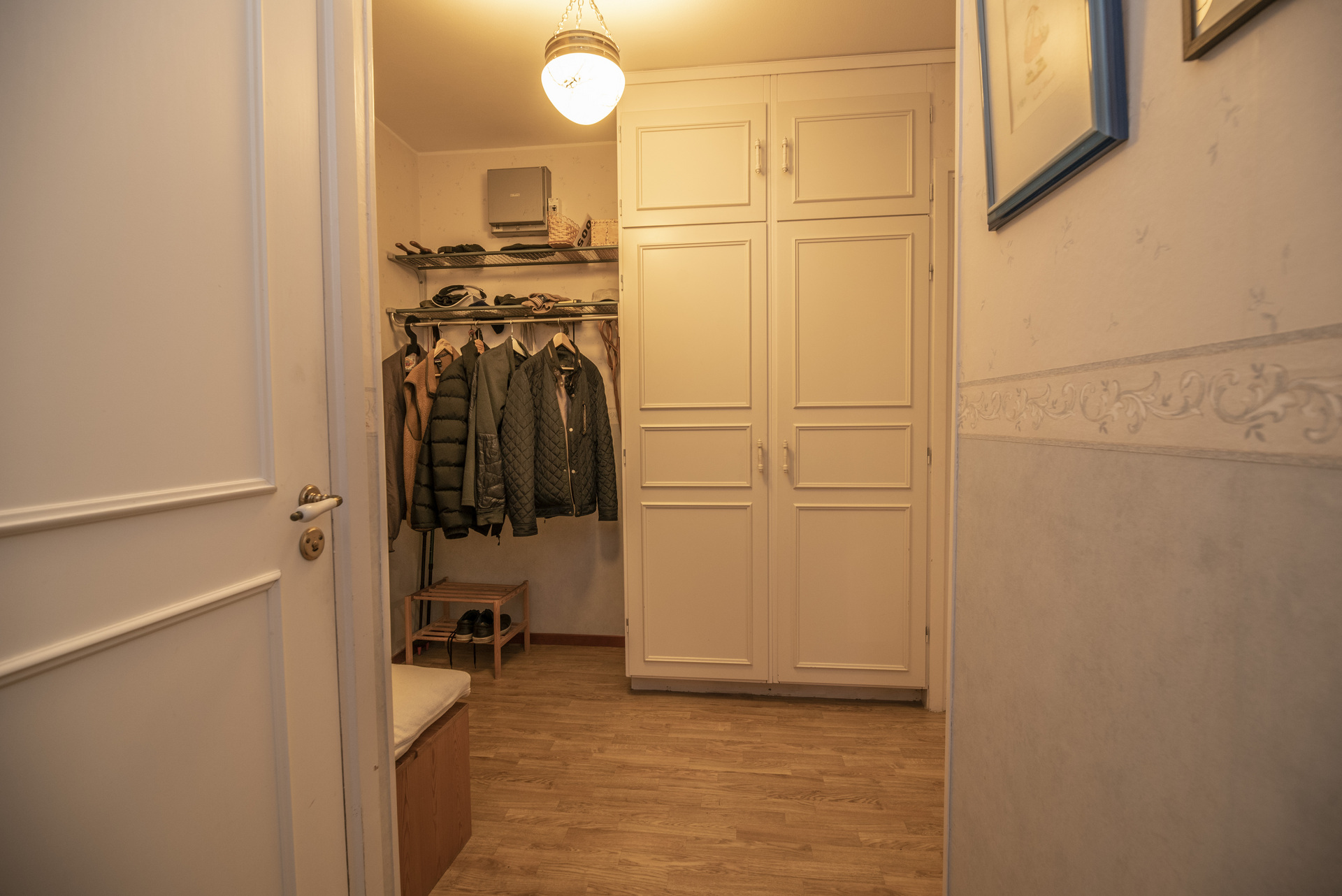 Entré till möblerbar hall i vinkel med klädförvaring & garderober.