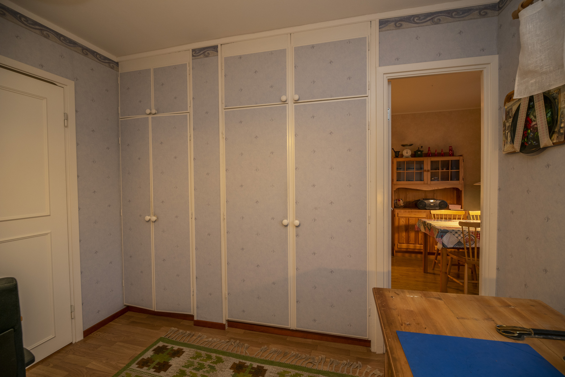 Sovrum 3/ Arbetsrum - garderober, matplats i bakgrunden