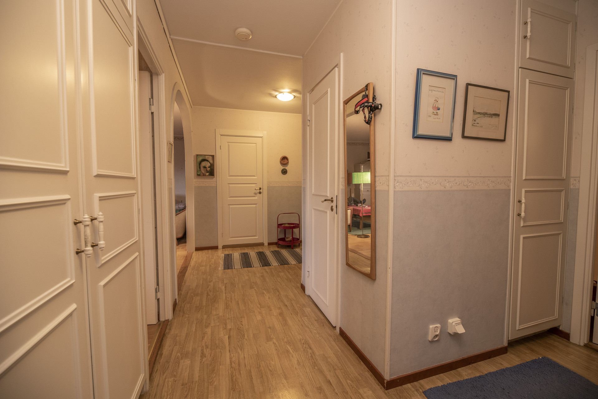 Hall i vinkel - sett från entré, förbi garderober Sovrum 1 & mittemot klädkammare (vid spegeln)